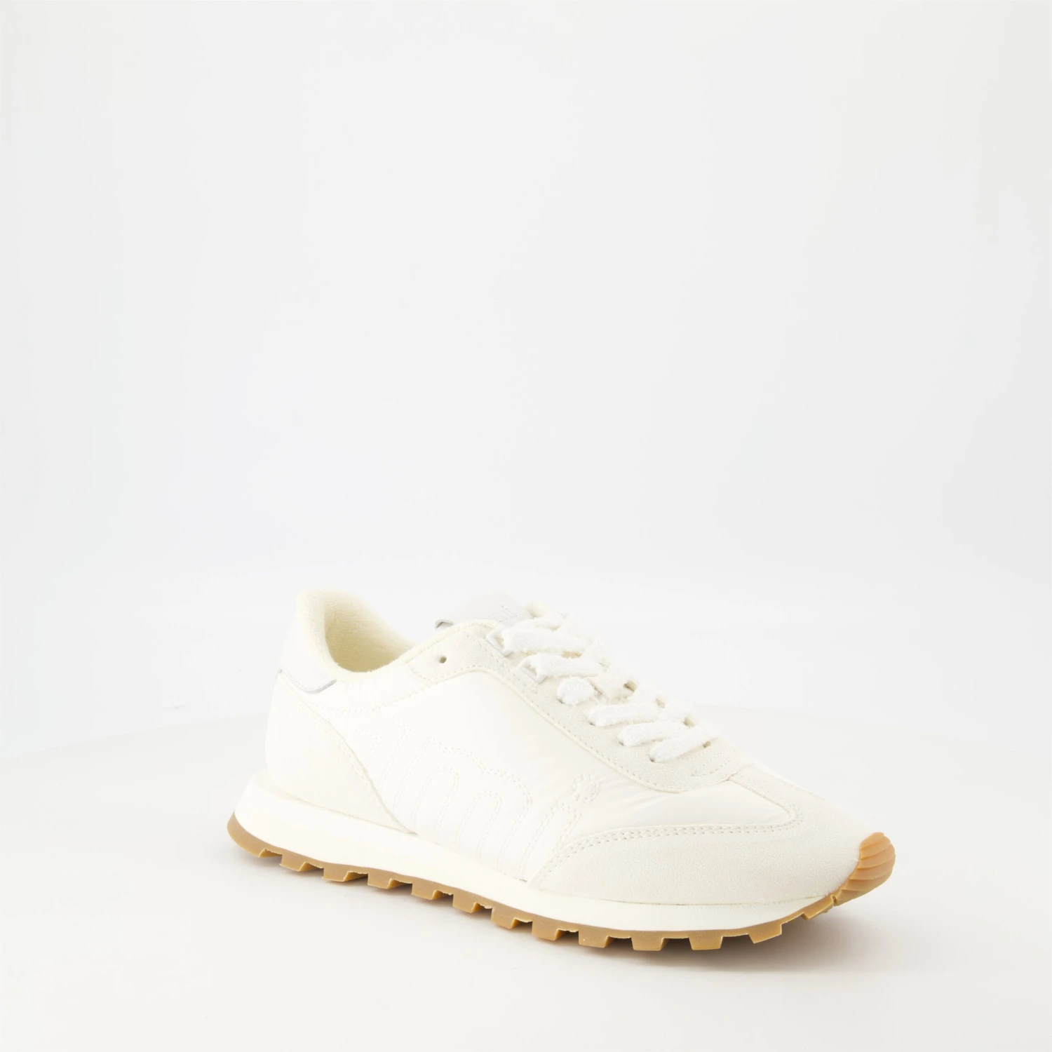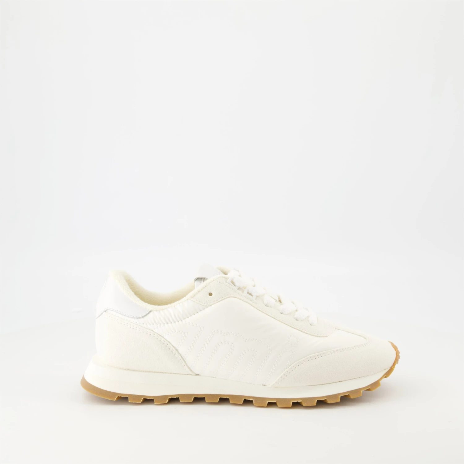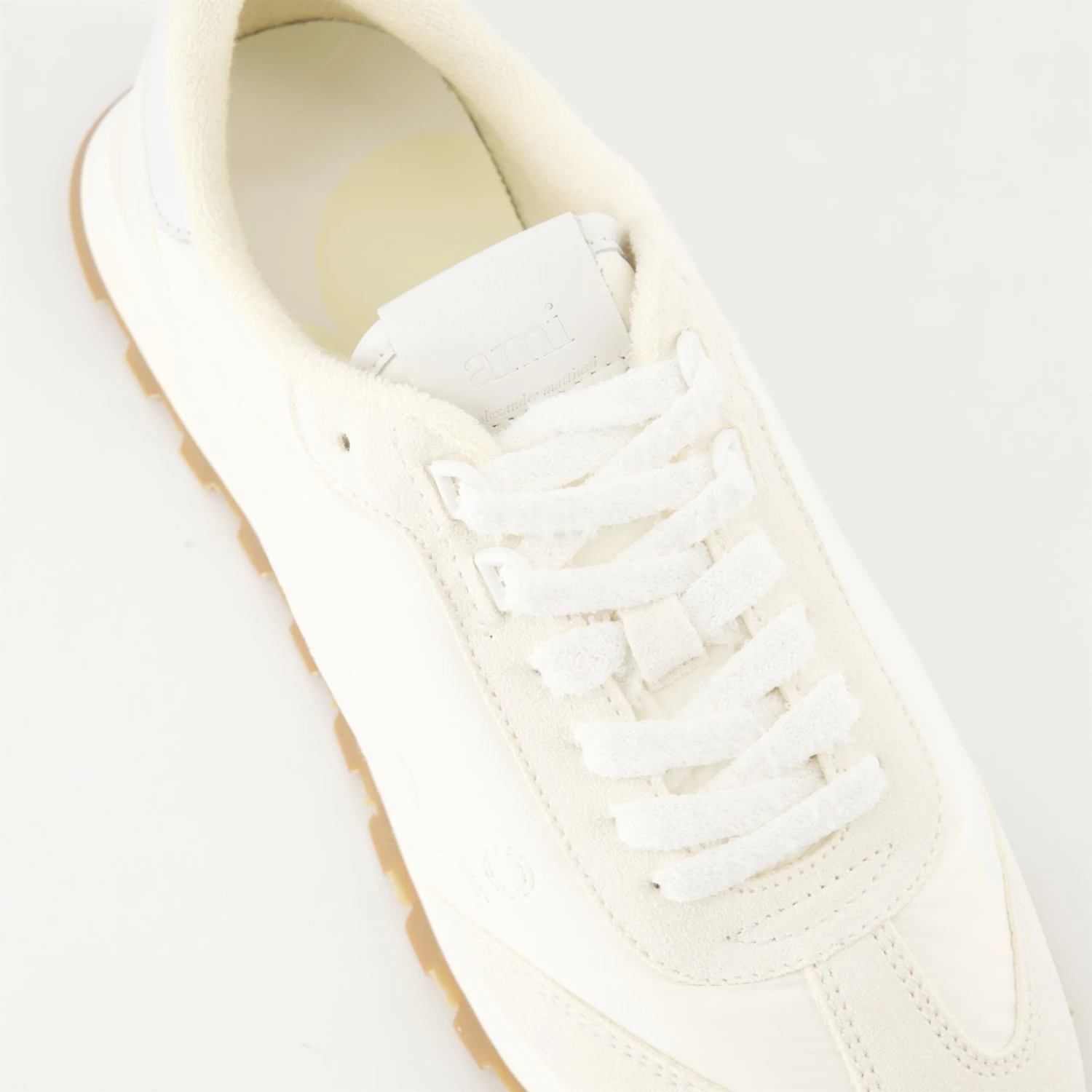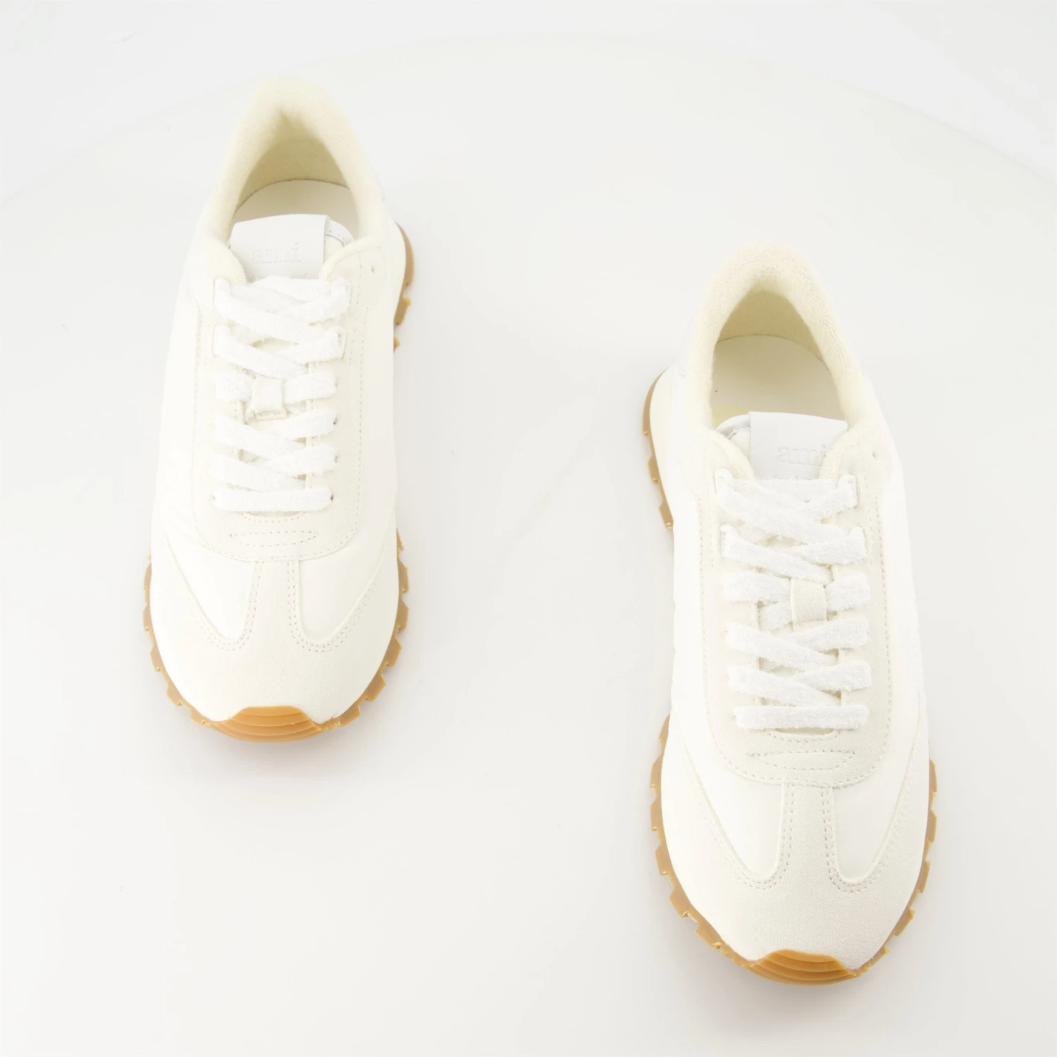 Les Baskets AMI New Rush blanches de la marque AMI Paris sont un modèle unisexe réalisé en cuir et suède. Elles font partie de la collection Printemps-Été 2025.