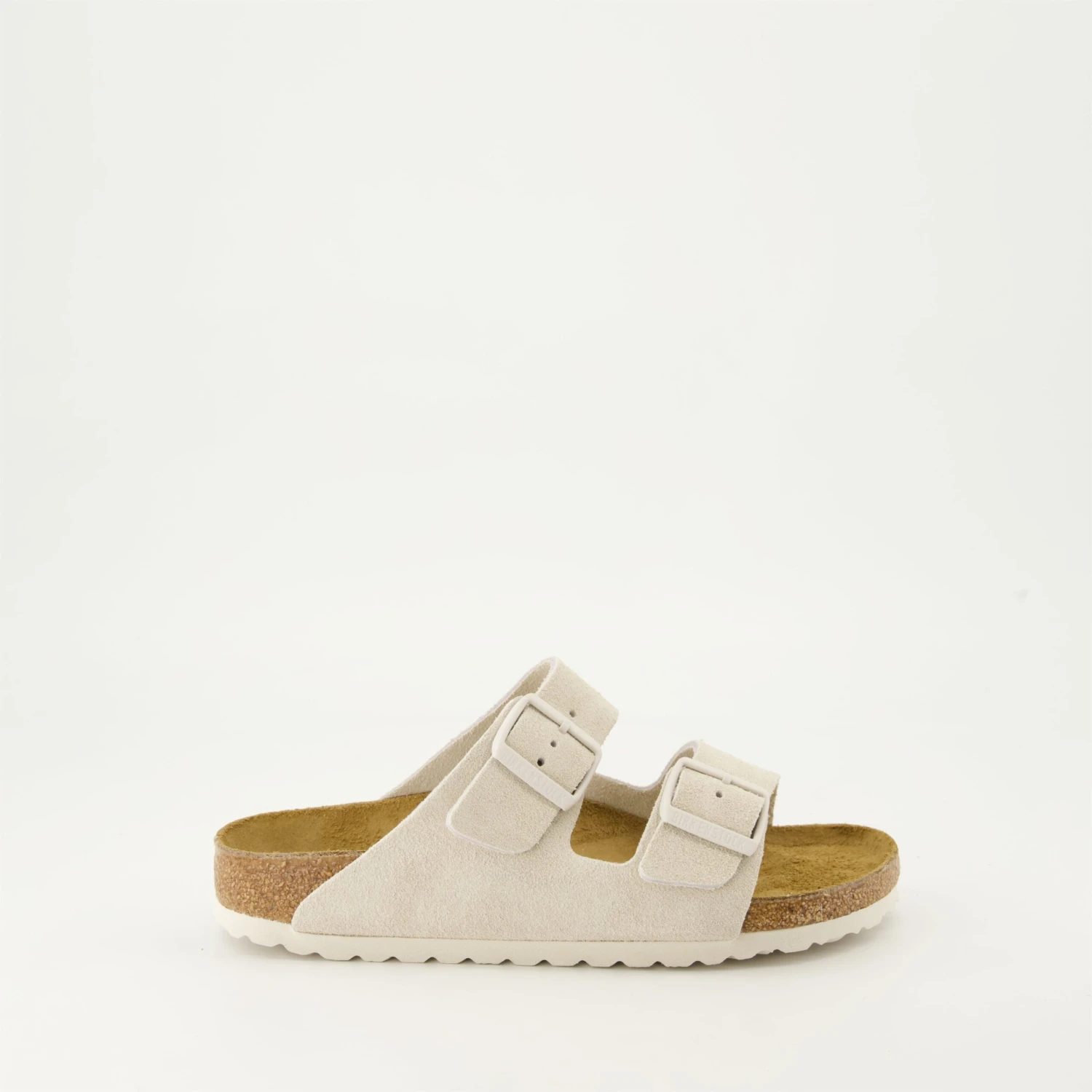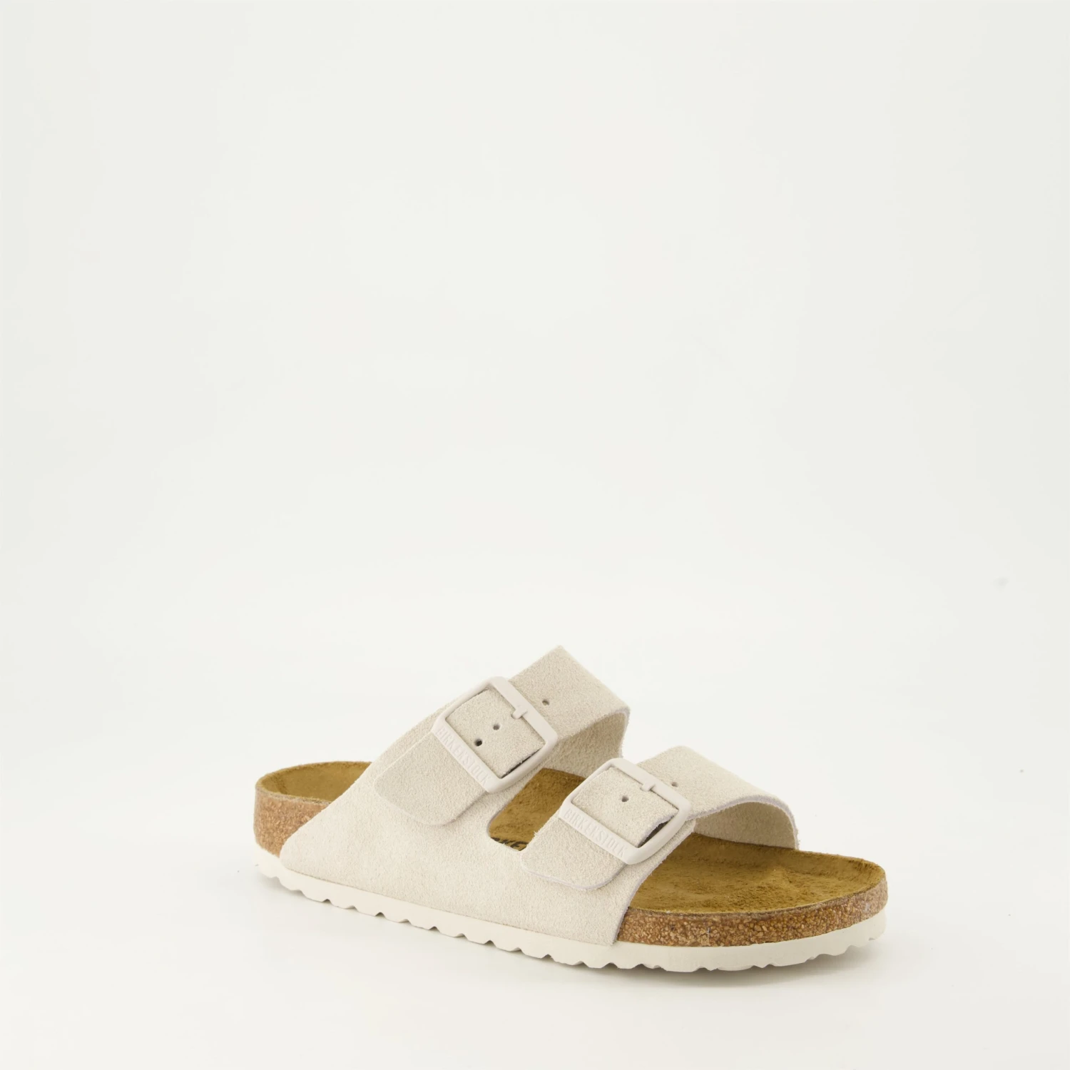 Claquettes Arizona Birkenstock collection Automne-Hiver 2024 pour Femme. Réalisé en cuir velours. Article Couleur beige. Bout ouvert arrondi et Semelle moulée confortable.