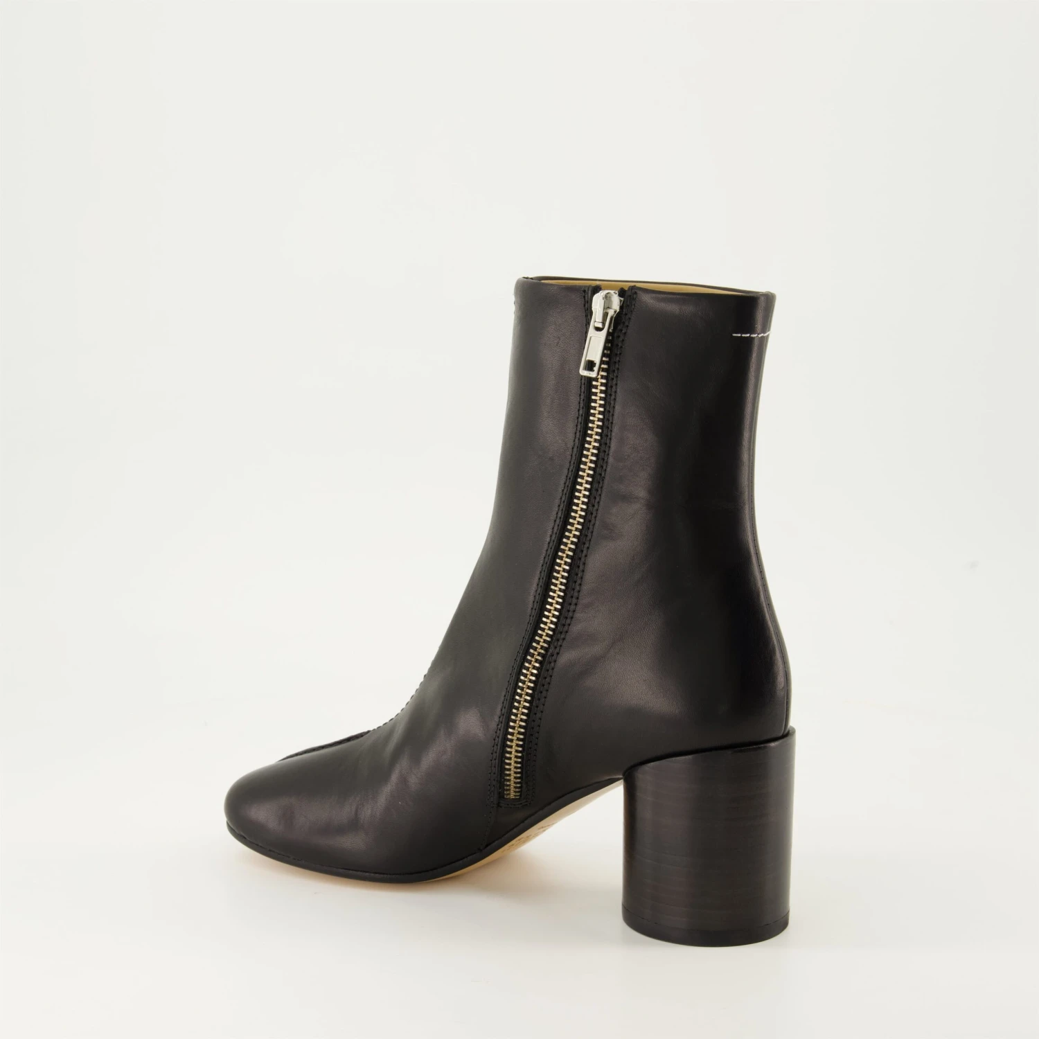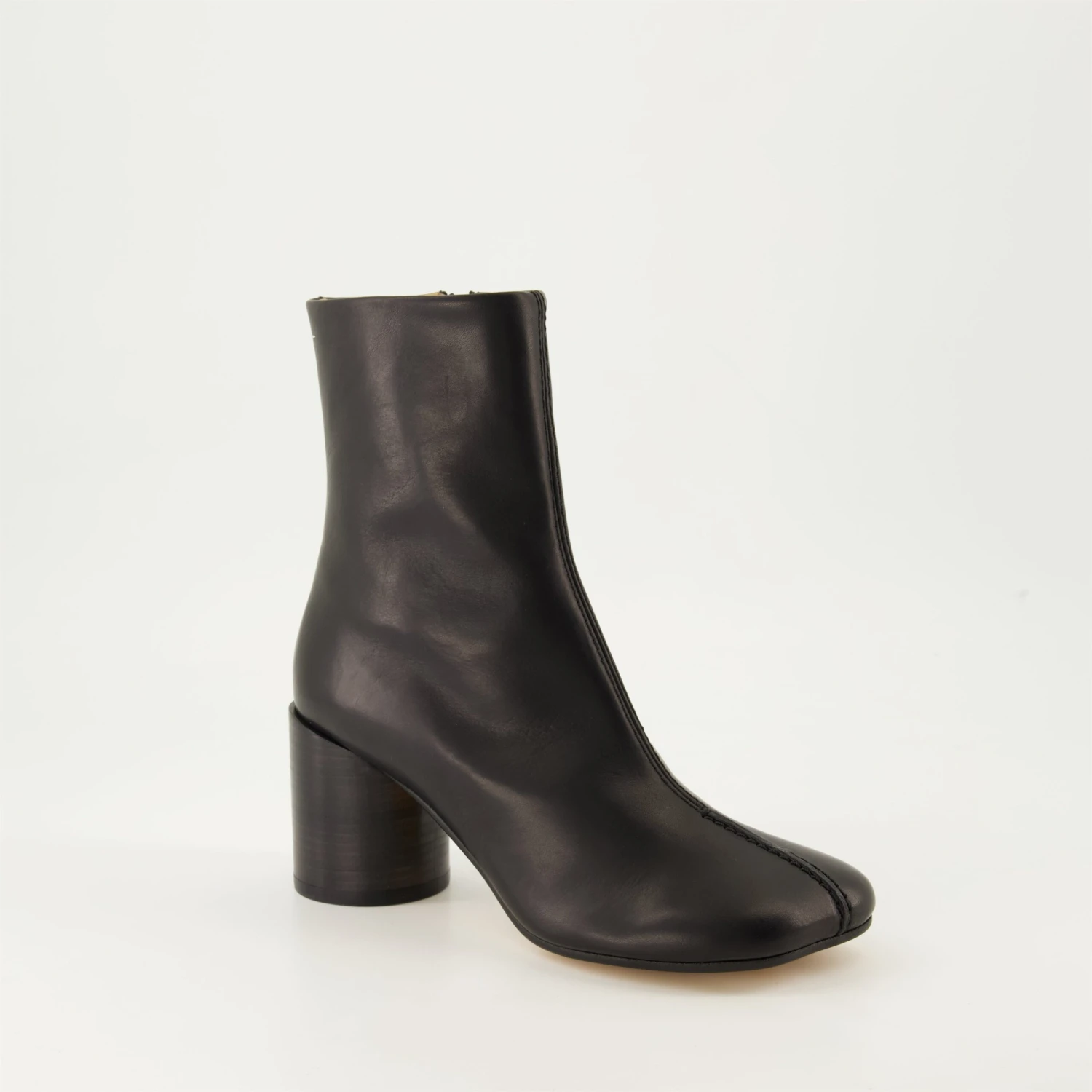 Bottines en cuir Stitch-Out MM6 collection Automne-Hiver 2024 pour Femme. Réalisé en cuir brillant. Article Couleur noir. Bout arrondi et Semelle en cuir.