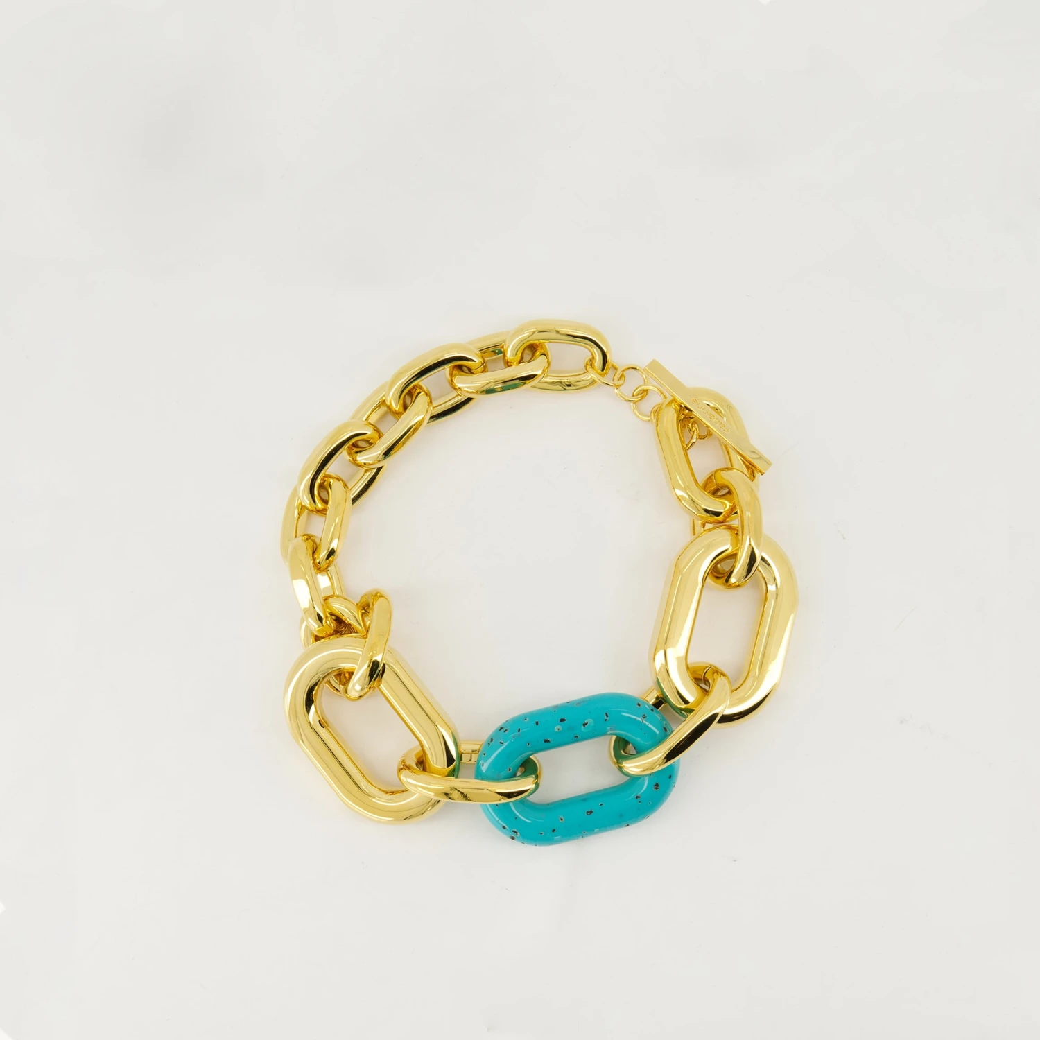 Collier XL Link Palm Springs doré et turquoise de la marque Rabanne, conçu pour les femmes. Il fait partie de la collection Printemps-Été 2025 et est réalisé en laiton avec des finitions en résine bleue turquoise.
