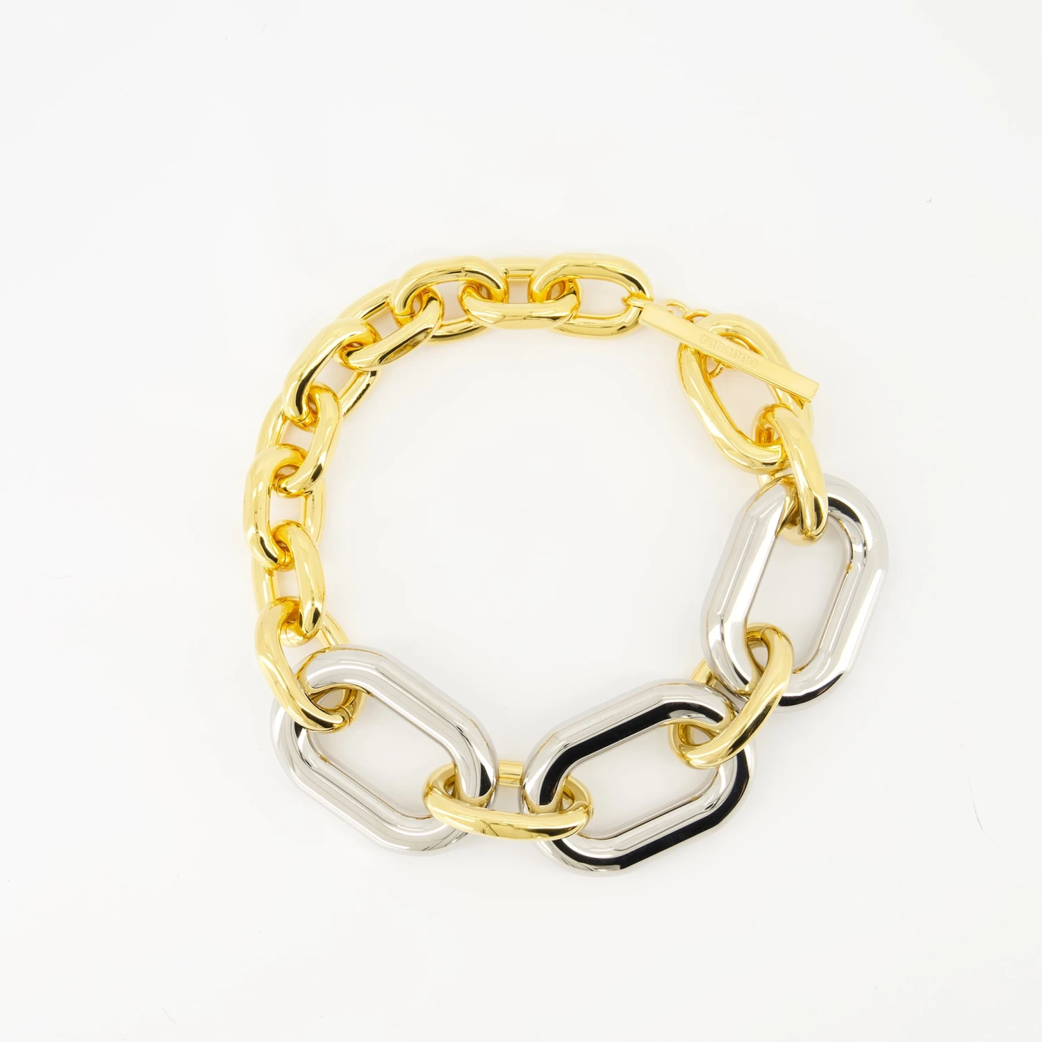 Le collier XL Link de Rabanne est un accessoire élégant en aluminium, conçu pour les femmes. Il fait partie de la collection Printemps-Été 2025, avec une finition dorée et argentée.