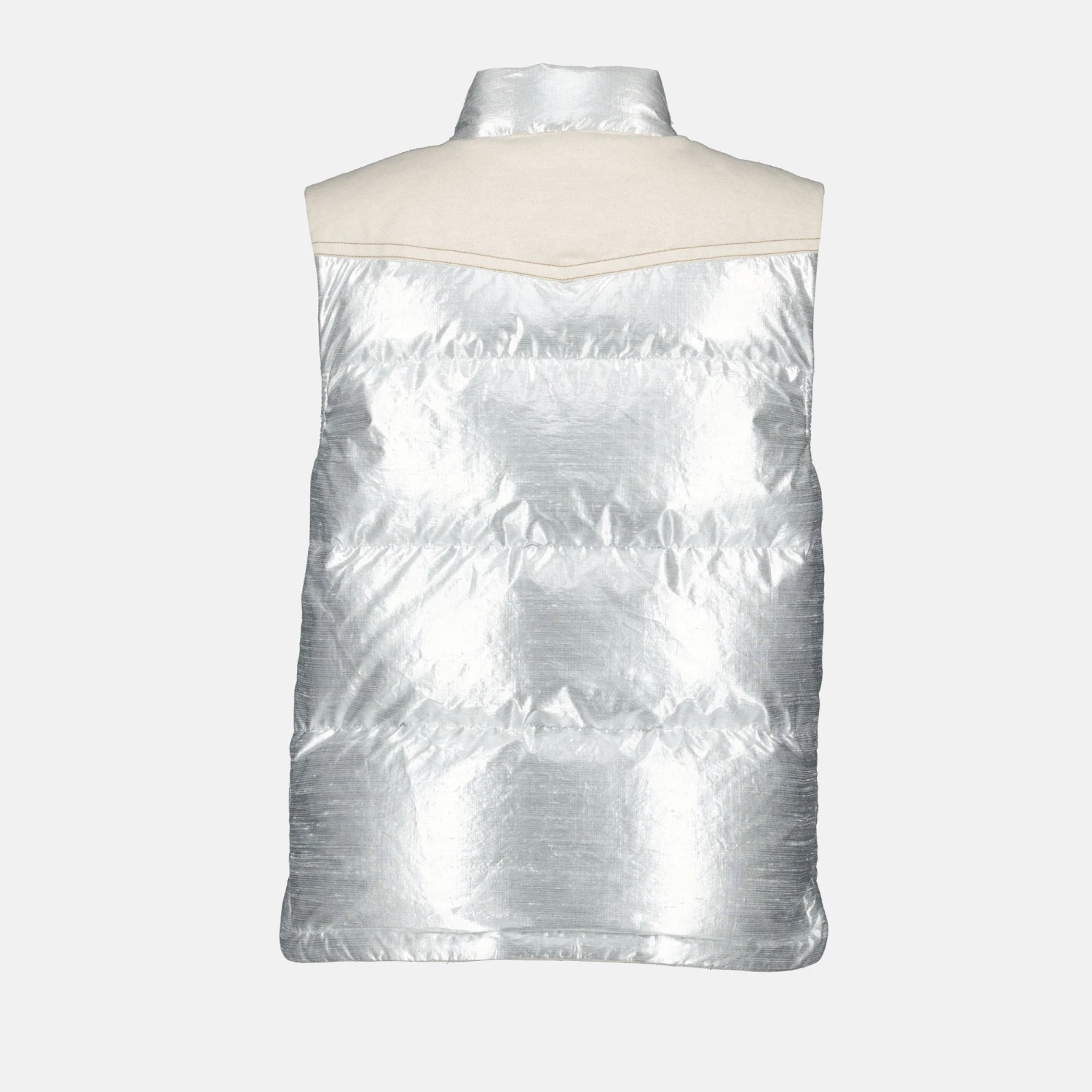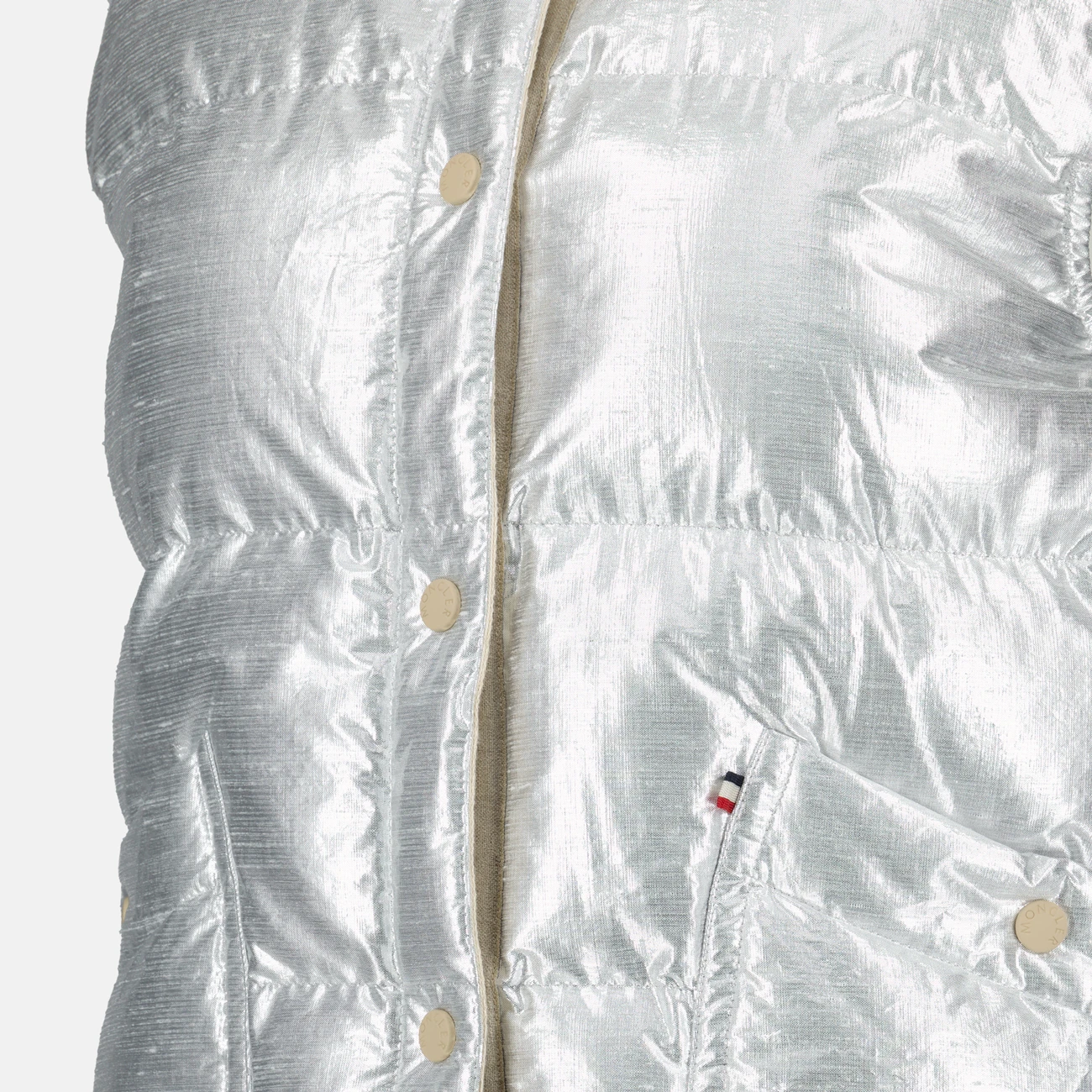 La doudoune sans manches Pinchot en lamé de Moncler Grenoble est un vêtement pour femme de la collection Printemps-Été 2025. Elle allie style moderne et confort avec son rembourrage en duvet et son design imperméable.