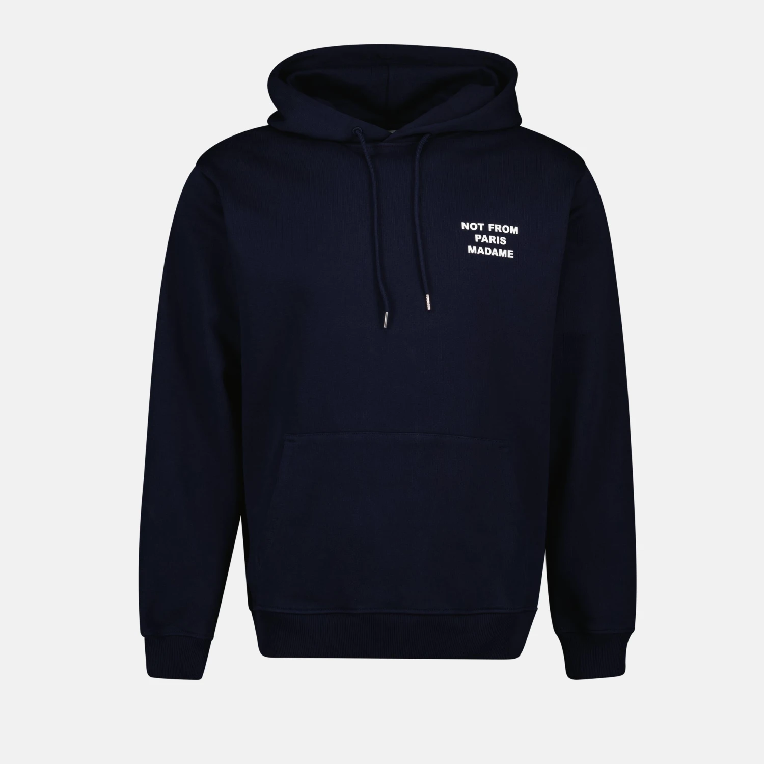 Sweat à capuche Slogan bleu marine de la marque Drôle de Monsieur, conçu pour homme, fait en coton piqué. Ce modèle fait partie de la collection Printemps-Été 2025.