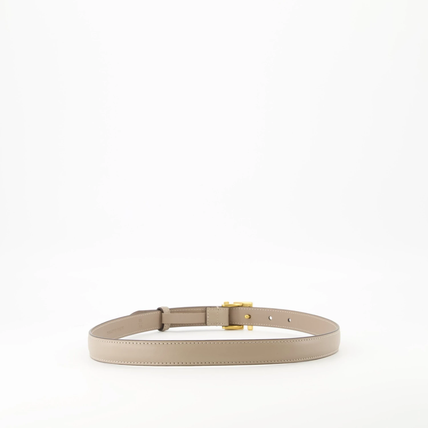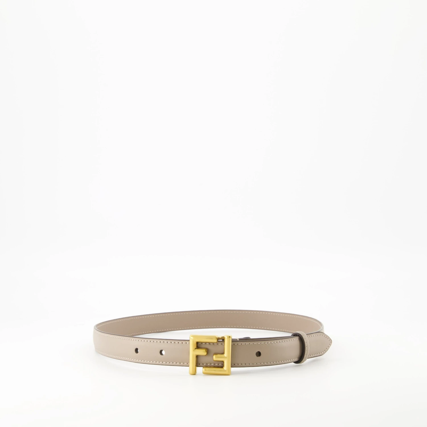 Ceinture FF beige de Fendi, réalisée en cuir de veau lisse avec garnitures en métal doré vintage. Cet accessoire femme fait partie de la collection Printemps-Été 2025.