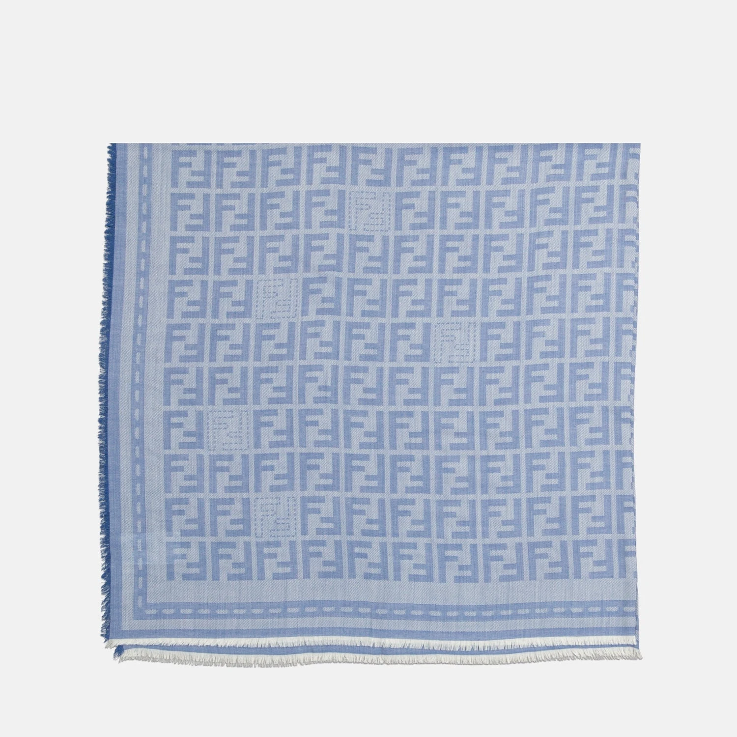 Châle FF bleu de Fendi pour femme, réalisé en laine avec un imprimé FF sur l’ensemble et des bords frangés. Ce modèle fait partie de la collection Printemps-Été 2025.