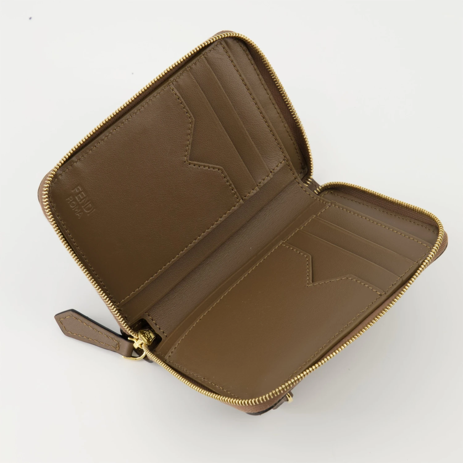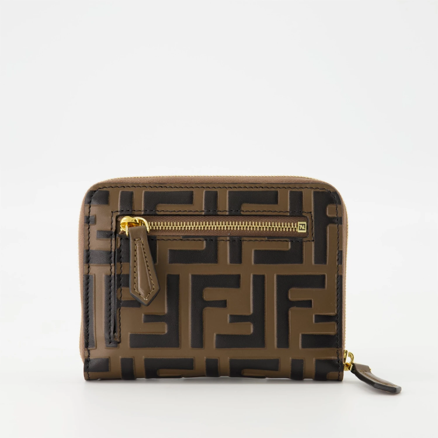 Portefeuille zippé FF Diamonds marron de Fendi pour femme. Il fait partie de la collection Printemps-Été 2025 et est réalisé en cuir de veau avec un imprimé FF noir en relief.