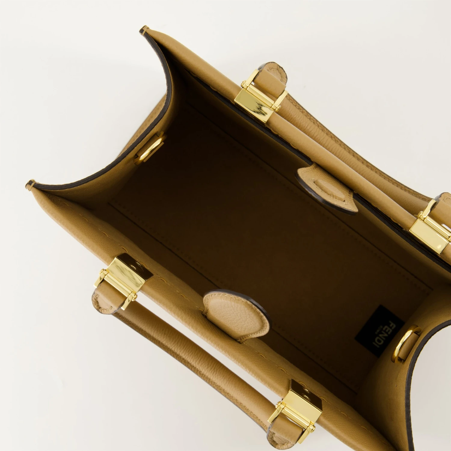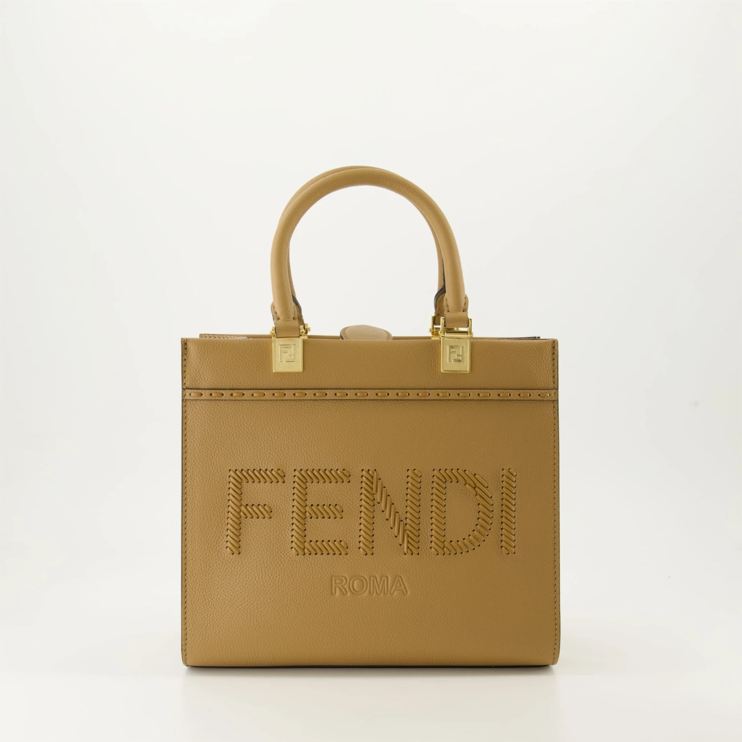 Le Petit cabas Sunshine marron de Fendi est un sac pour femme de la collection Automne-Hiver 2024. Il est conçu en cuir de veau lisse avec des finitions dorées élégantes.