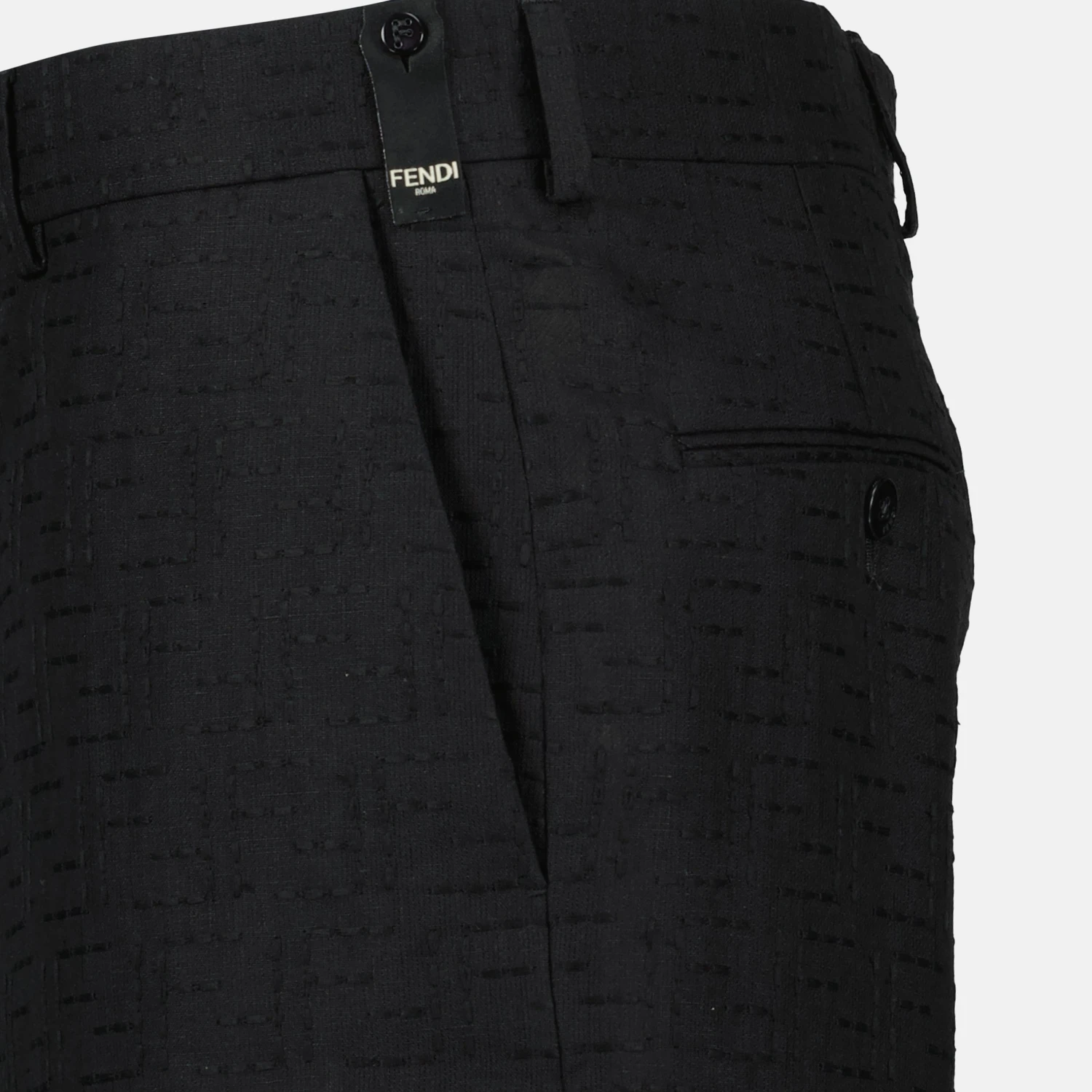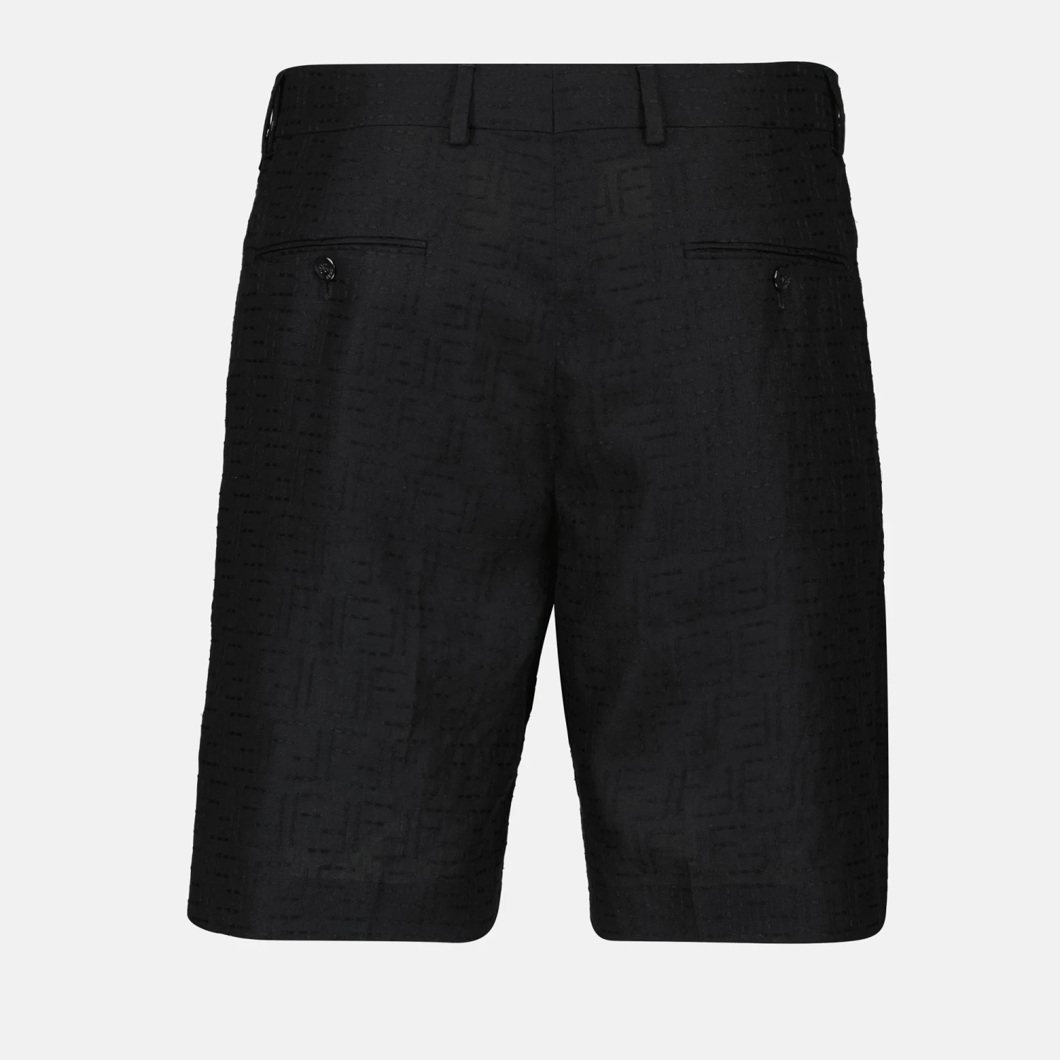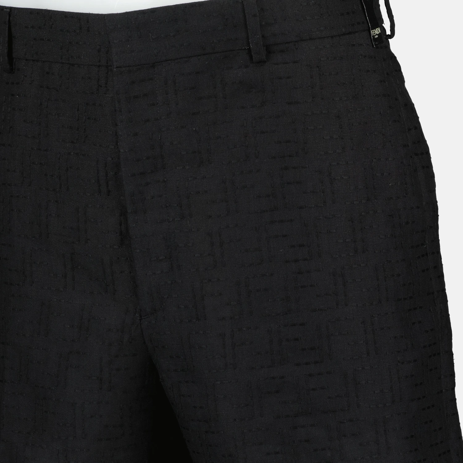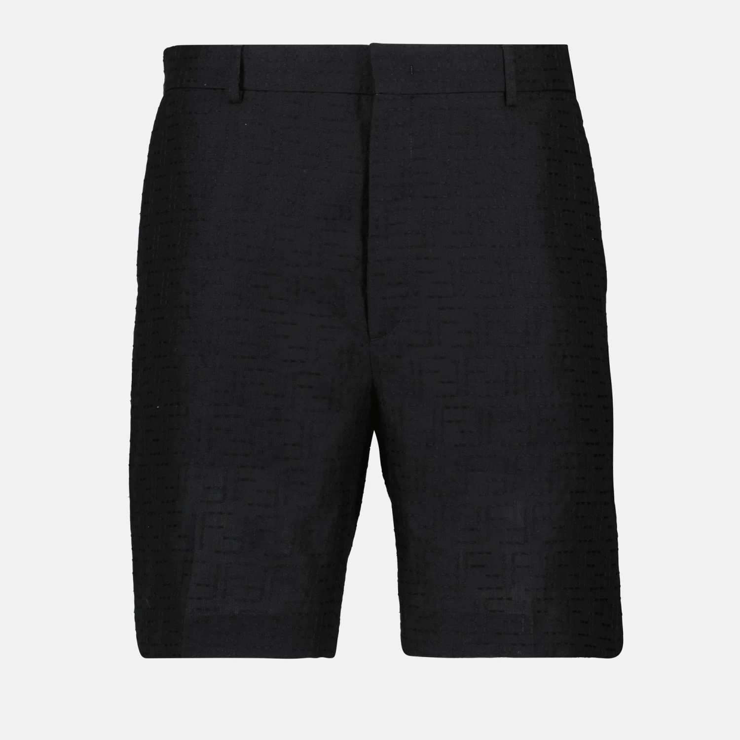 Short en lin FF noir de Fendi pour homme, issu de la collection Printemps-Été 2025. Confectionné en molleton de coton et lin, il présente un logo imprimé et des poches plaquées.