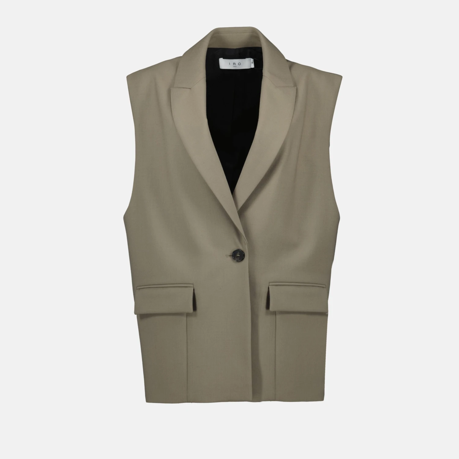 Le blazer sans manches beige Cynesa de la marque Iro est un vêtement féminin de la collection Printemps-Été 2025. Il présente une coupe oversize en polyester et laine avec plusieurs couleurs disponibles.