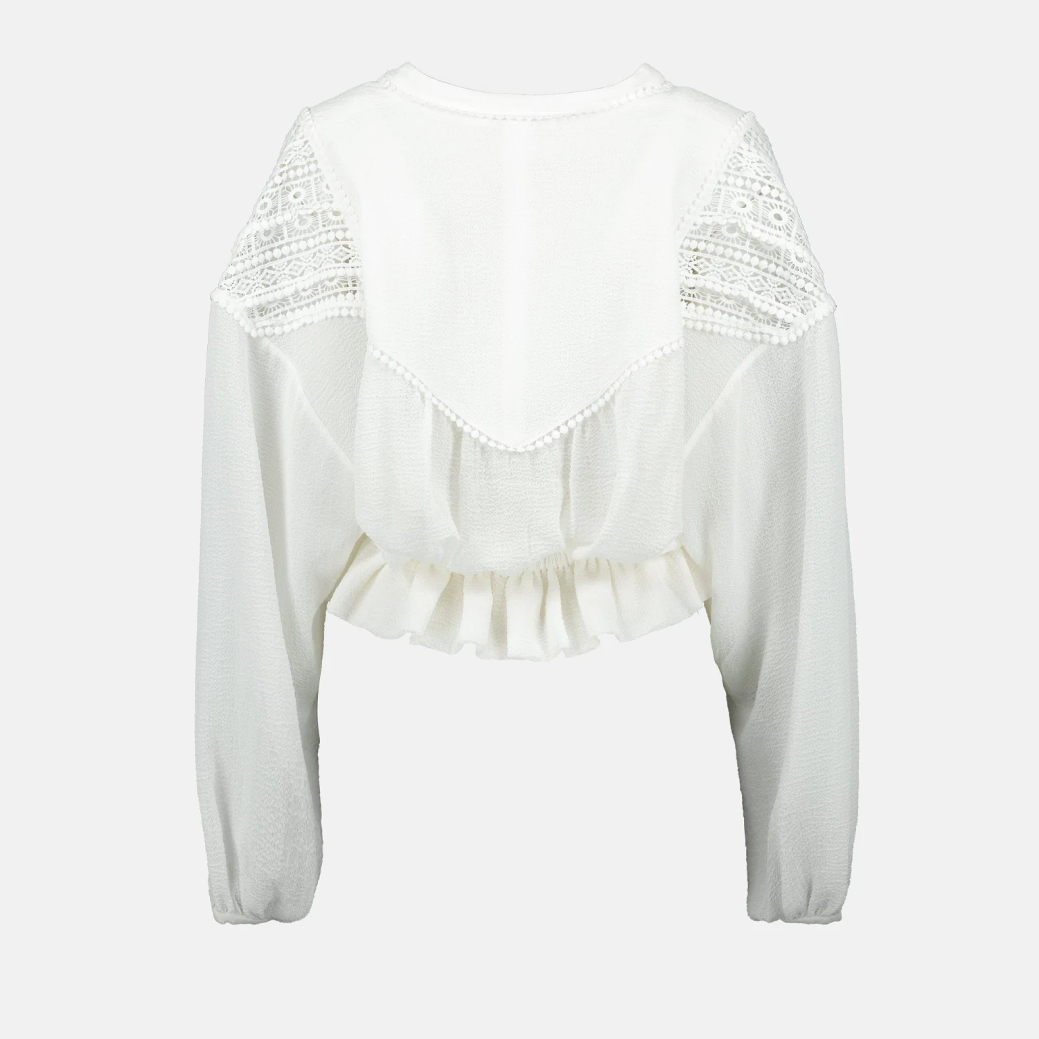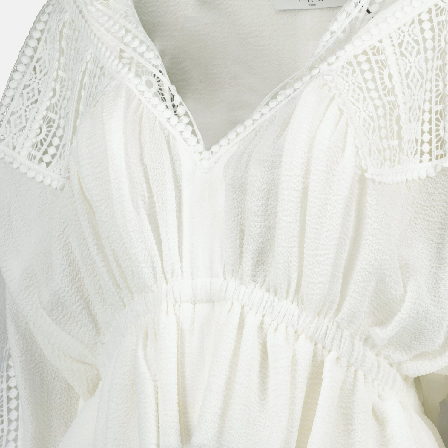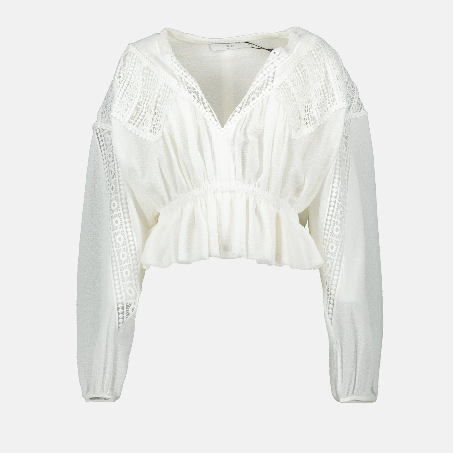 La blouse Rixi blanche de la marque Iro est une pièce féminine de la collection Printemps-Été 2025. Elle présente un col en V, des manches bouffantes et des détails brodés.