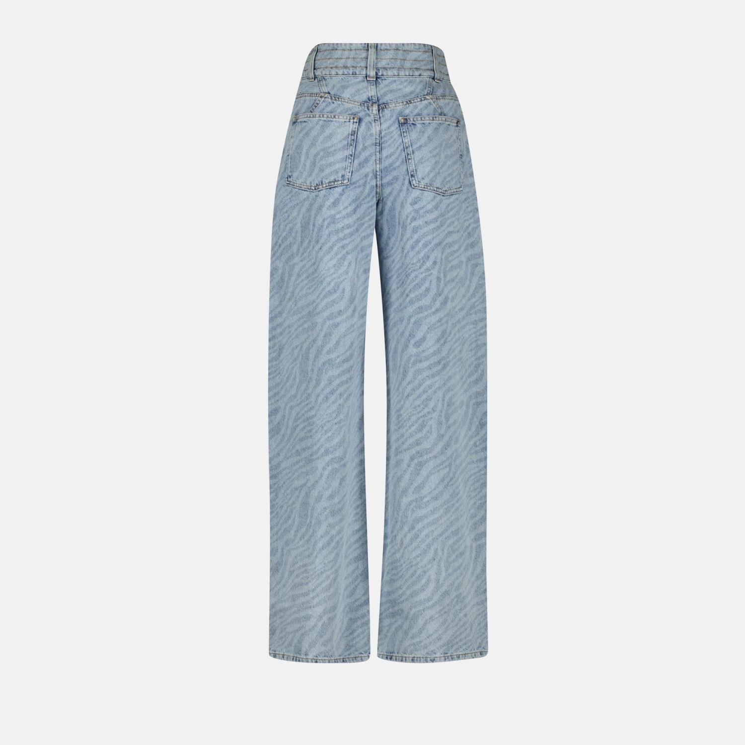 Jean large zébré de la marque Iro pour femme, issu de la collection Printemps-Été 2025. Ce modèle en coton présente un imprimé zébré bleu clair et une taille haute.