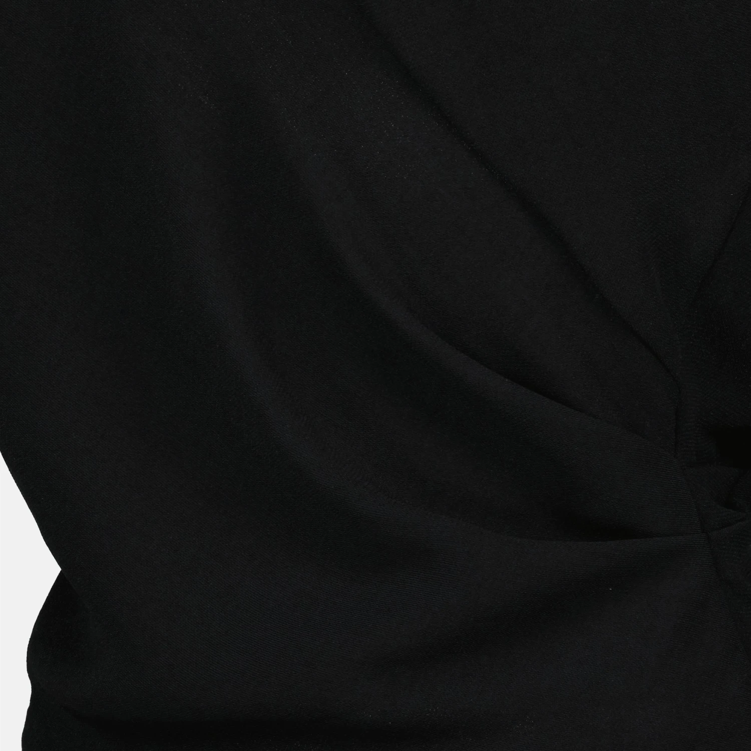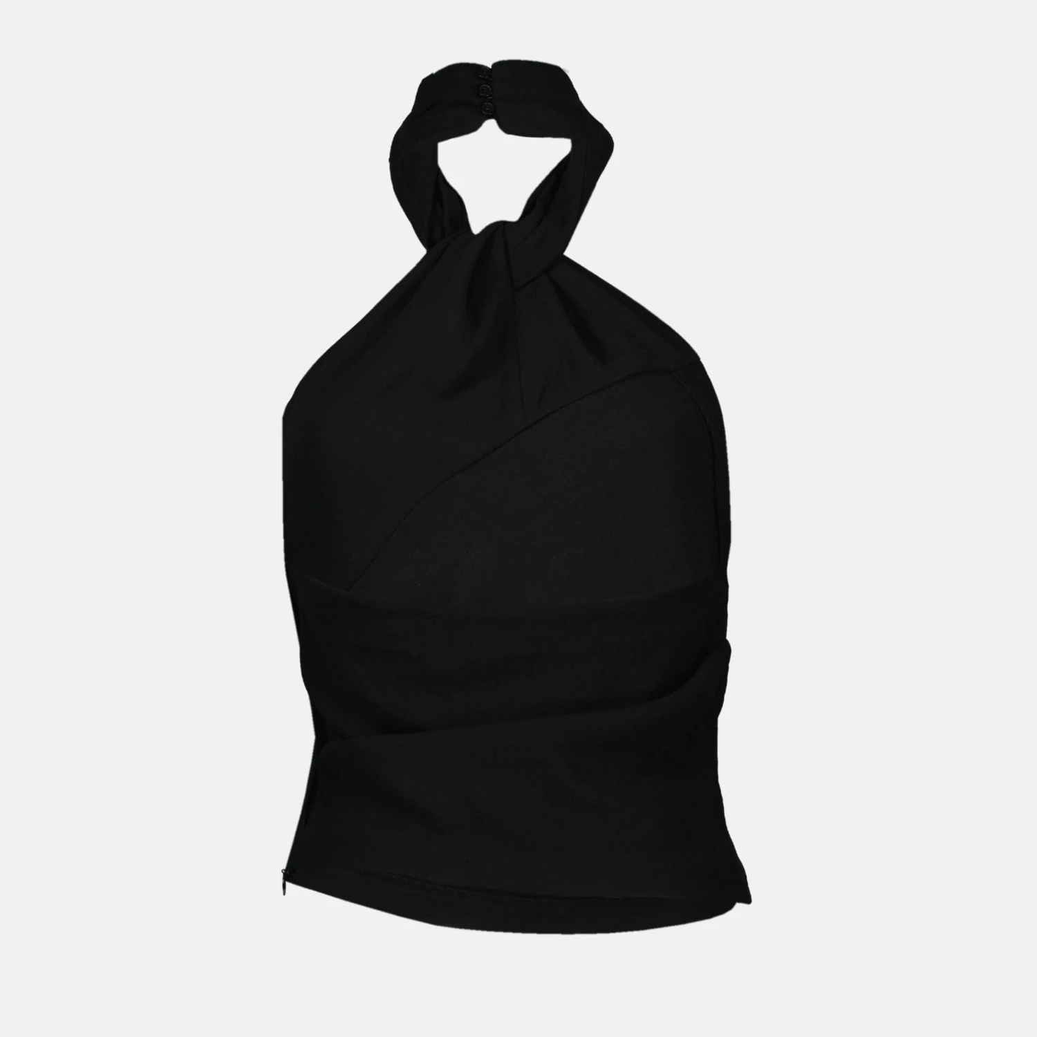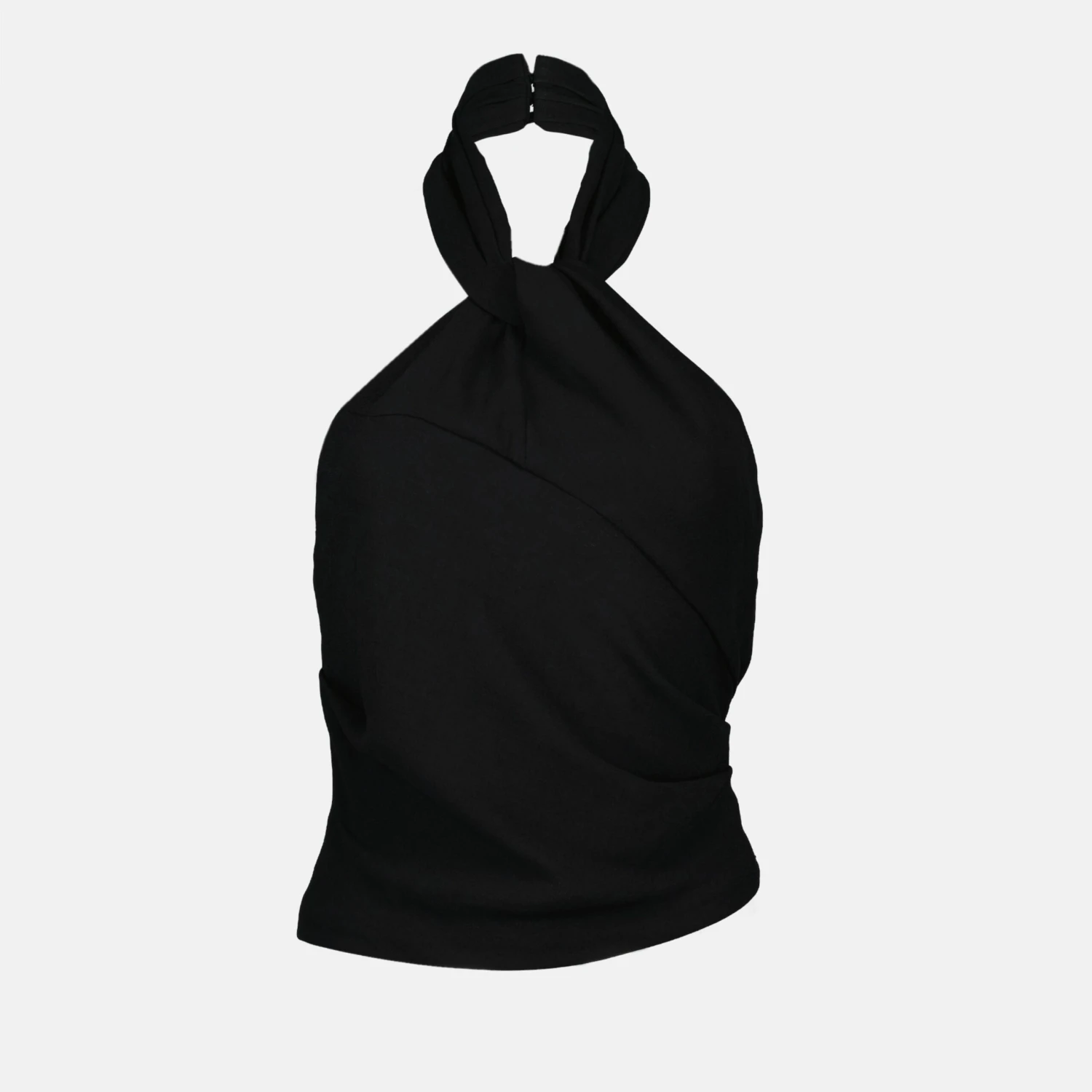 Le top drapé Birda noir d’Iro est un vêtement féminin de la collection Printemps-Été 2025. Il présente un design sans manches avec un dos nu et une coupe ajustée.