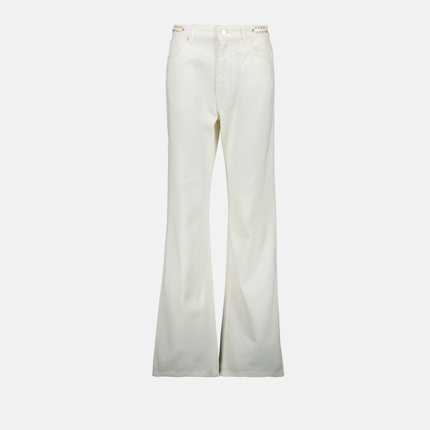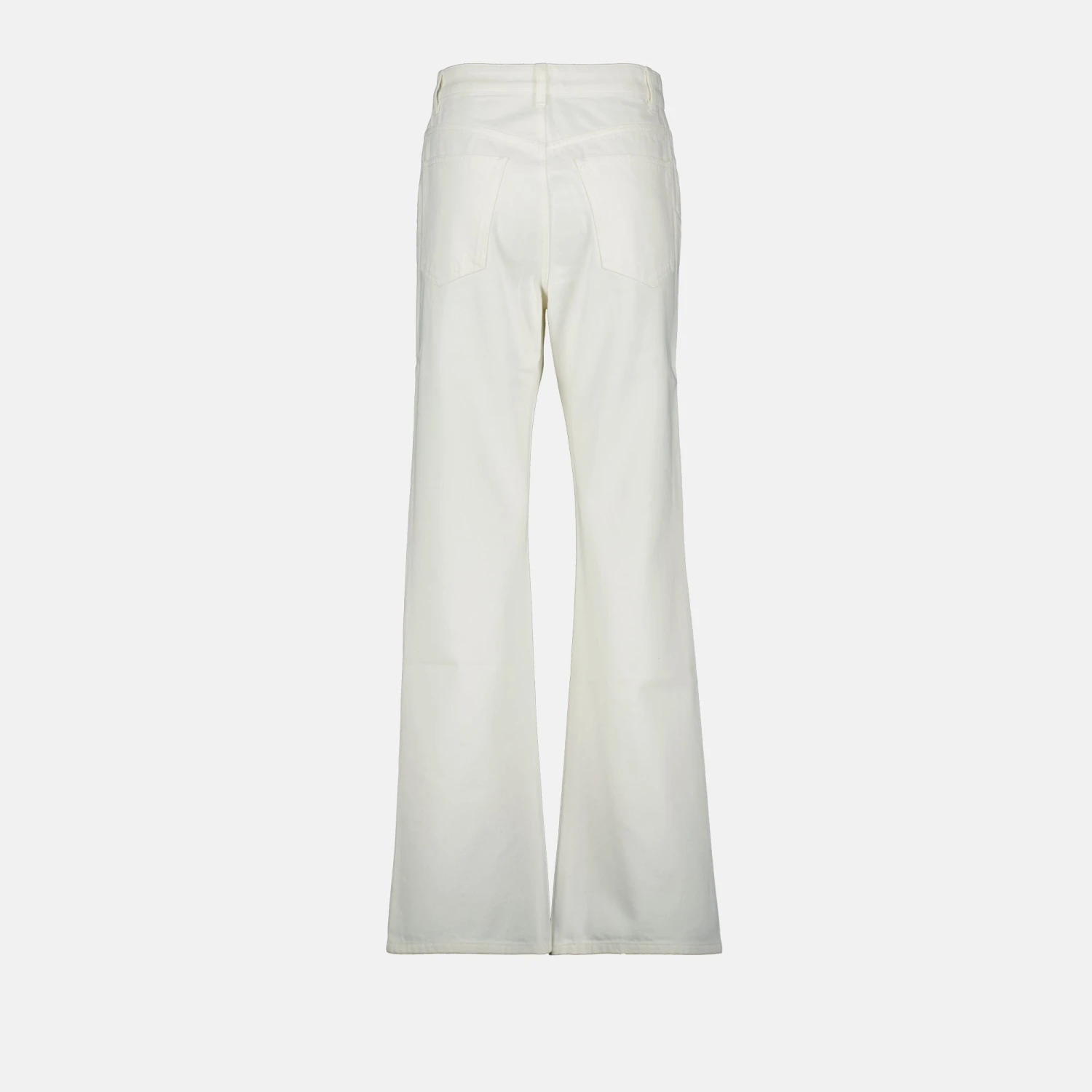 Jean signature 1969 blanc cassé de la marque Rabanne, conçu pour les femmes. Ce modèle fait partie de la collection Printemps-Été 2025 et est réalisé en coton avec une coupe droite.