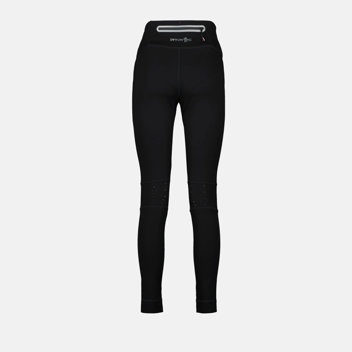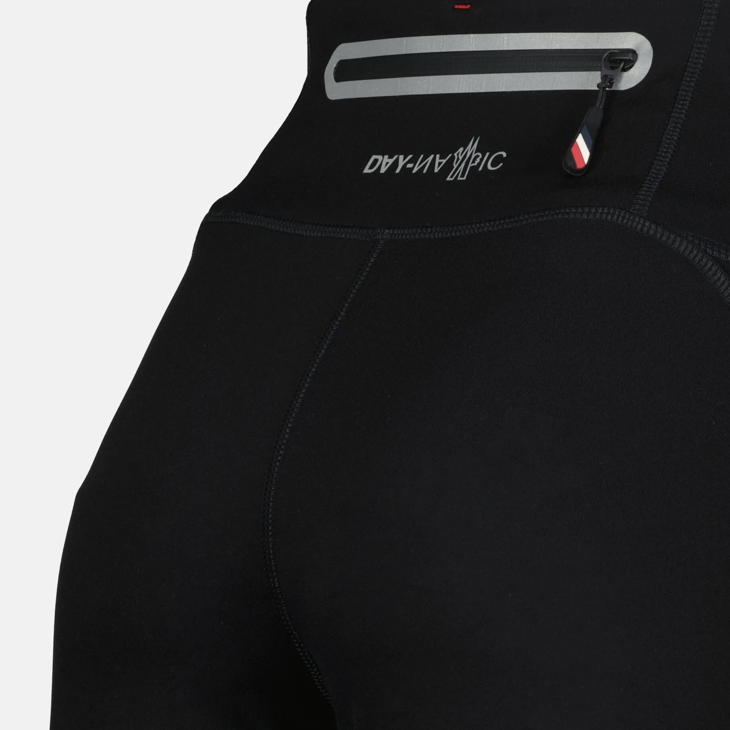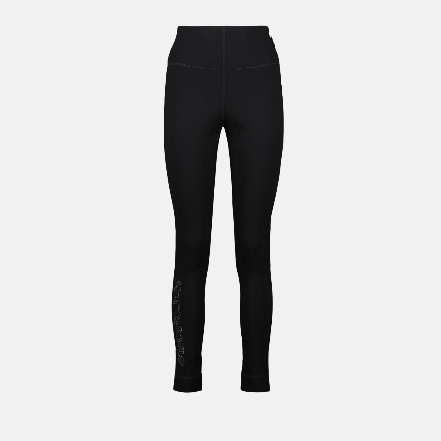 Legging en nylon noir de Moncler Grenoble pour femme, issus de la collection Automne-Hiver 2024. Ils présentent une coupe slim, un logo imprimé et des détails réfléchissants.
