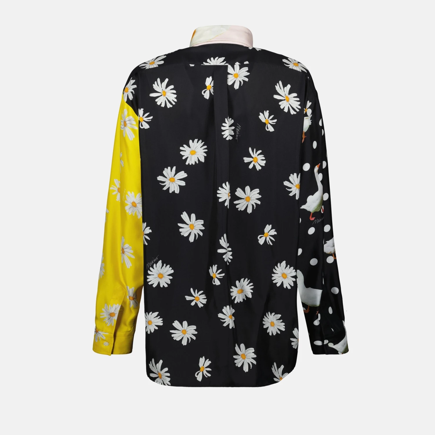 Chemise imprimée en soie Moschino pour femme de la collection Printemps-Été 2025. Elle présente un col classique, des manches longues et un imprimé multicolore d’œufs et de fleurs.