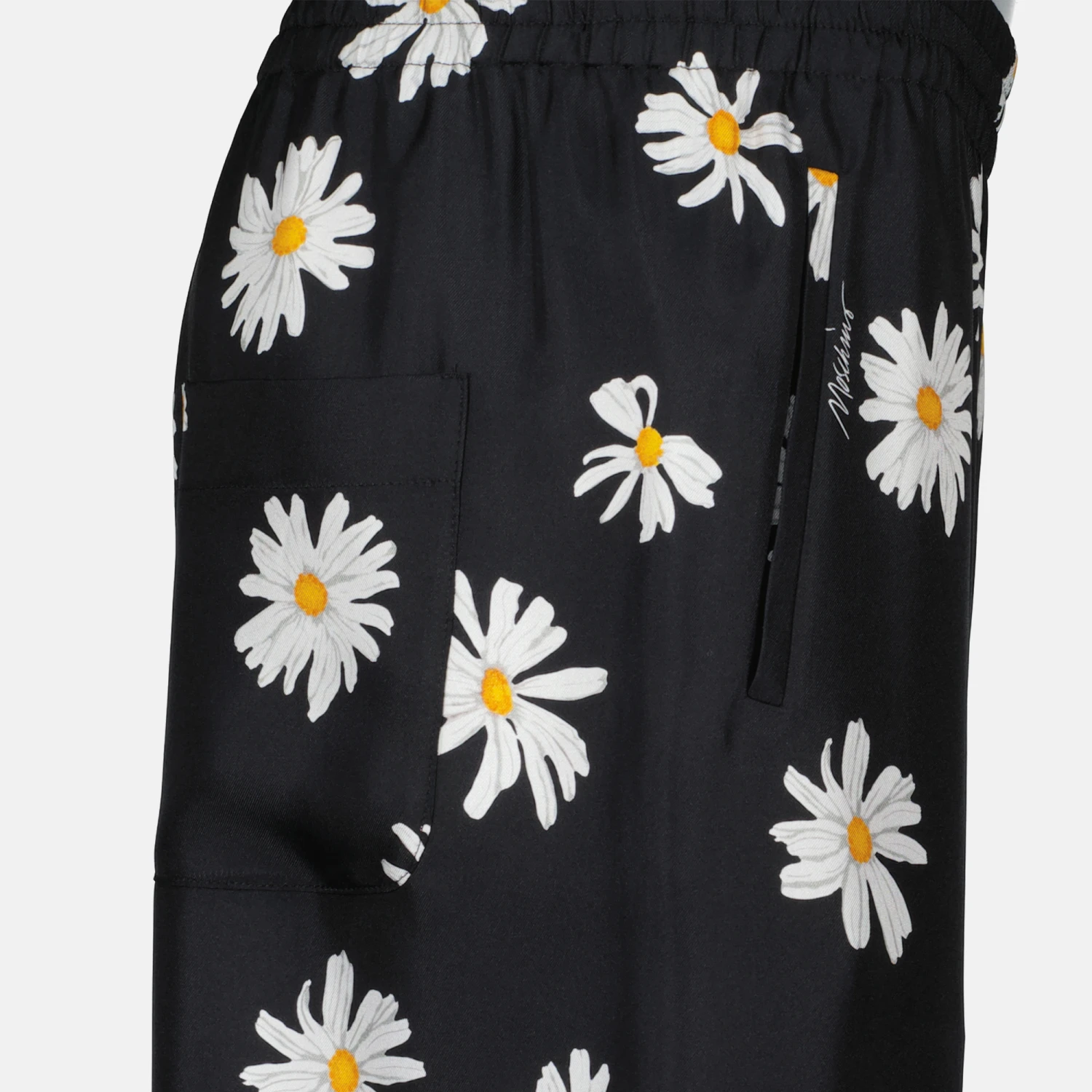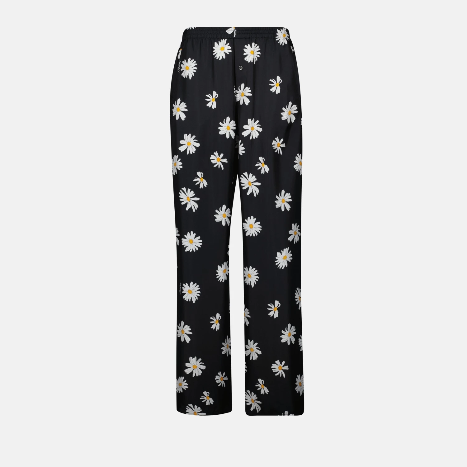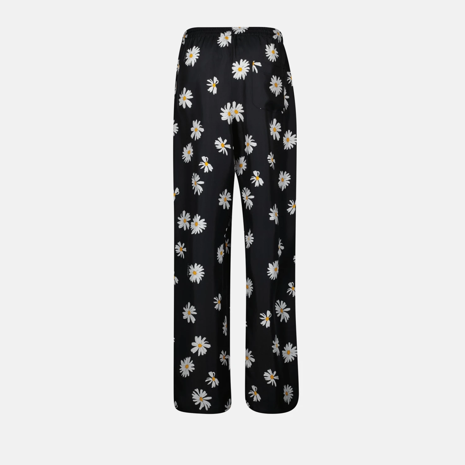 Pantalon en soie noire à fleurs de Moschino pour femme. Faisant partie de la collection Printemps-Été 2025, il présente une coupe droite et un imprimé marguerites.