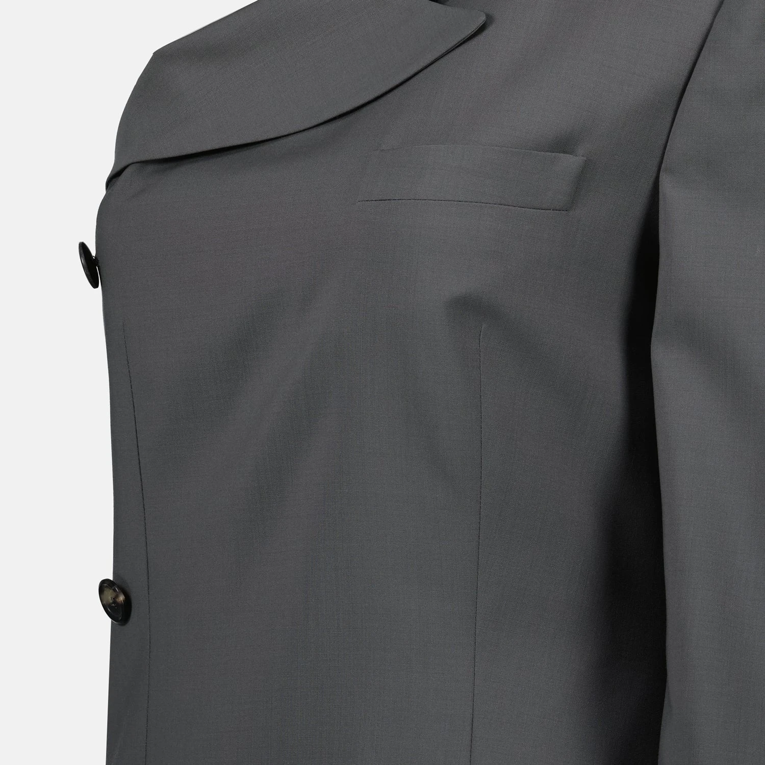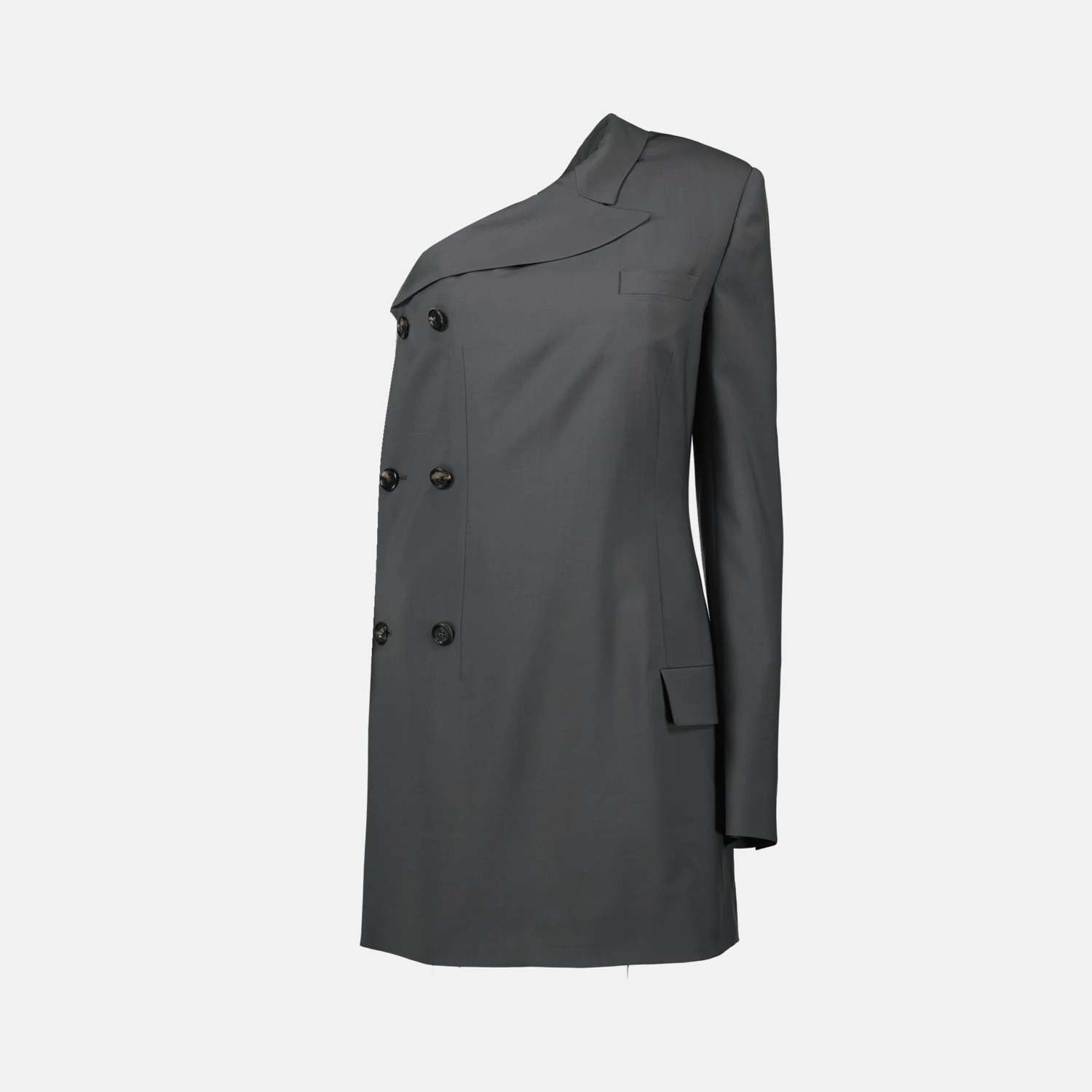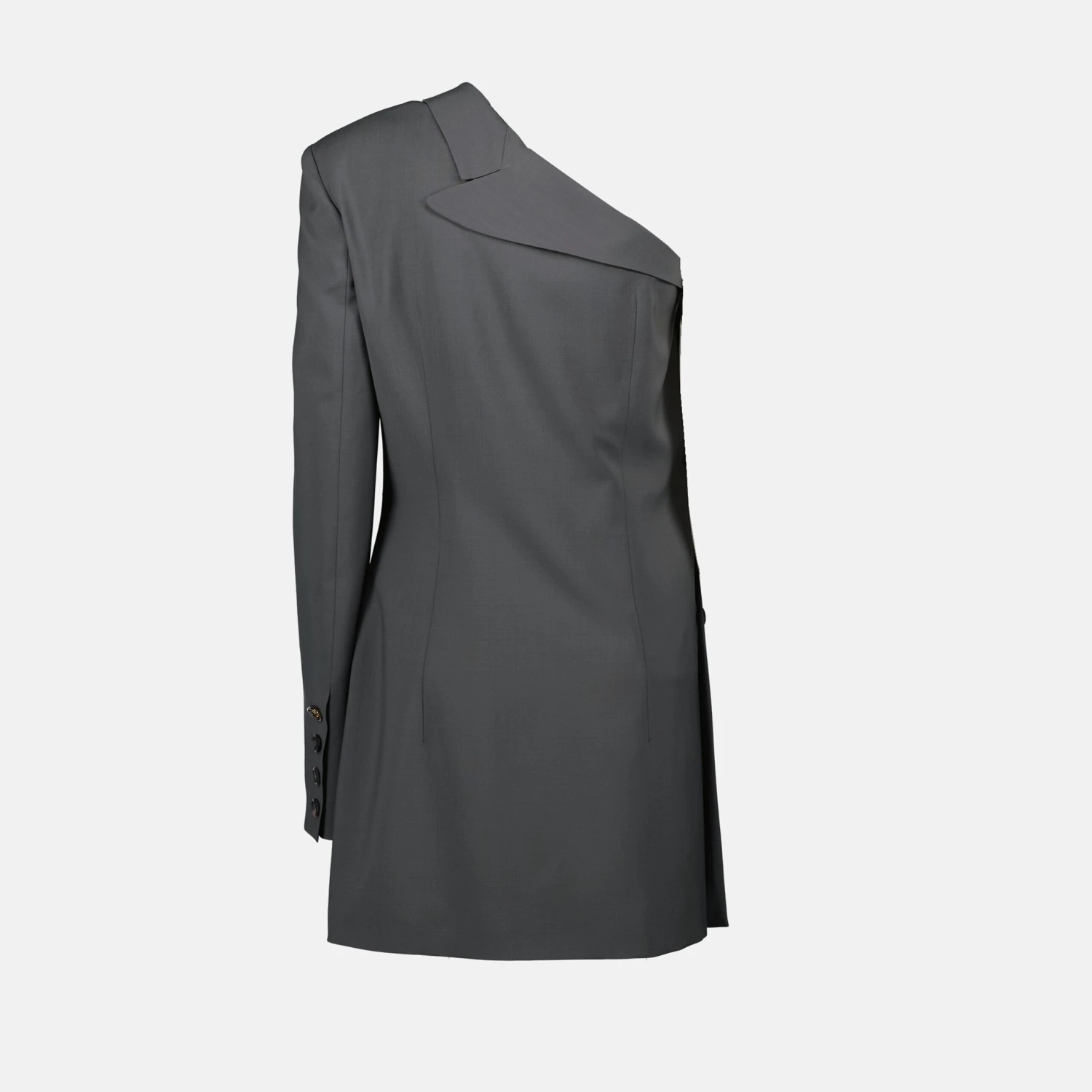 Robe blazer asymétrique grise de Moschino pour femme, réalisée en laine. Cette pièce fait partie de la collection Printemps-Été 2025 et présente un design asymétrique à une manche et un décolleté original.