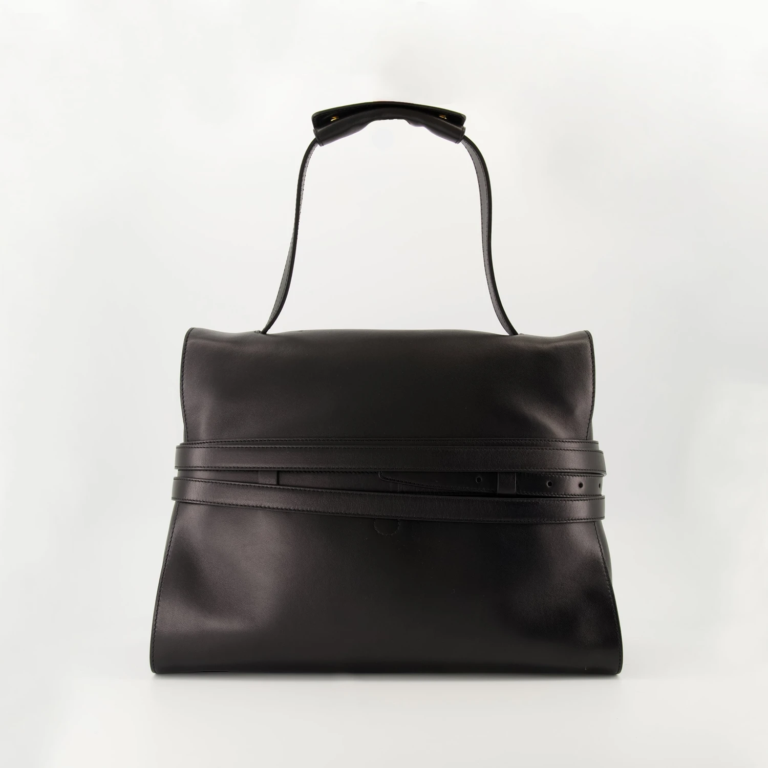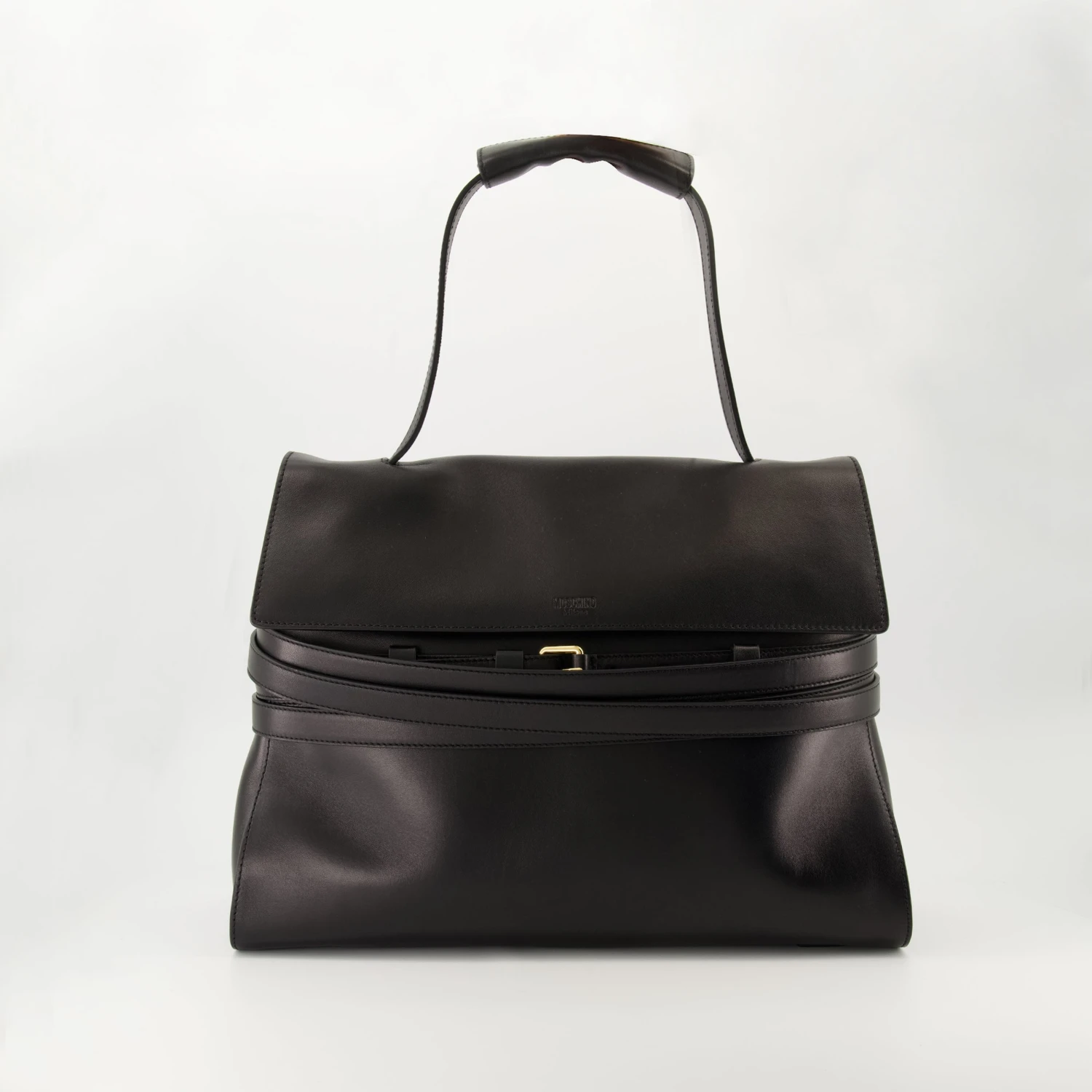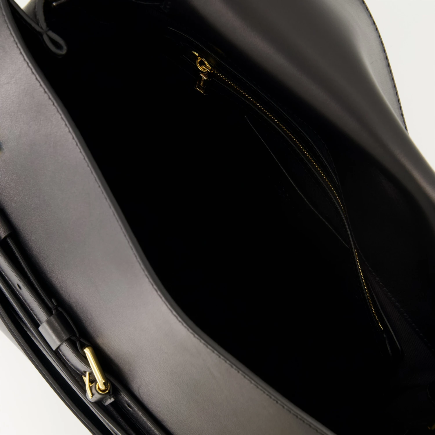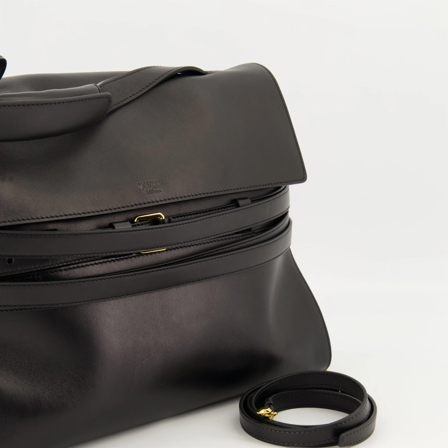 Sac Tie Me medium en cuir cappa de Moschino, conçu pour les femmes. Ce modèle fait partie de la collection Printemps-Été 2025 et est réalisé en cuir nappa noir.