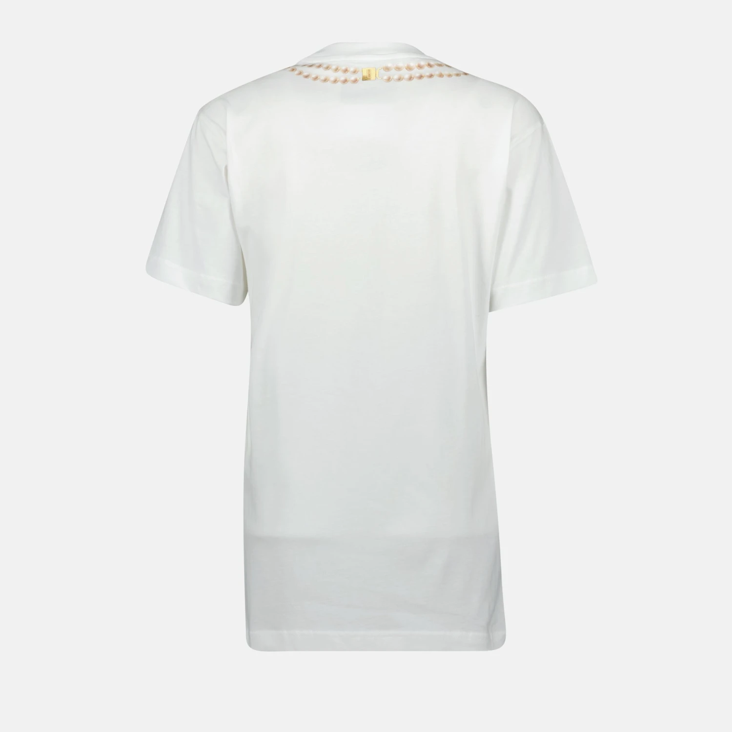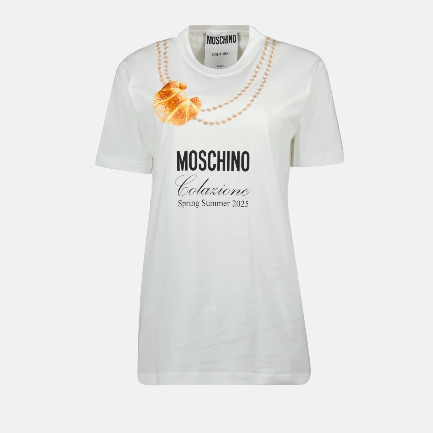 T-shirt blanc Colazione de Moschino pour femme, fait en coton avec un logo imprimé. Ce modèle fait partie de la collection Printemps-Été 2025, alliant confort et style moderne.