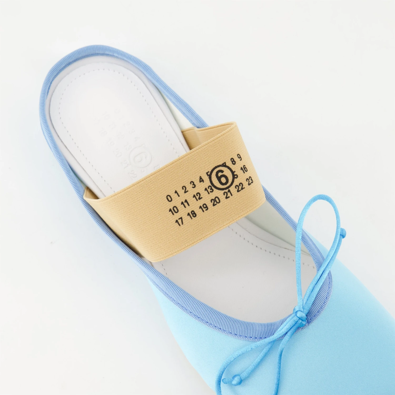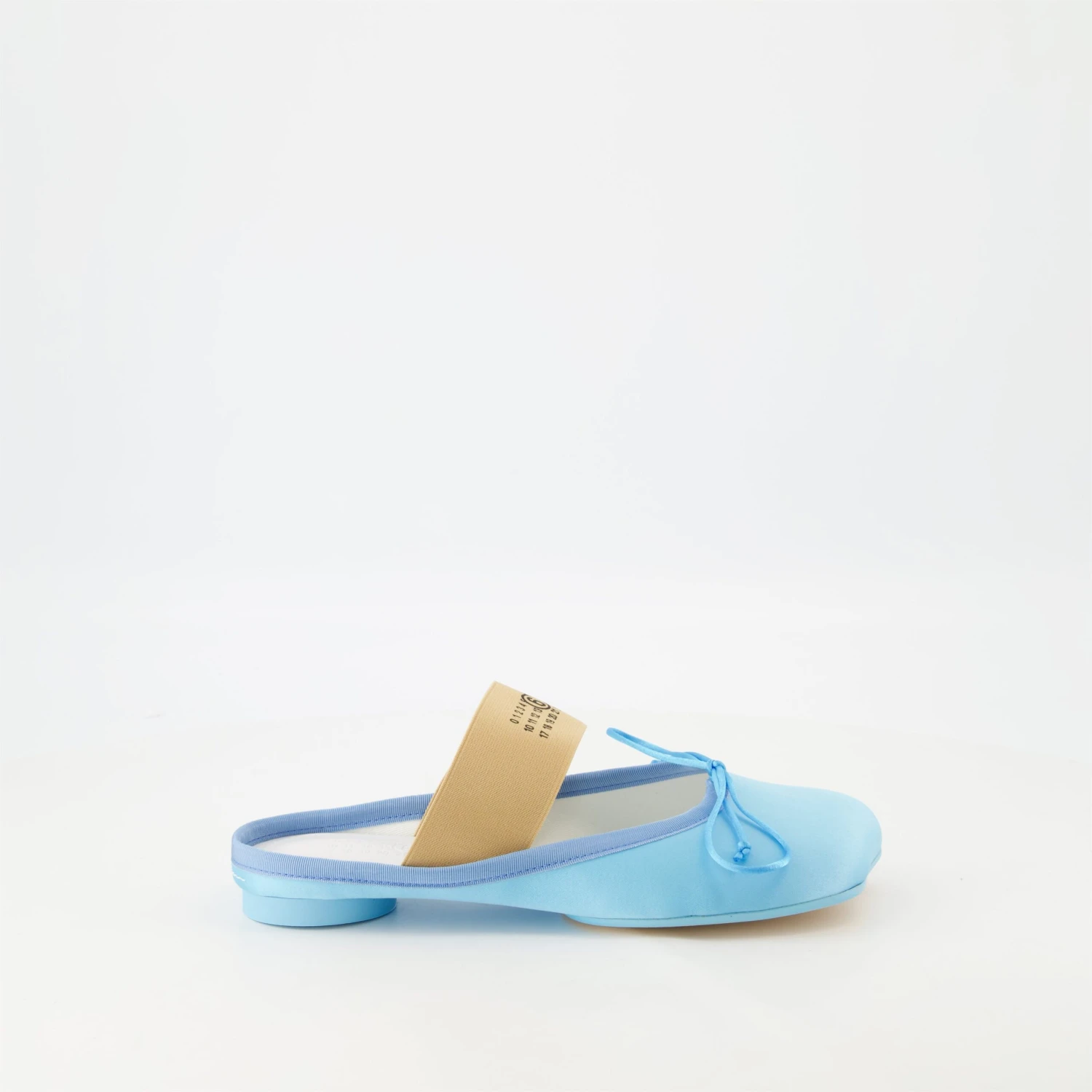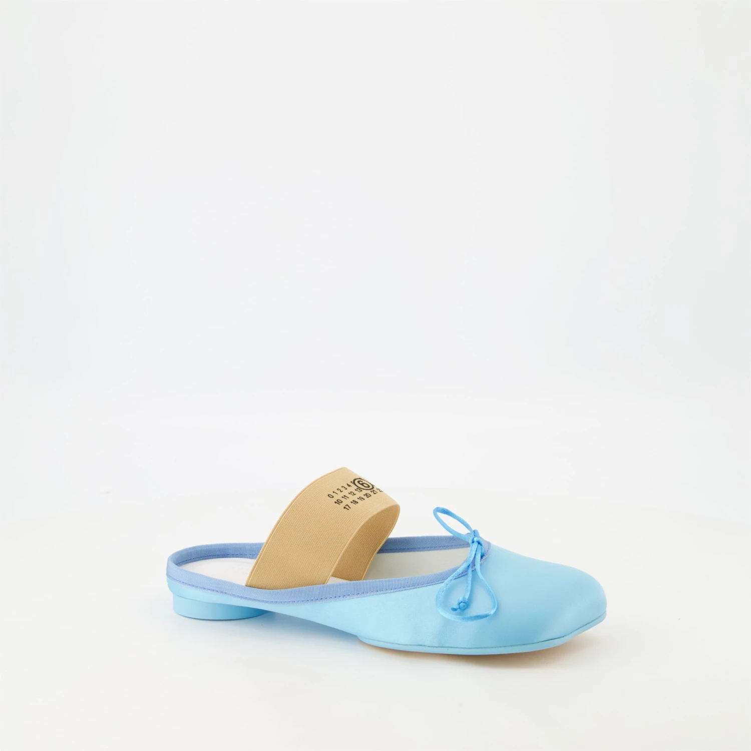 Mules Anatomic en viscose bleu de la marque MM6, conçues pour les femmes. Elles font partie de la collection Printemps-Été 2025 et présentent un design élégant avec un nœud sur le devant.