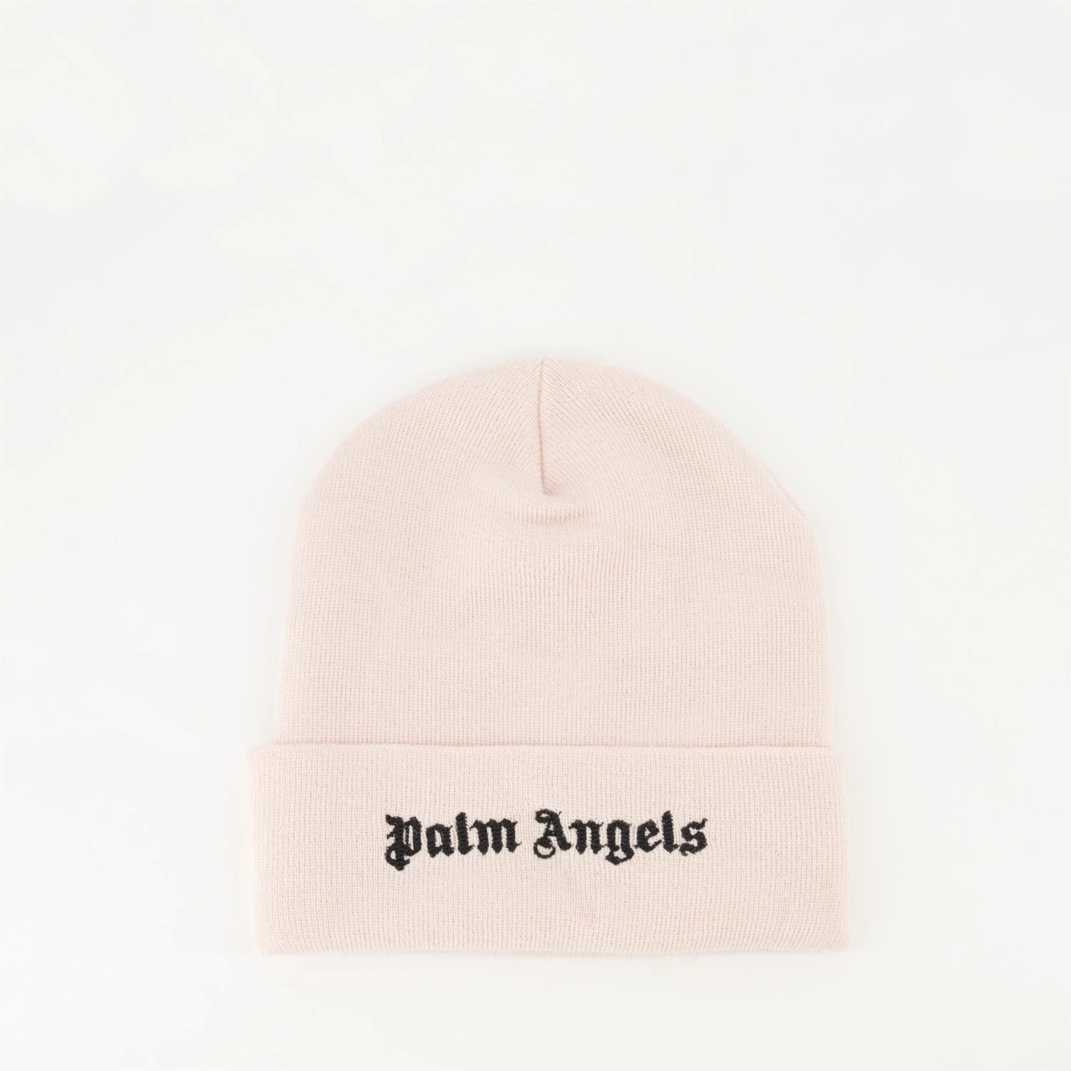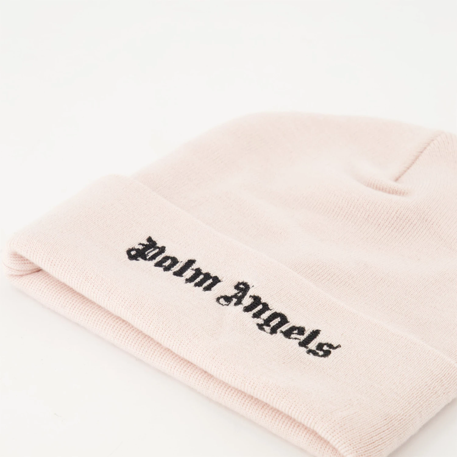 Bonnet en laine rose de la marque Palm Angels, conçu pour les femmes. Il fait partie de la collection Automne-Hiver 2023 et présente un logo brodé sur le devant.