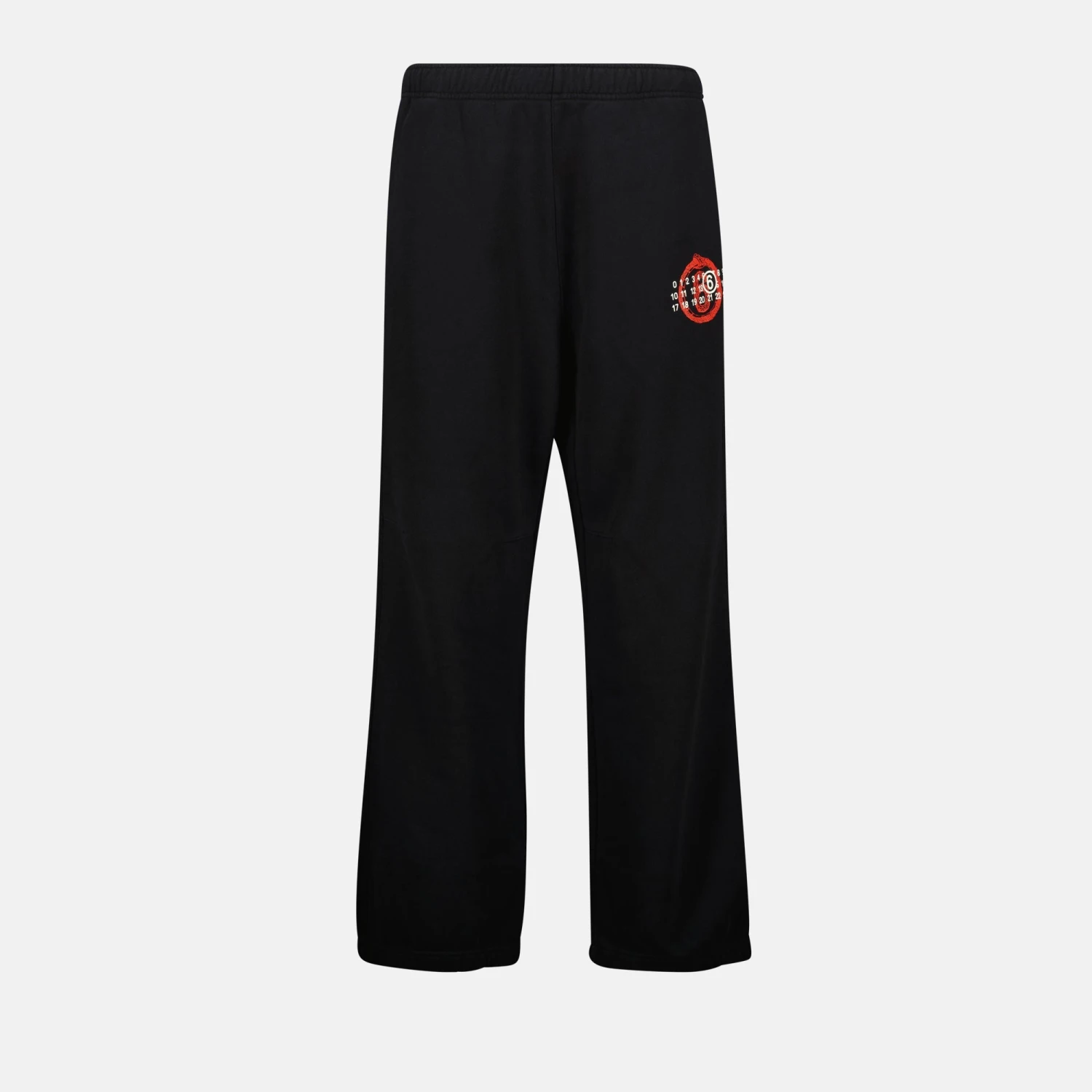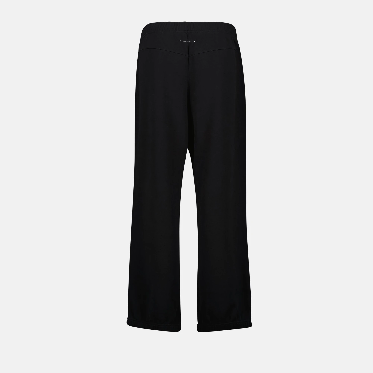 Pantalon de jogging noir de la marque MM6, conçu pour les femmes. Ce modèle fait partie de la collection Printemps-Été 2025 et se distingue par sa coupe large et ses poches latérales.