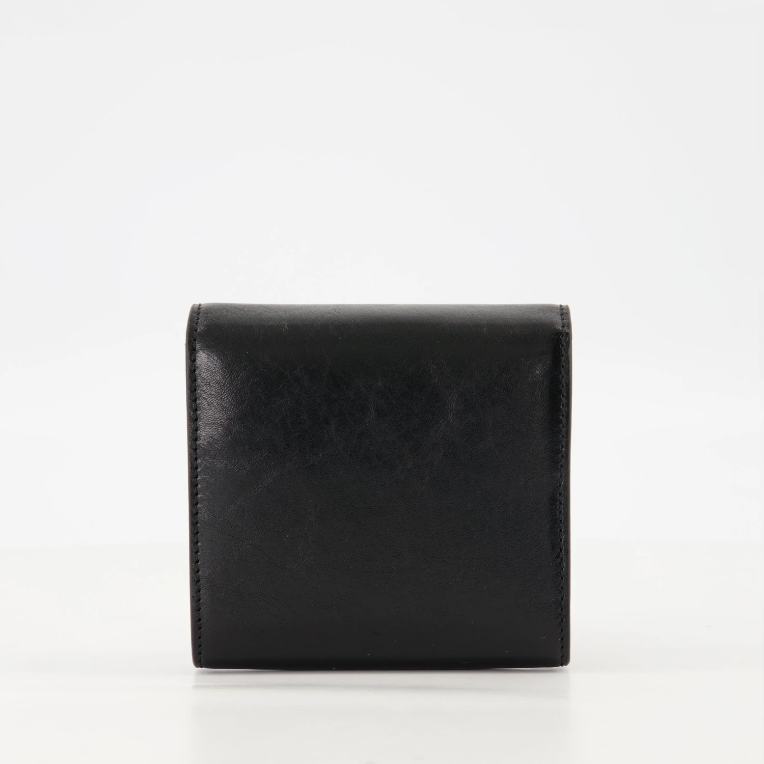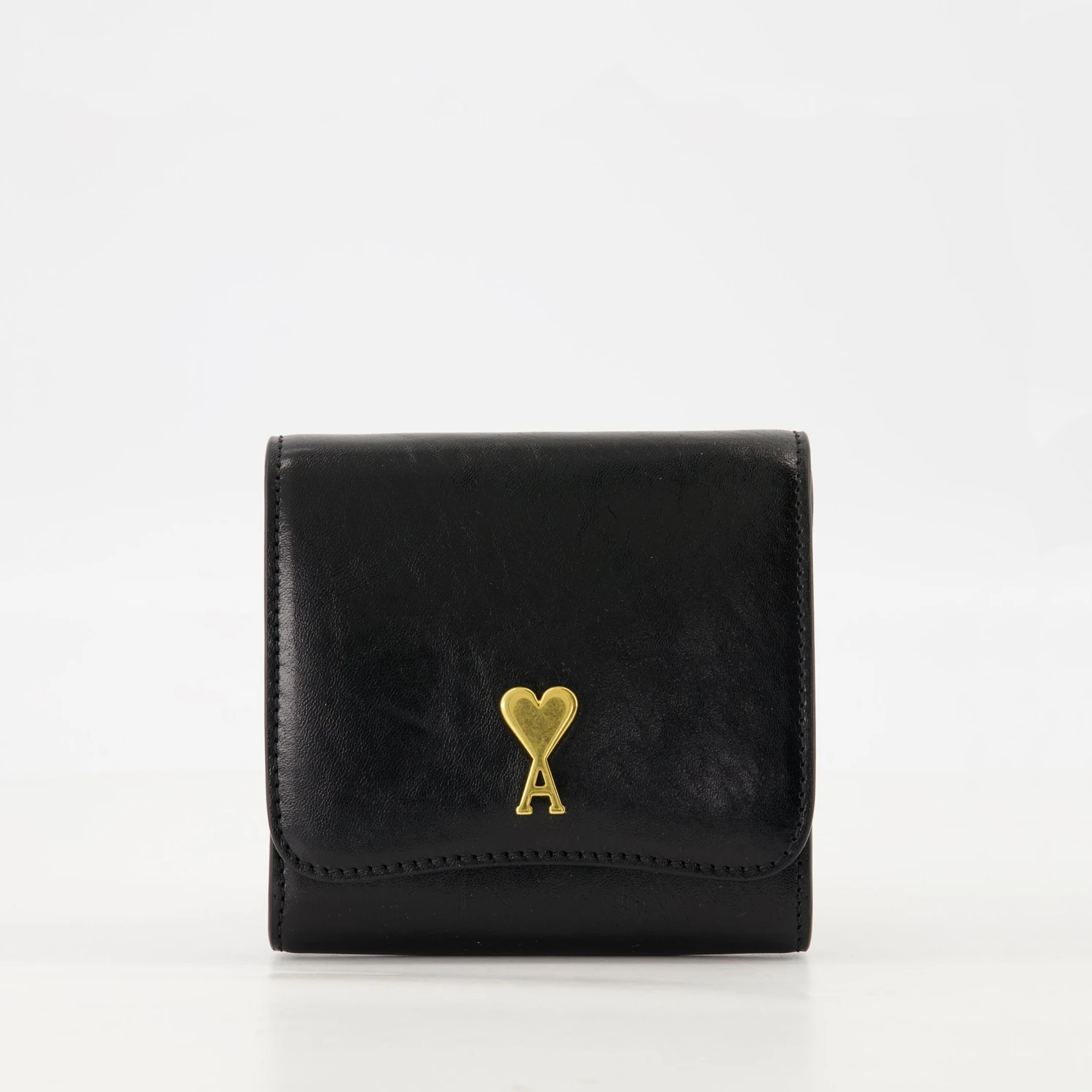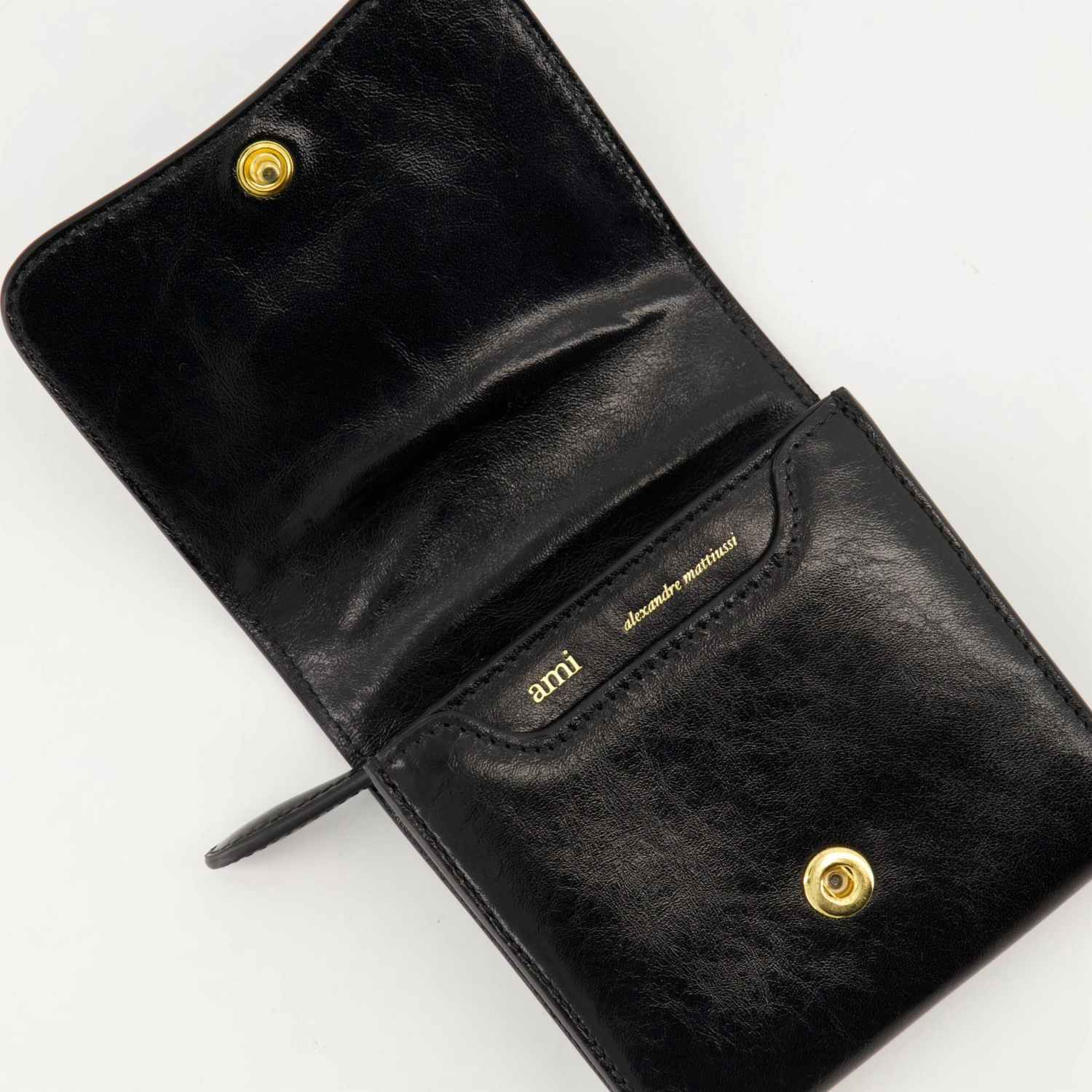 Portefeuille en cuir noir AMI Paris, un modèle mixte de la collection Printemps-Été 2025, réalisé en cuir grainé avec un rabat à bouton pression et plusieurs compartiments pratiques.