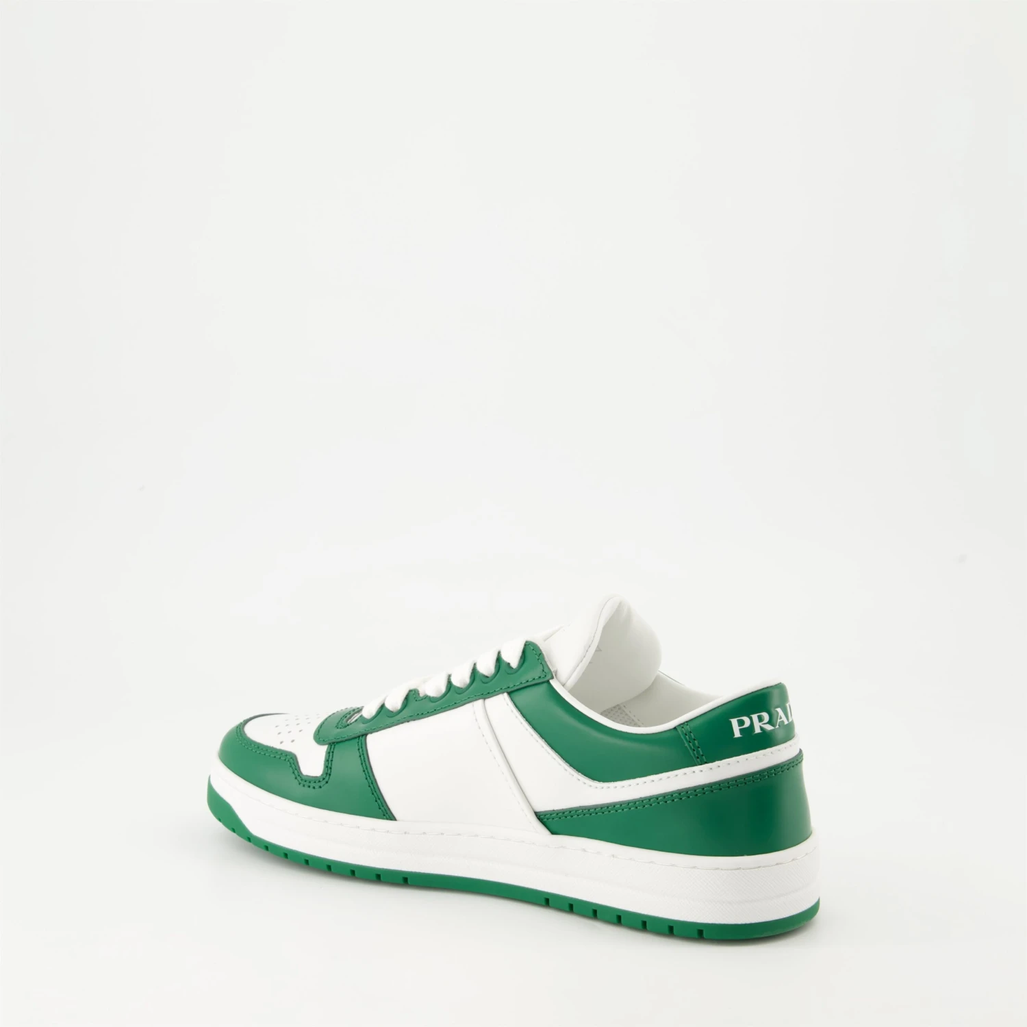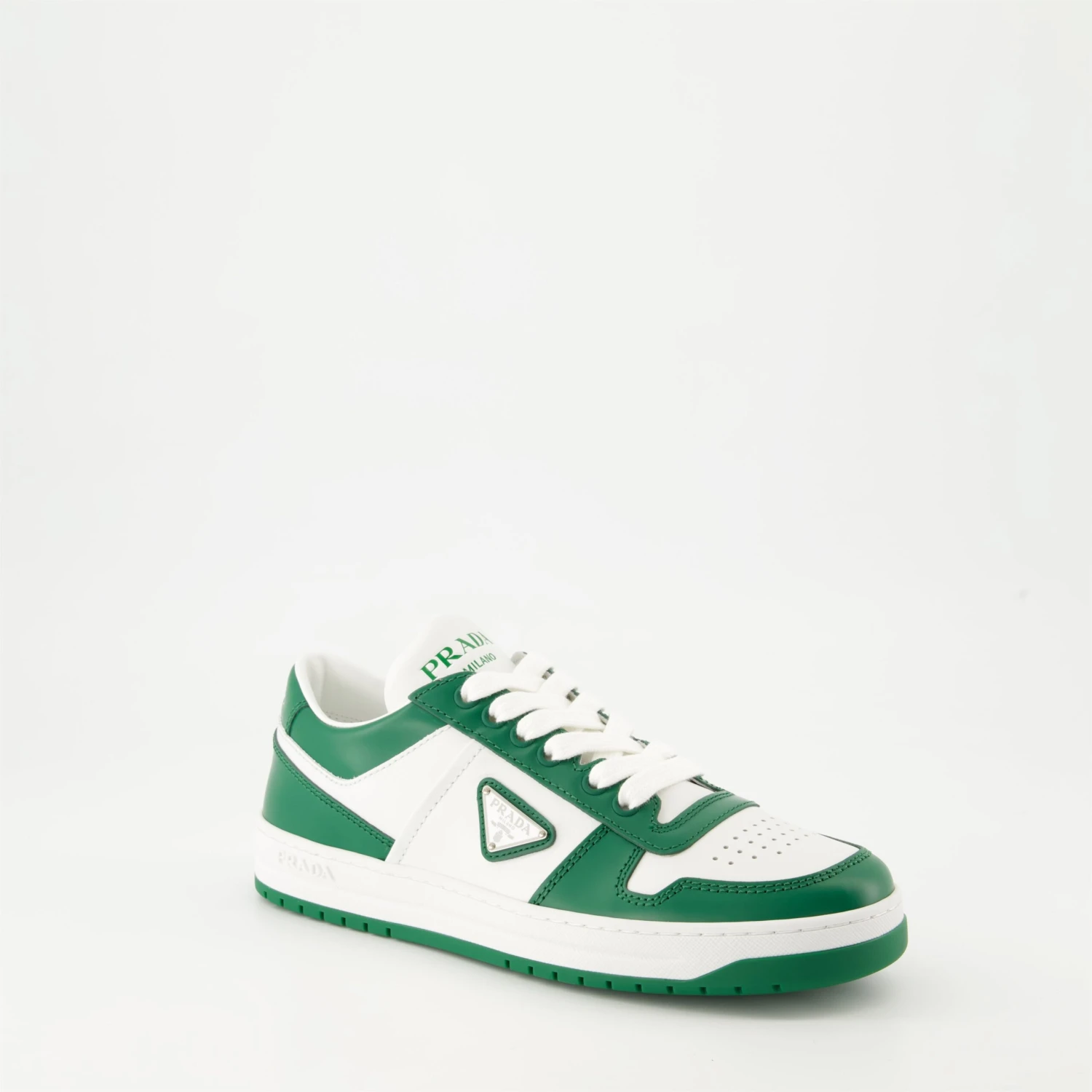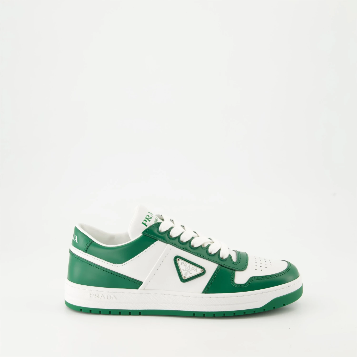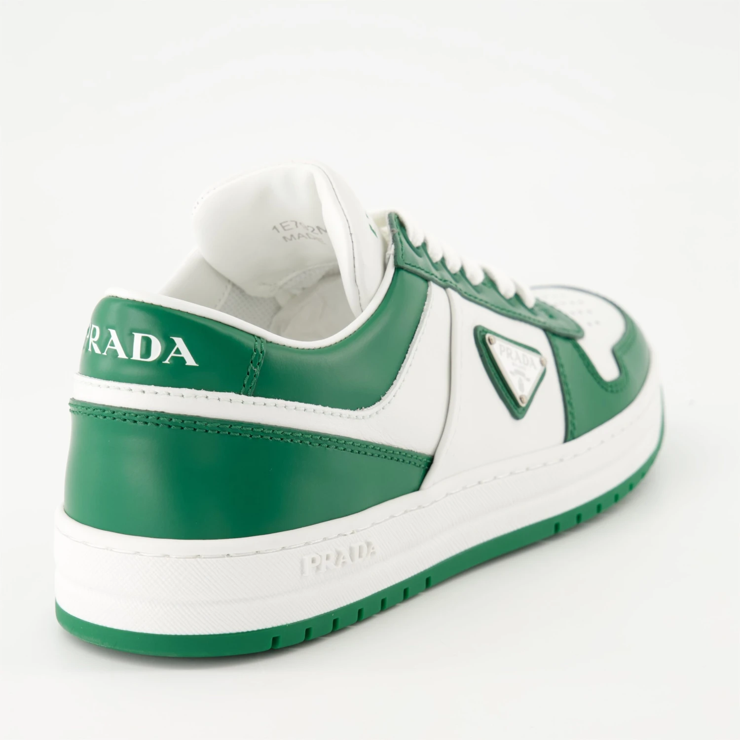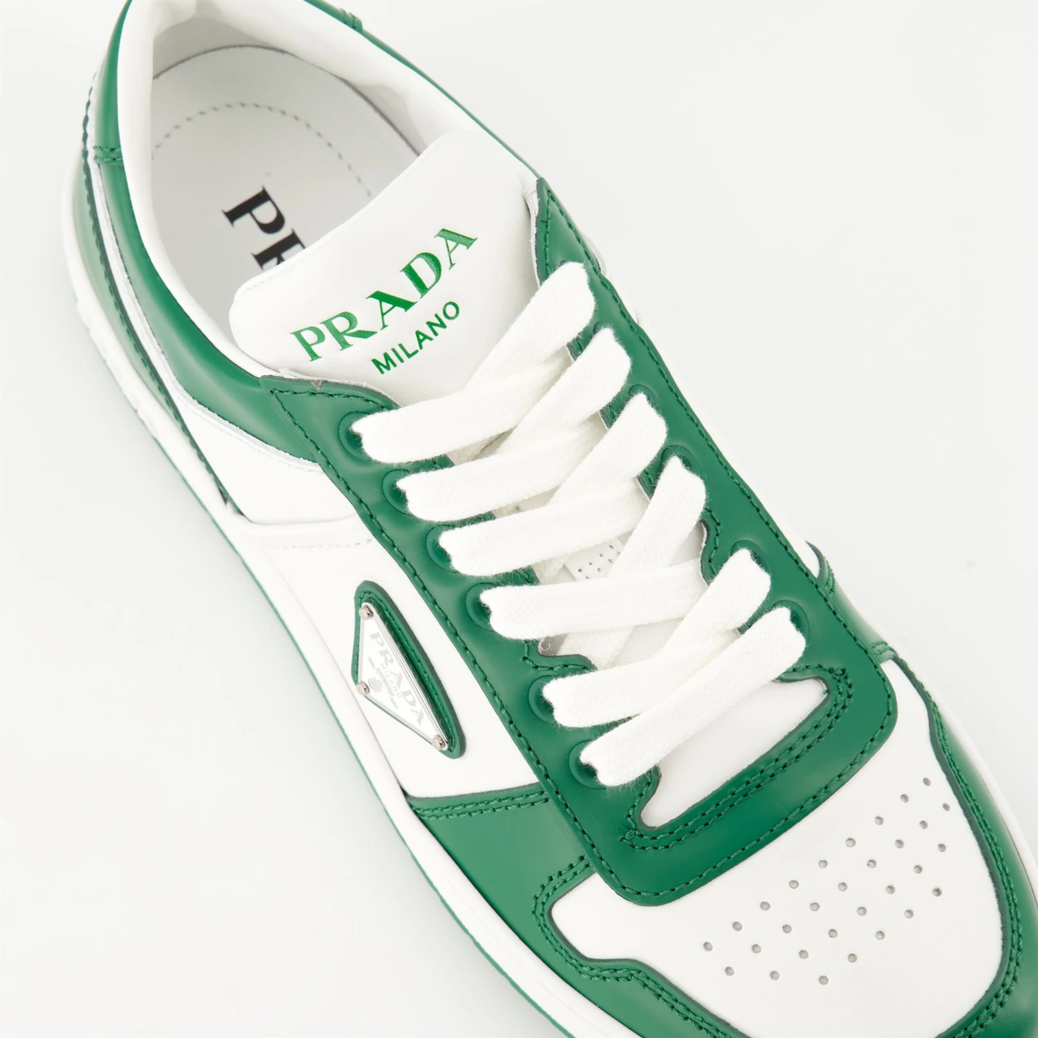 Baskets Downtown Prada collection Automne-Hiver 2024 pour Femme. Réalisé en cuir lisse. Article Design bicolore. Bout rond et Semelle crantée en gomme.