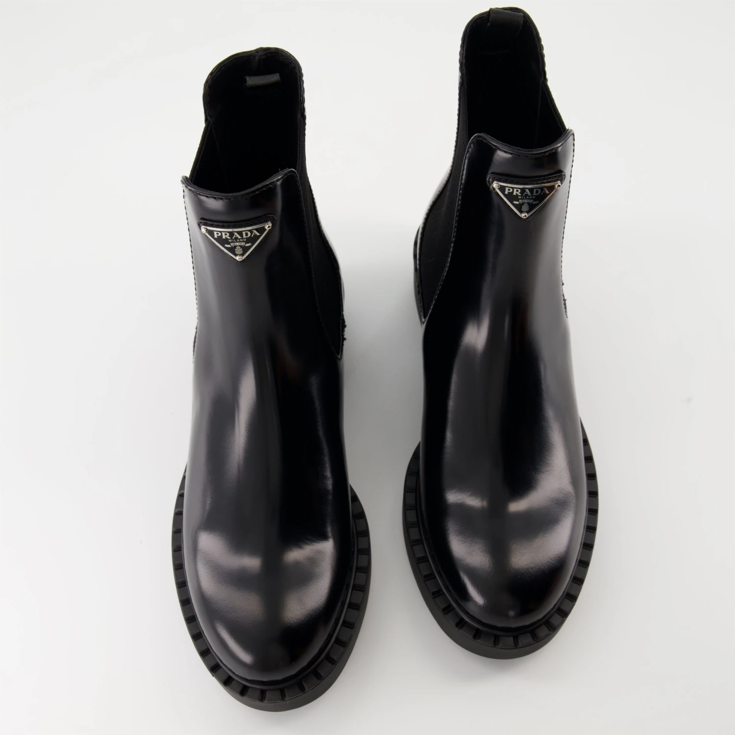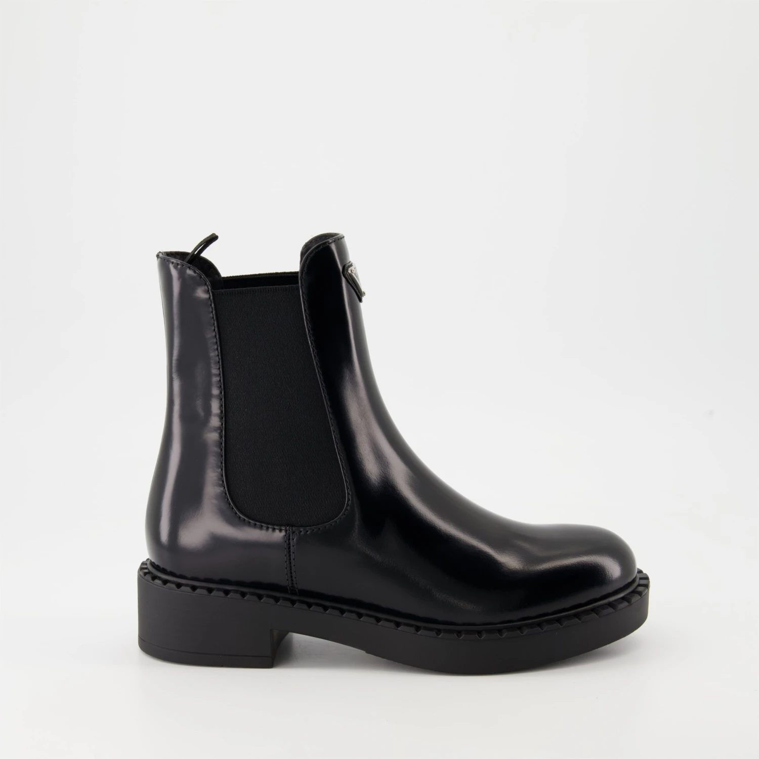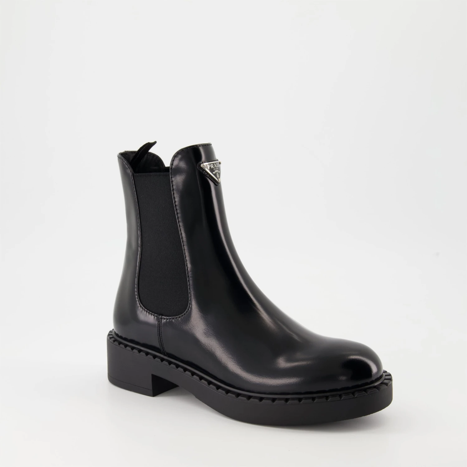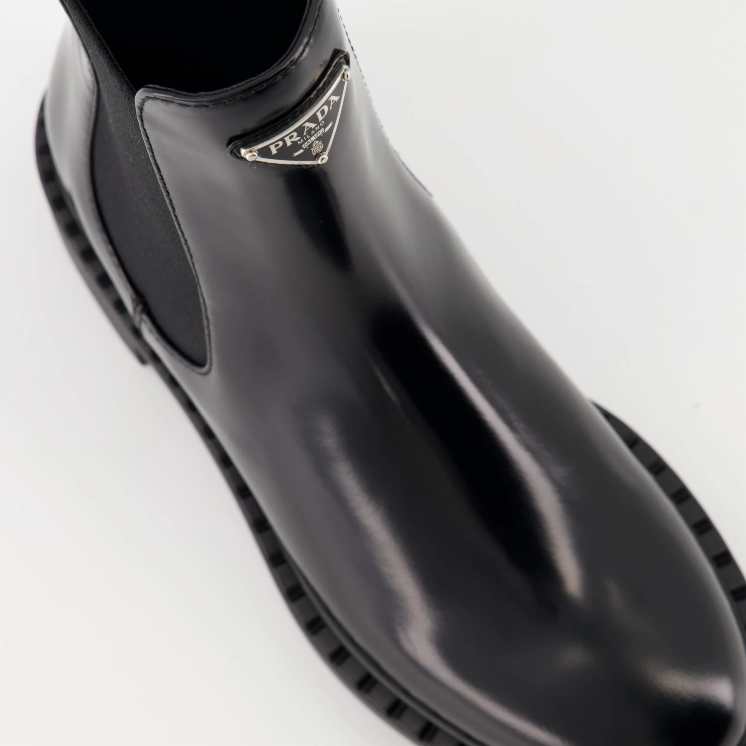 Bottines en cuir verni Prada collection Automne-Hiver 2024 pour Femme. Réalisé en cuir verni. Article de couleur Noir. Bout rond et Semelle en gomme.