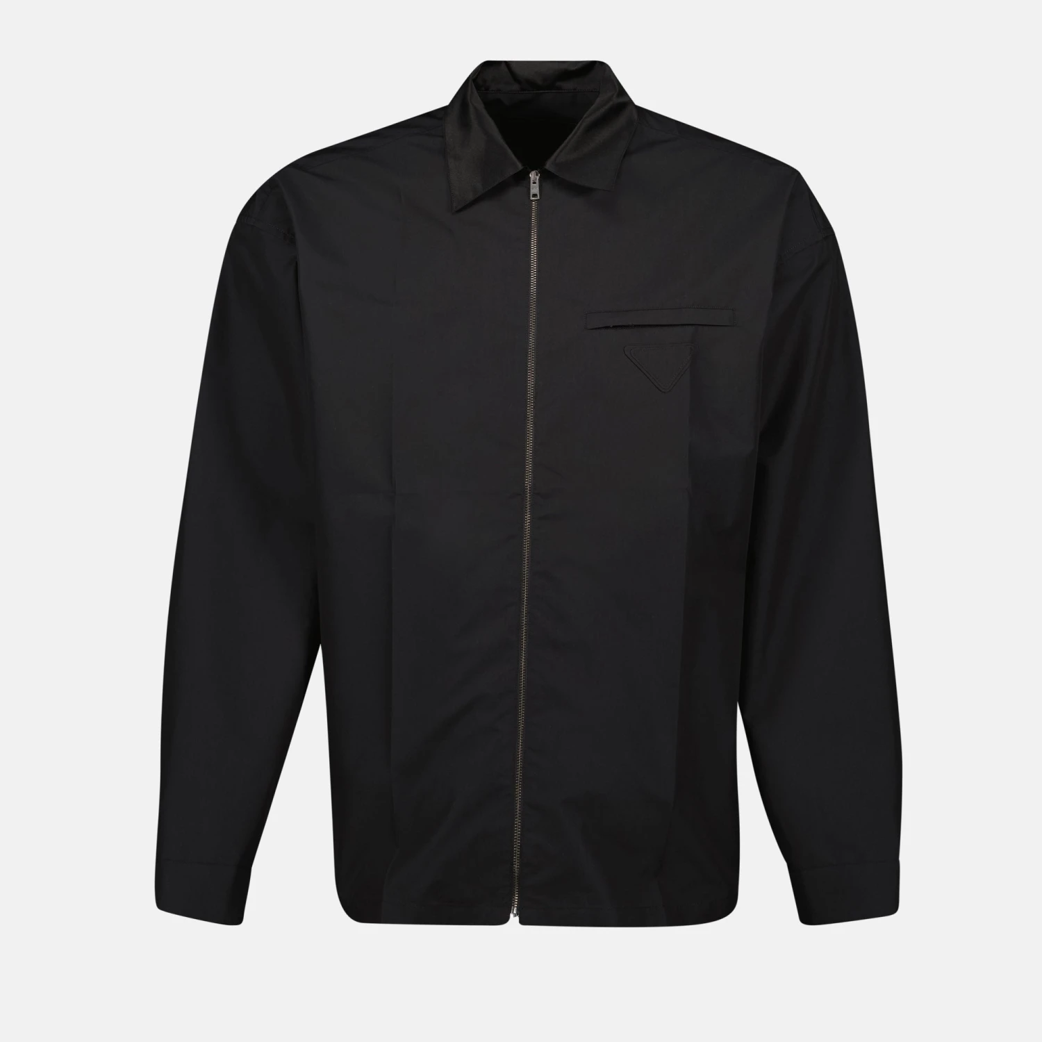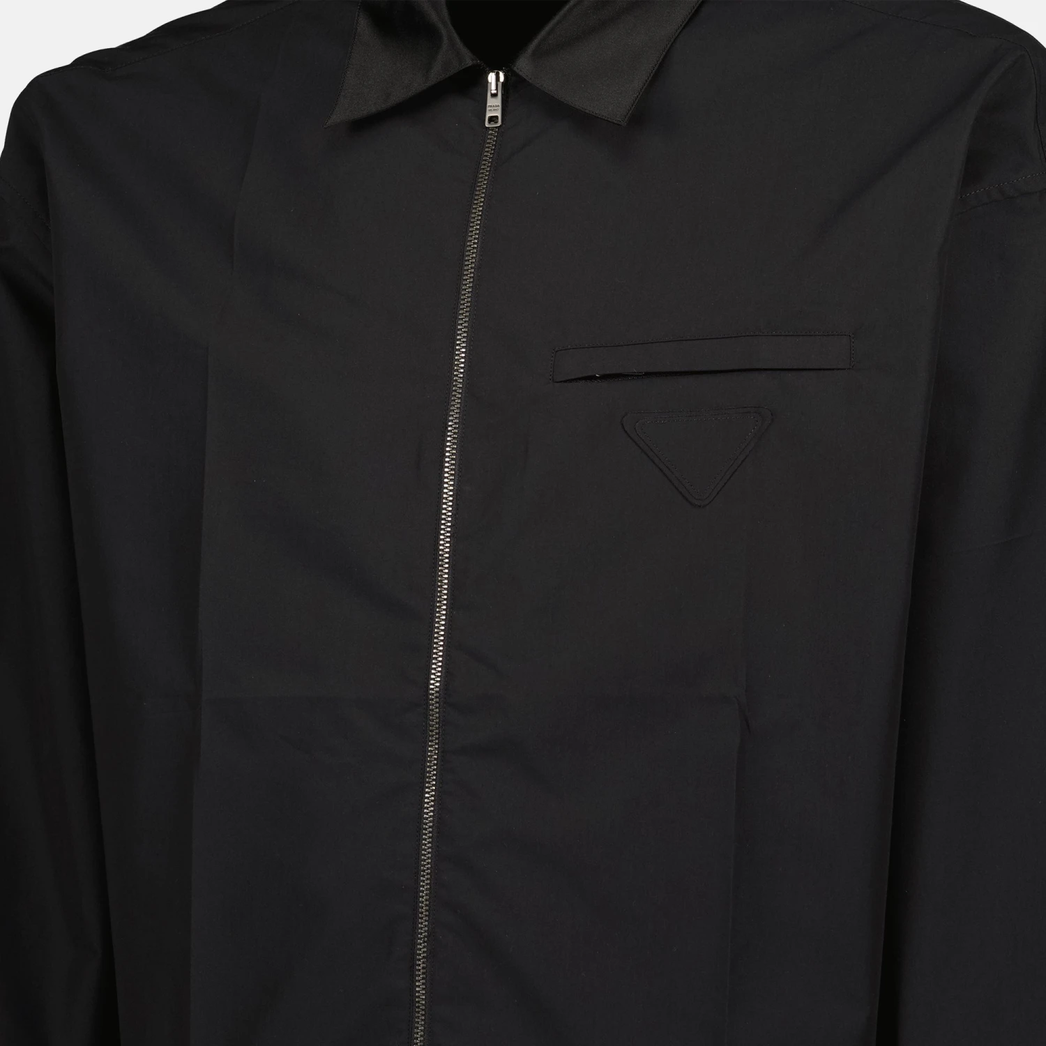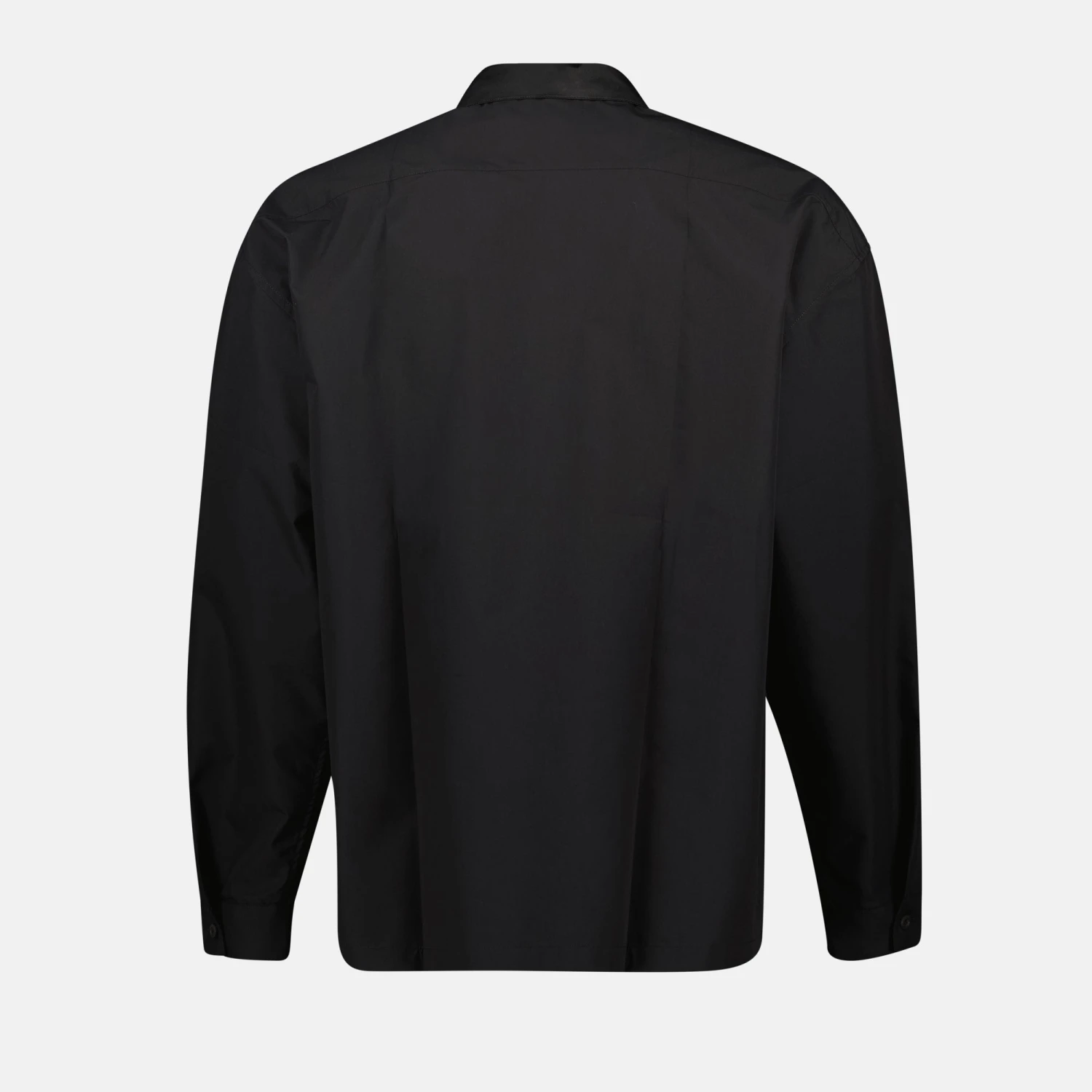 Chemise en coton technique noir de Prada pour homme, collection Printemps-Été 2025. Elle présente un col classique, des manches longues et une coupe longue avec des détails raffinés.