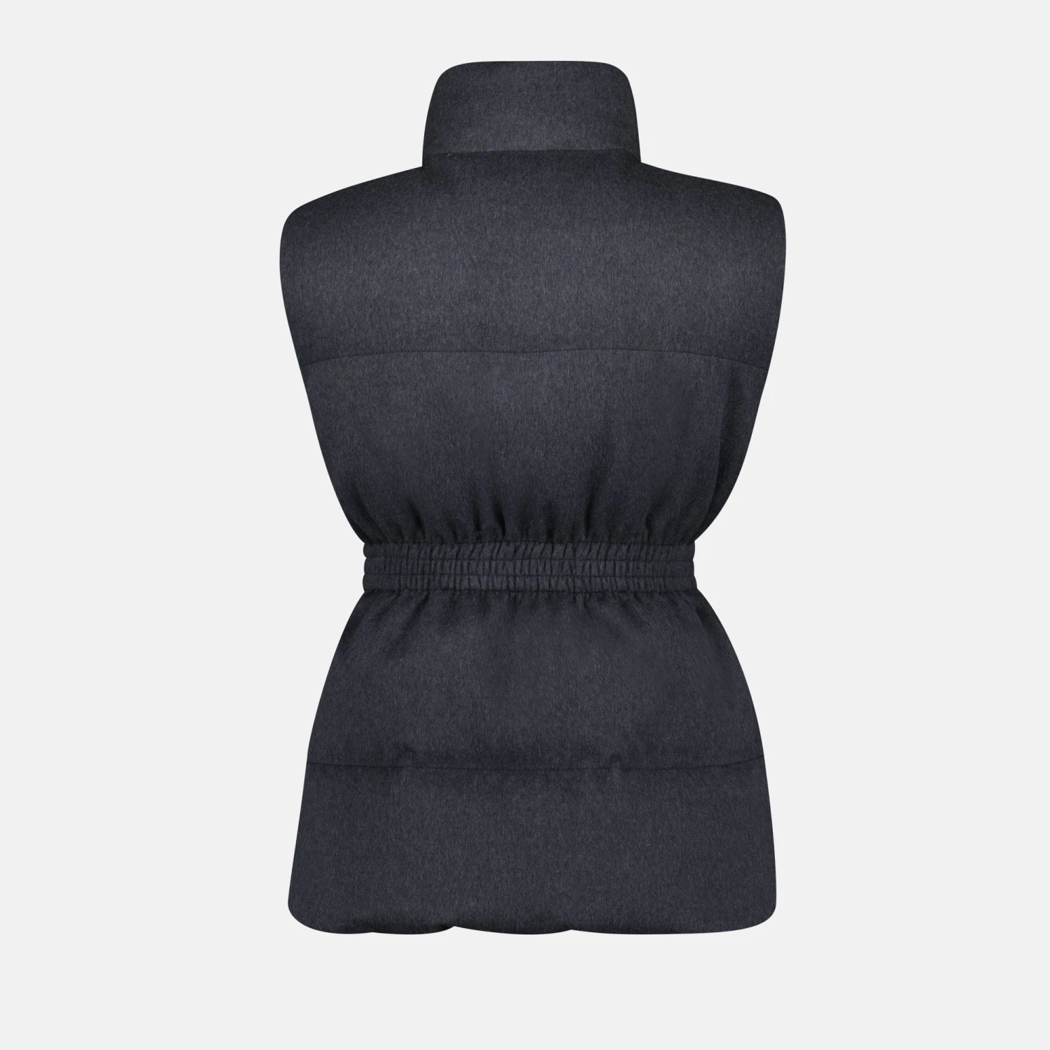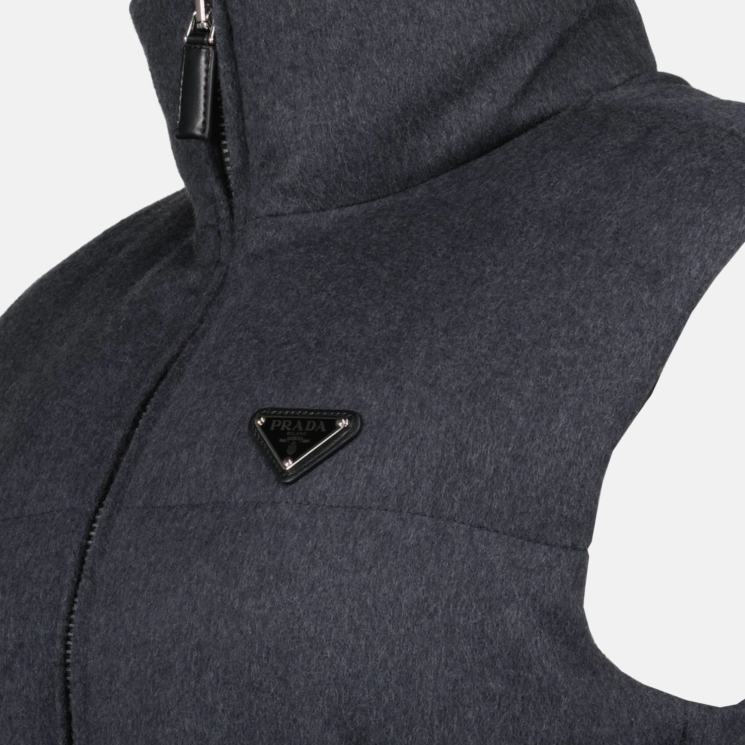 Doudoune sans manches Prada collection Automne-Hiver 2024 pour Femme. Réalisé en laine. Article Couleur gris. Col montant et Design sans manches.