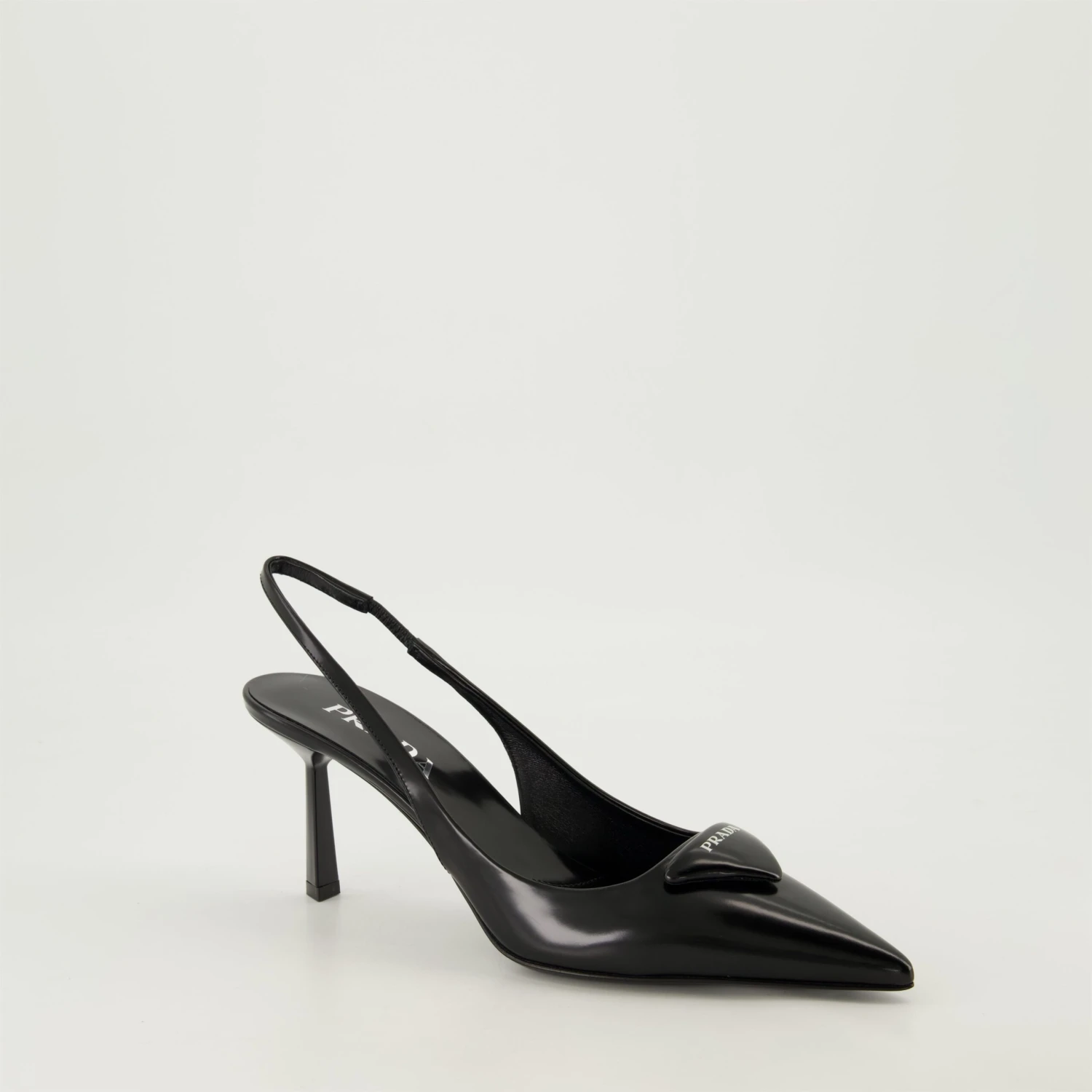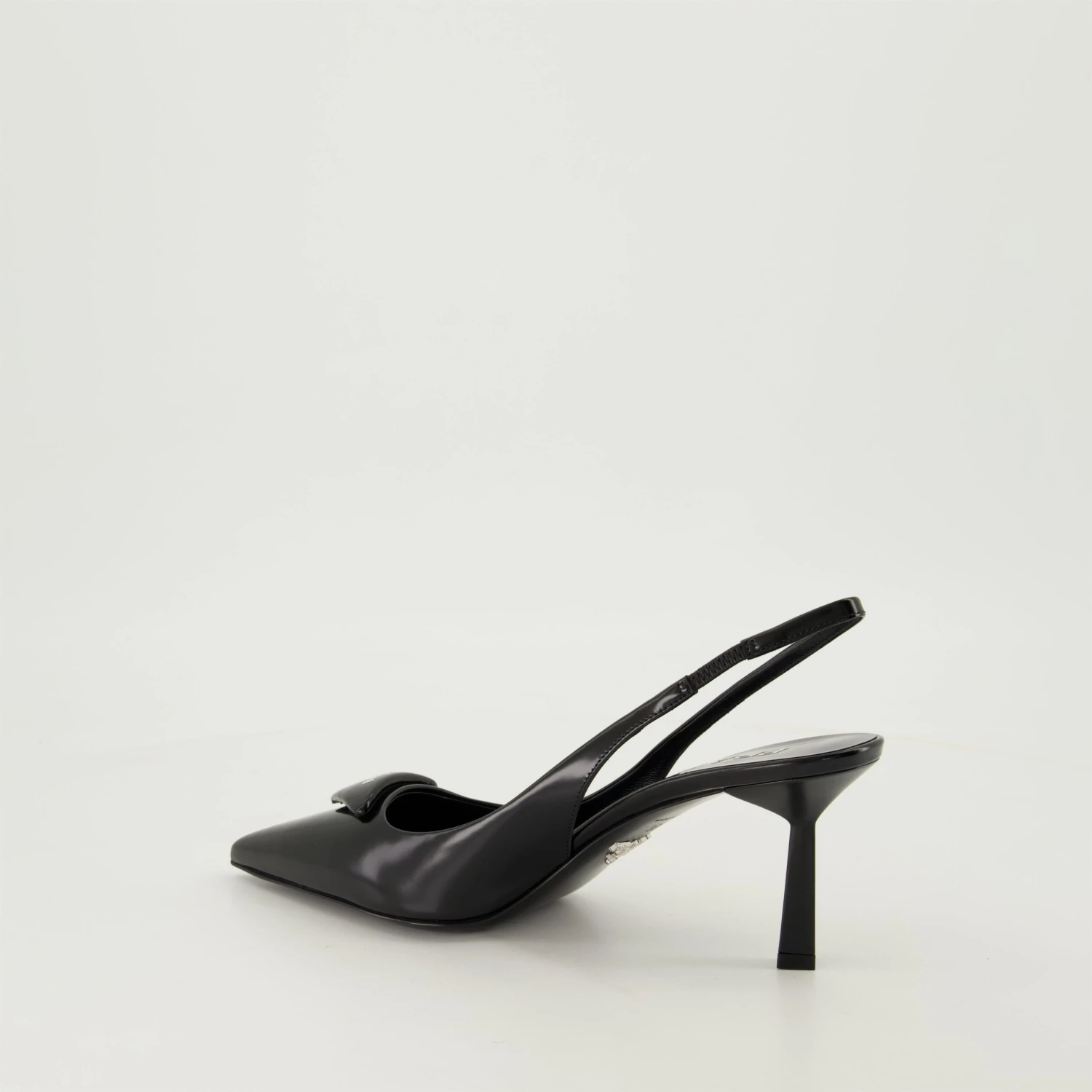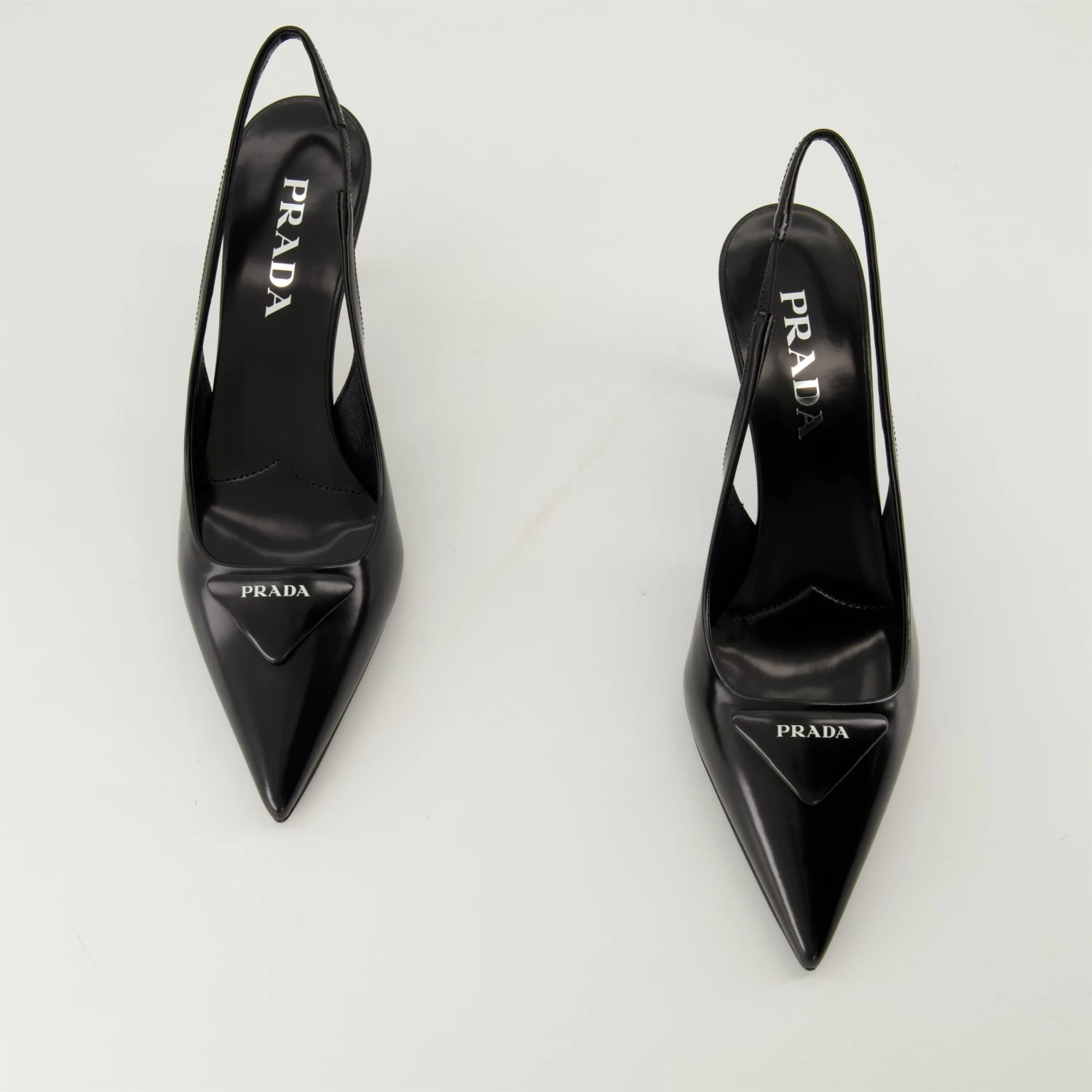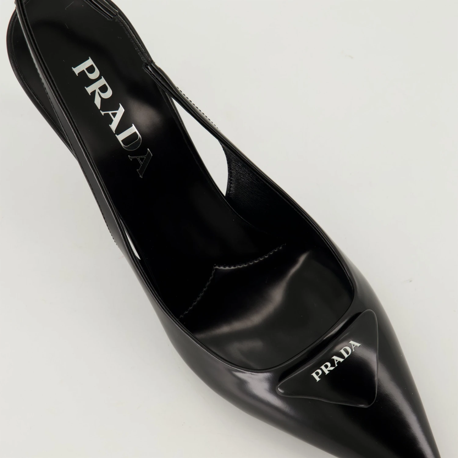 Escarpin en cuir noir de Prada pour femme, réalisé en cuir de veau. Ce modèle fait partie de la collection Printemps-Été 2025 et présente un design élégant avec un talon fin.