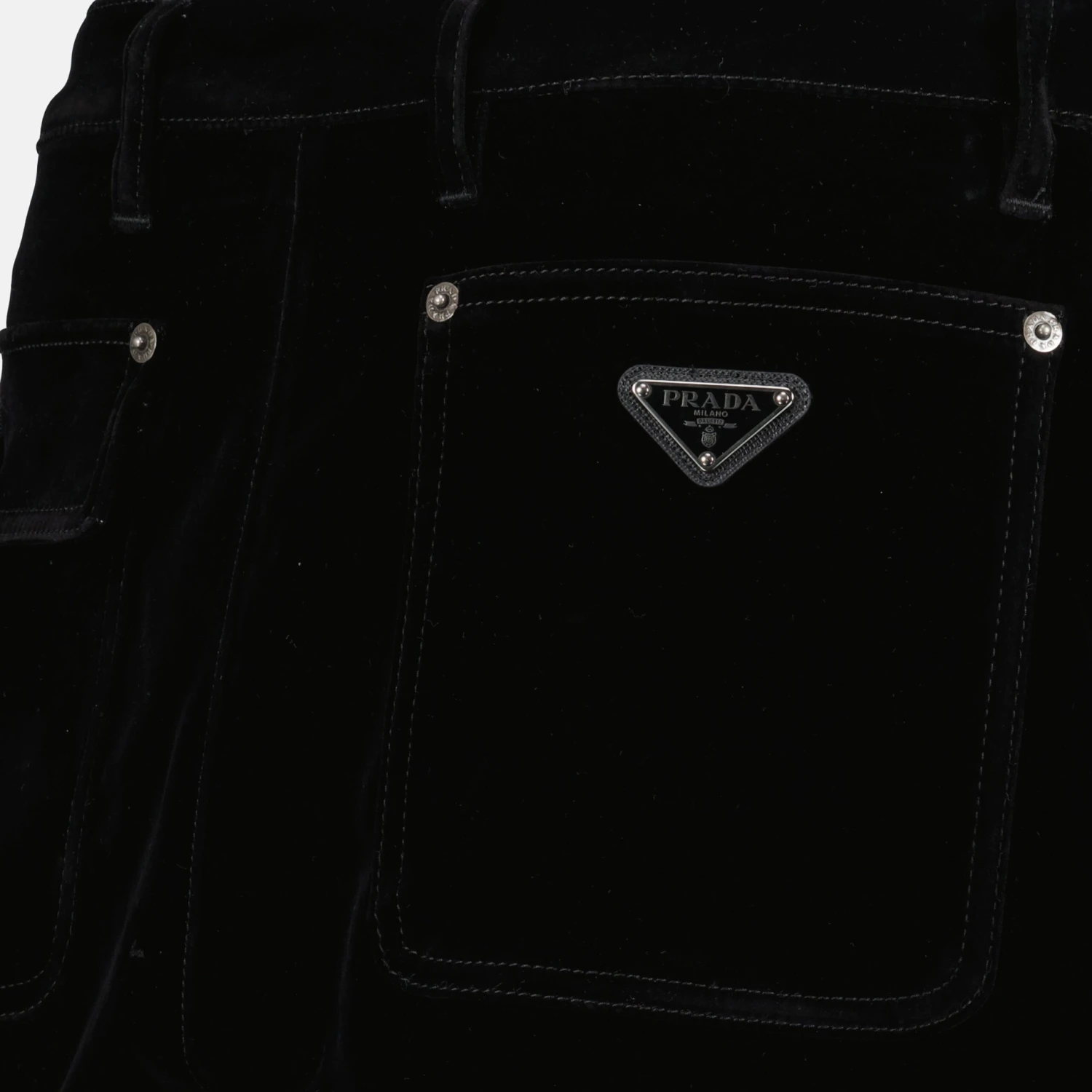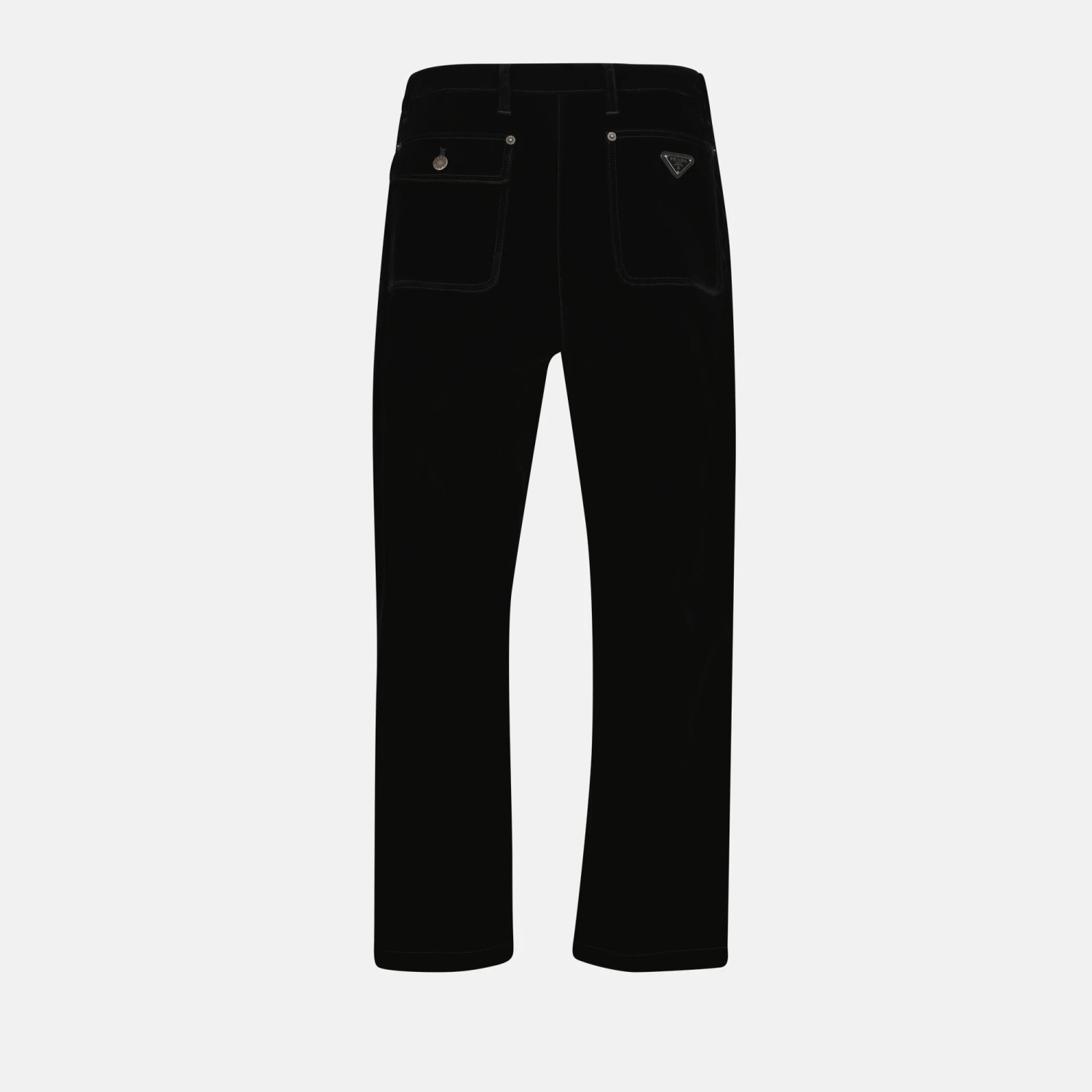 Jeans en denim velours noir de Prada pour homme, de la collection Printemps-Été 2025. Ils présentent une coupe large et des détails élégants comme le logo triangle en métal émaillé.