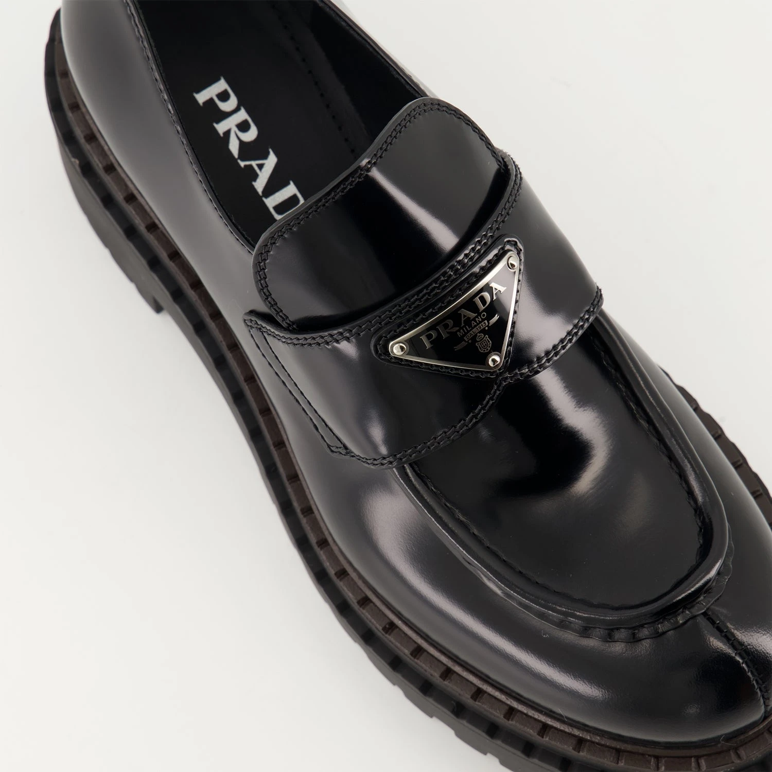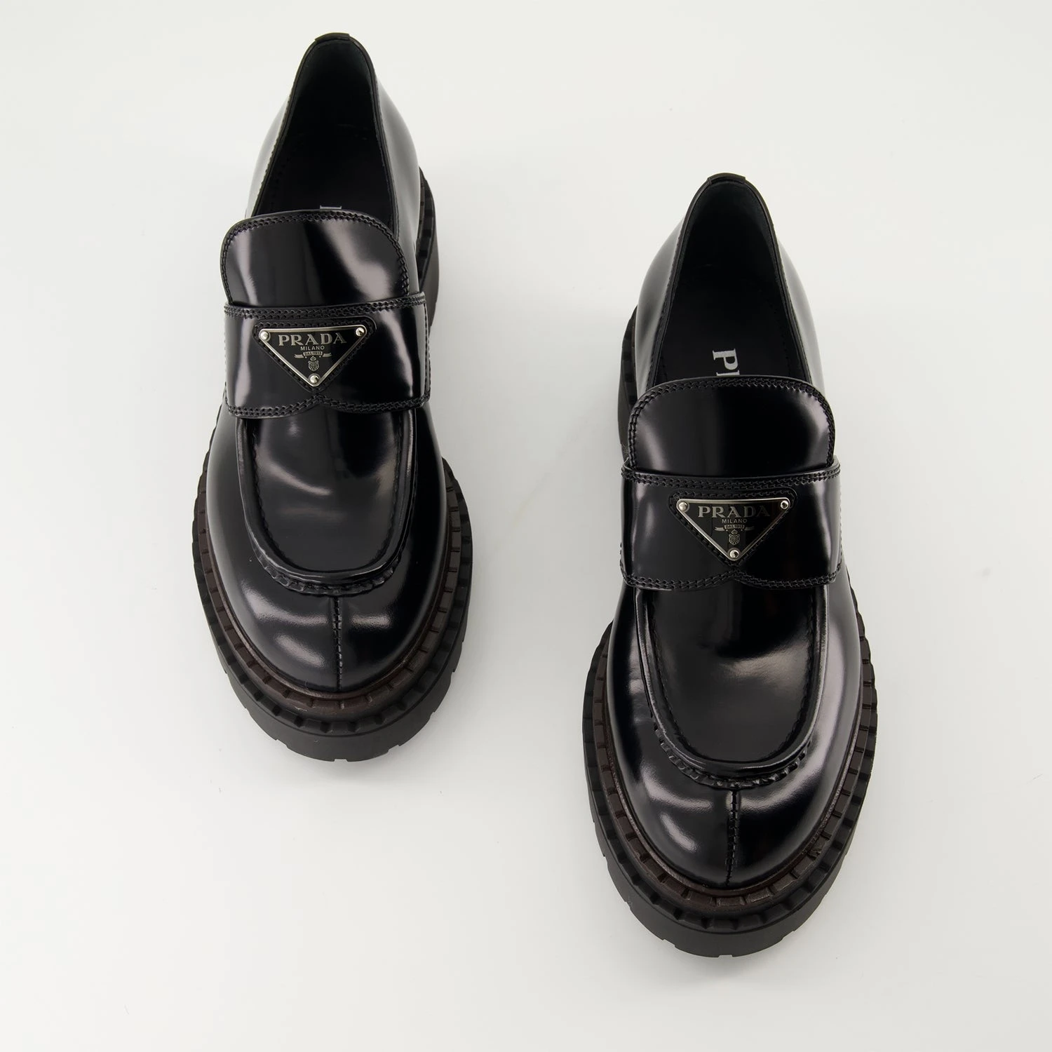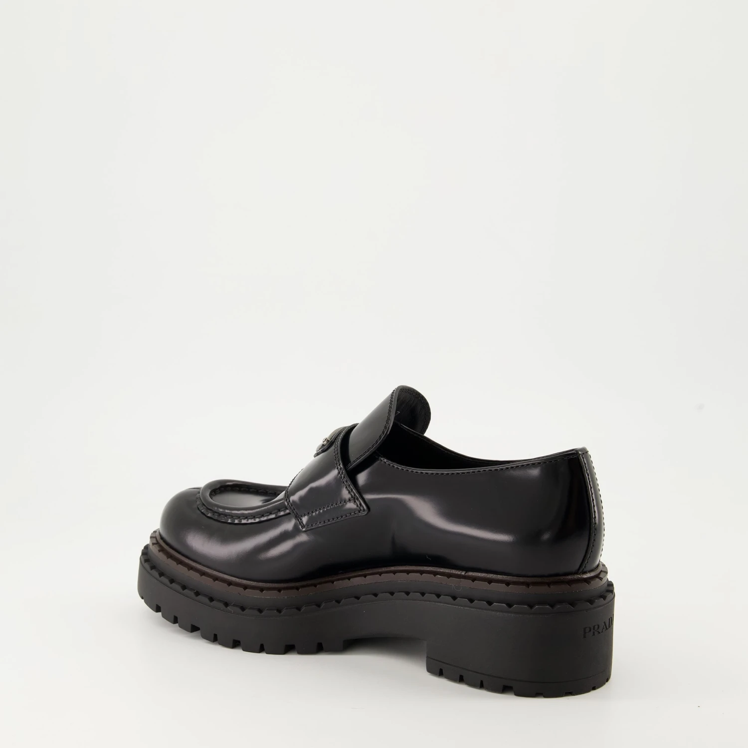 Mocassins en cuir Chocolate Prada collection Automne-Hiver 2024 pour Femme. Réalisé en cuir brossé. Article Couleur noir. Bout rond et Semelle crantée en gomme.