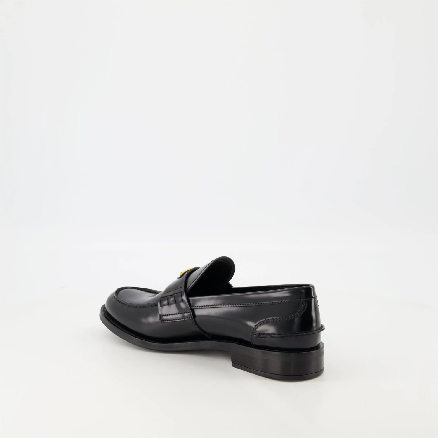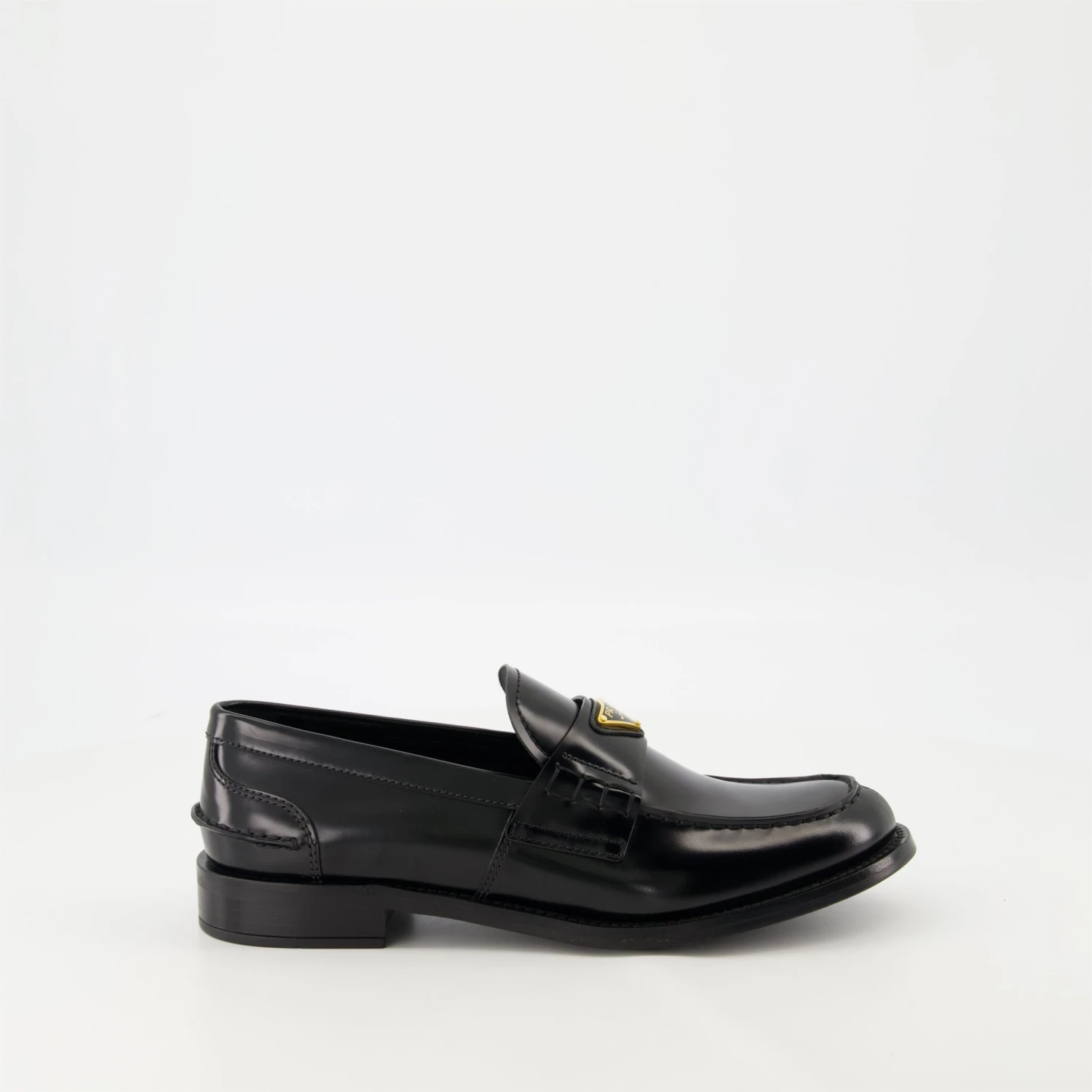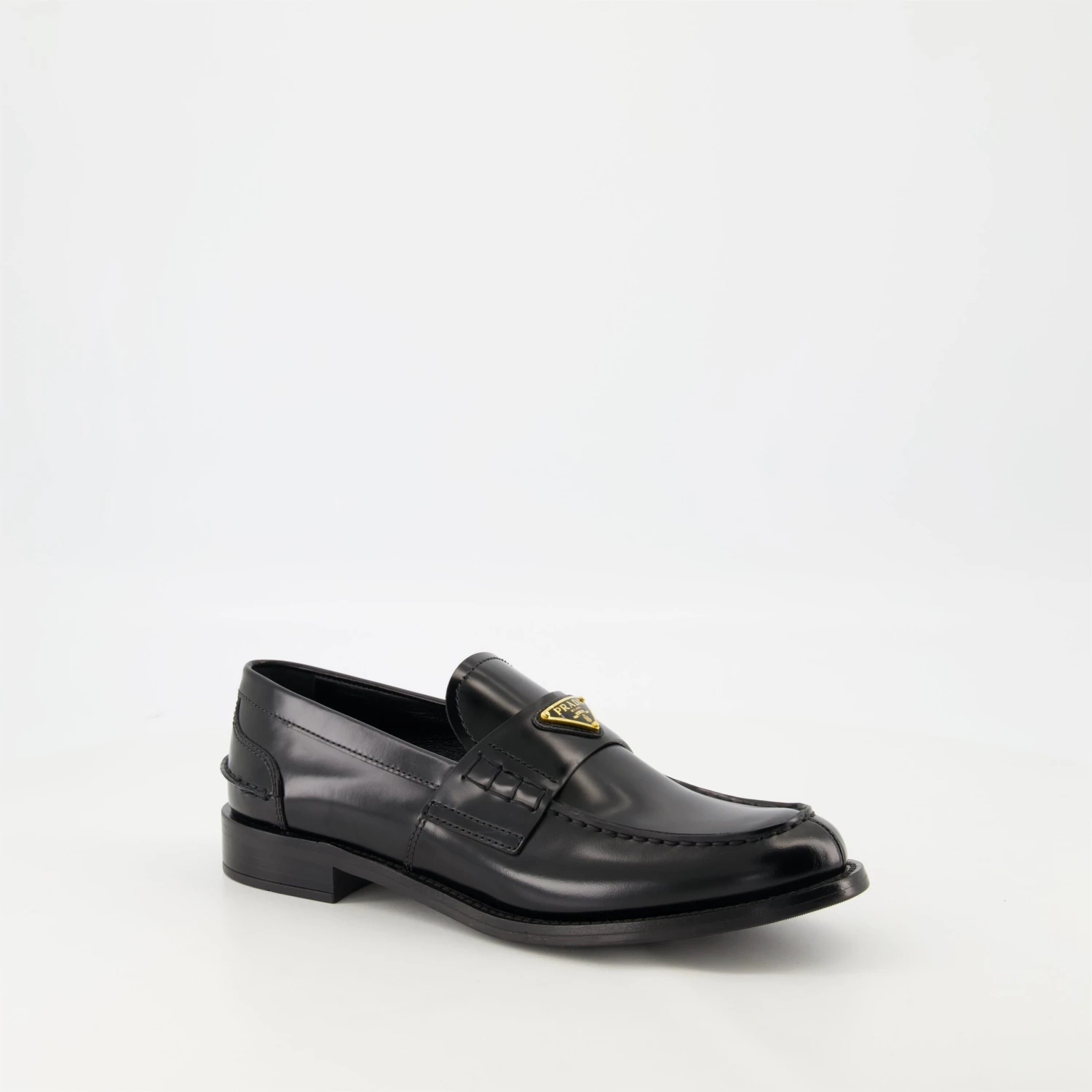 Mocassins en cuir brossé noir de Prada pour femme, collection Printemps-Été 2025. Ce modèle à enfiler présente une semelle crantée en gomme et un logo triangle en métal émaillé.