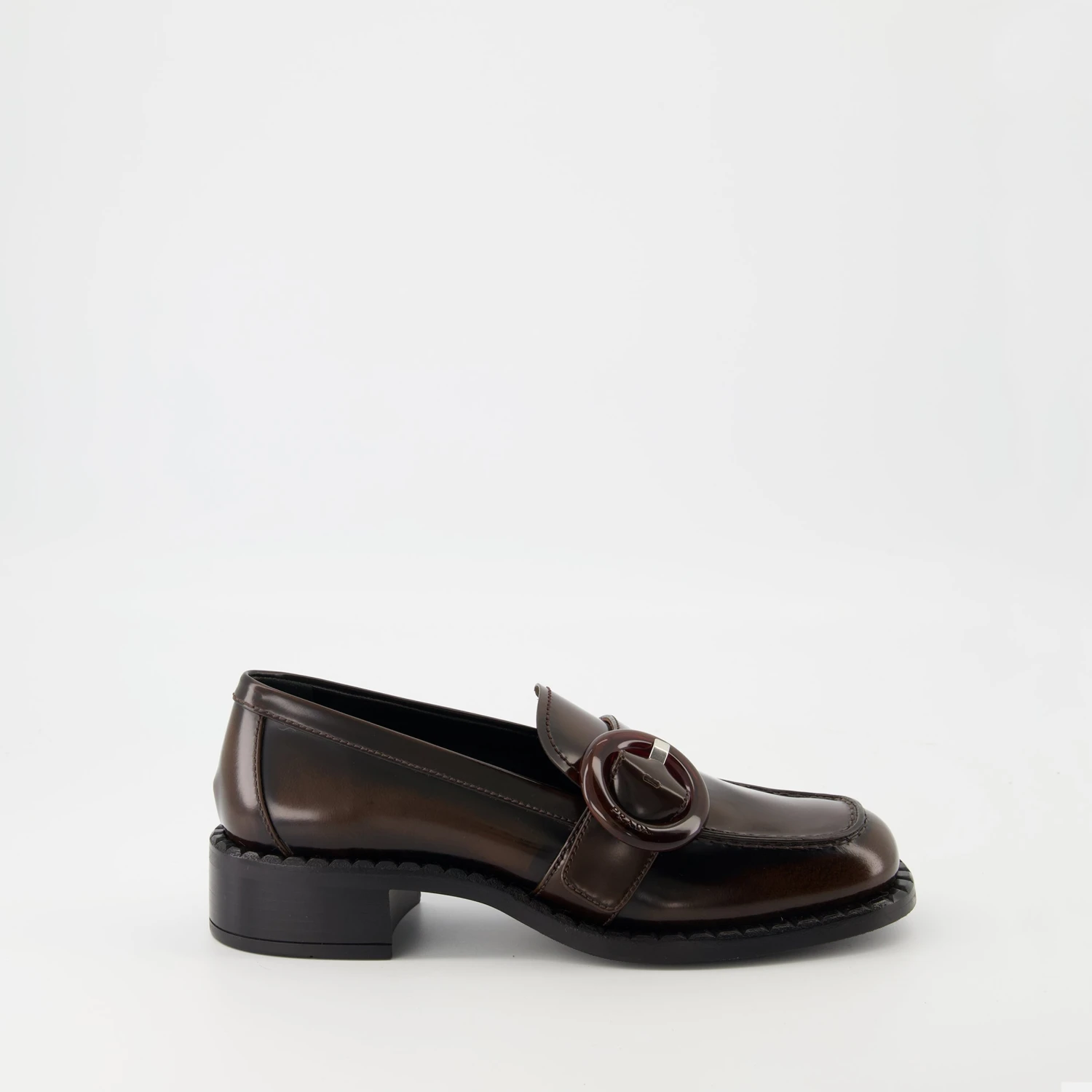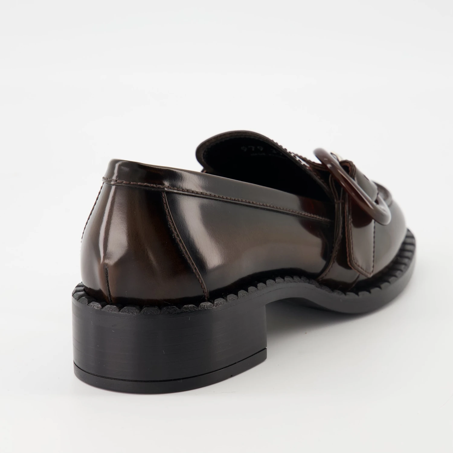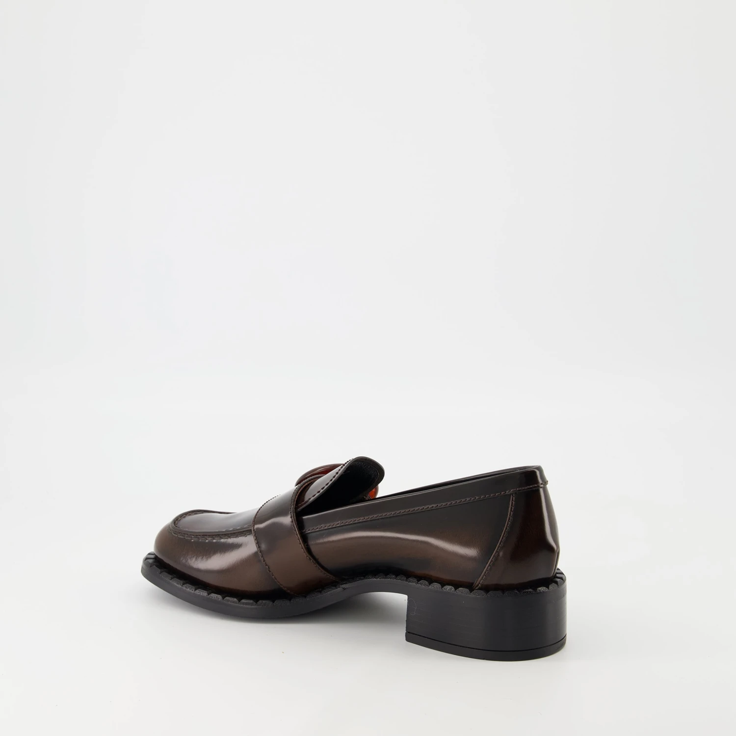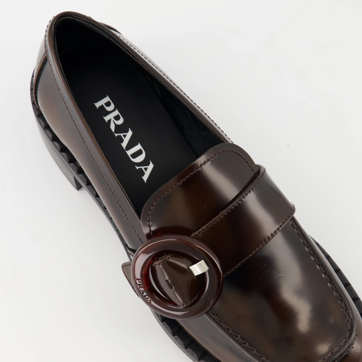 Mocassins marron en cuir brossé de Prada pour femme, collection Printemps-Été 2025. Ce modèle à enfiler présente un logo gravé et une semelle monobloc en gomme.