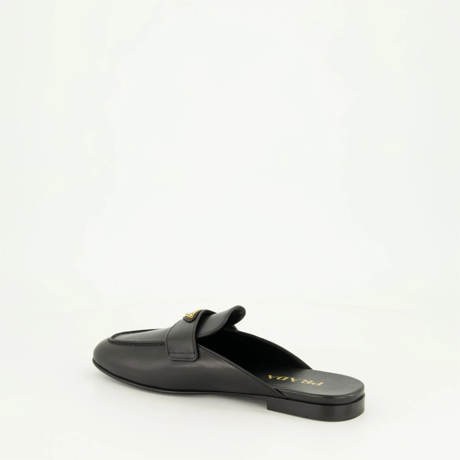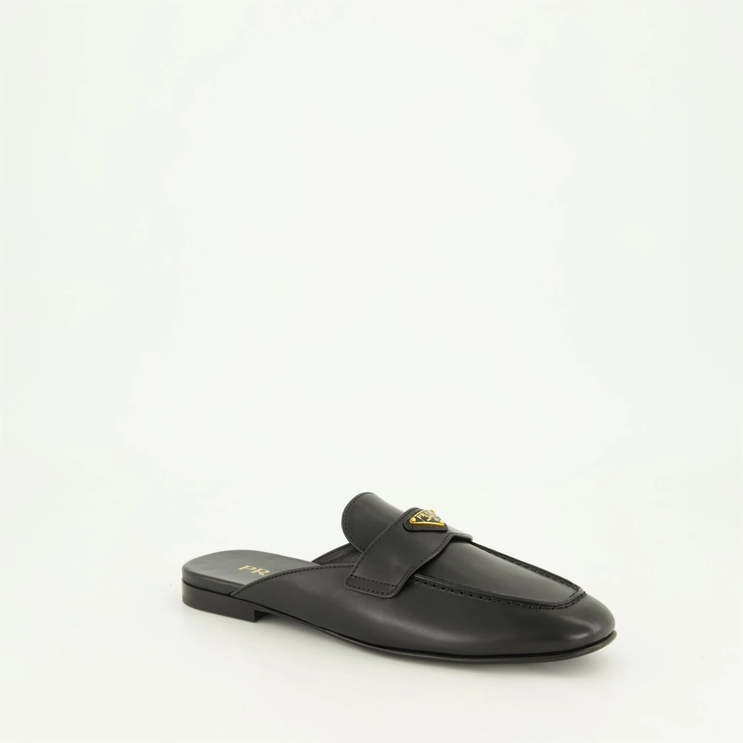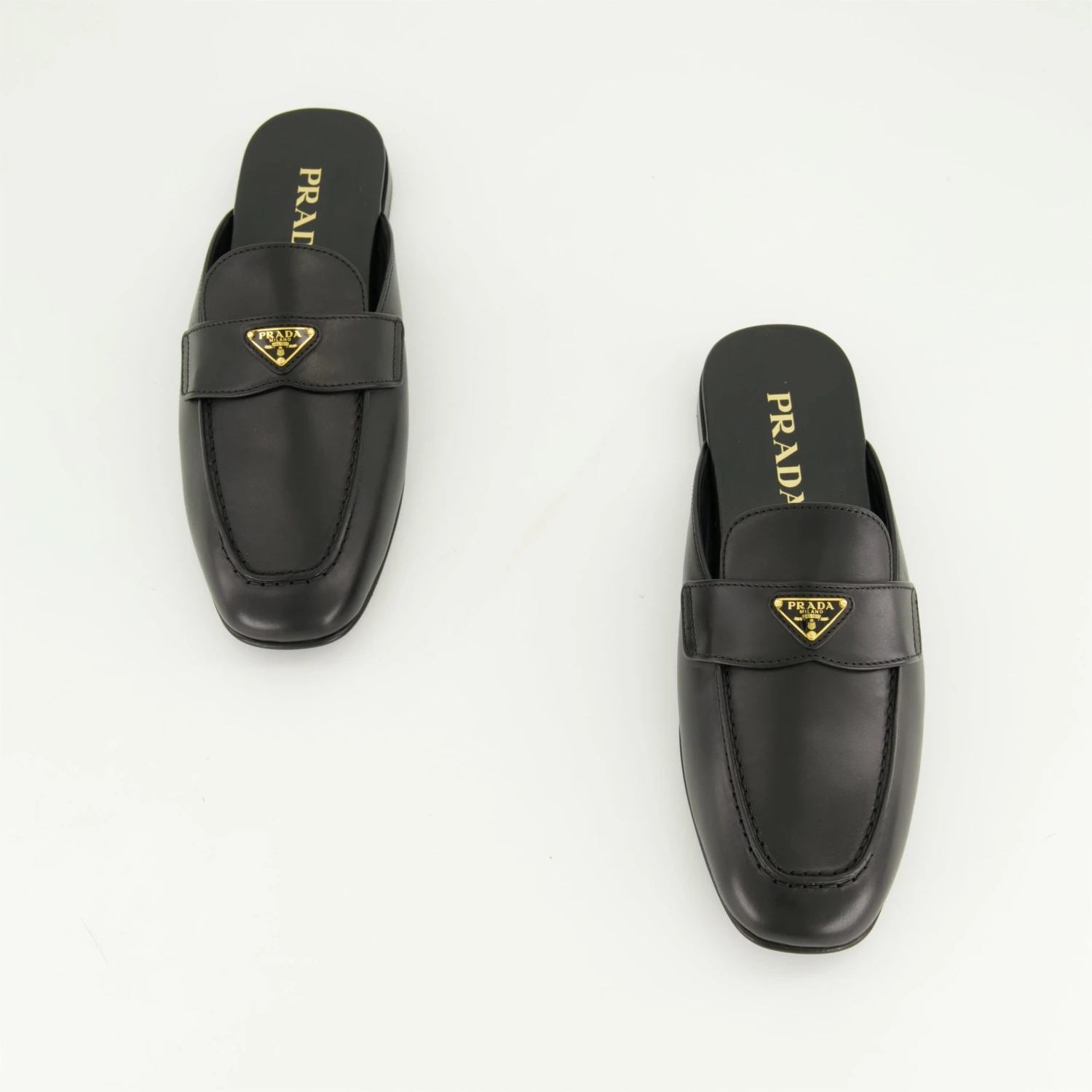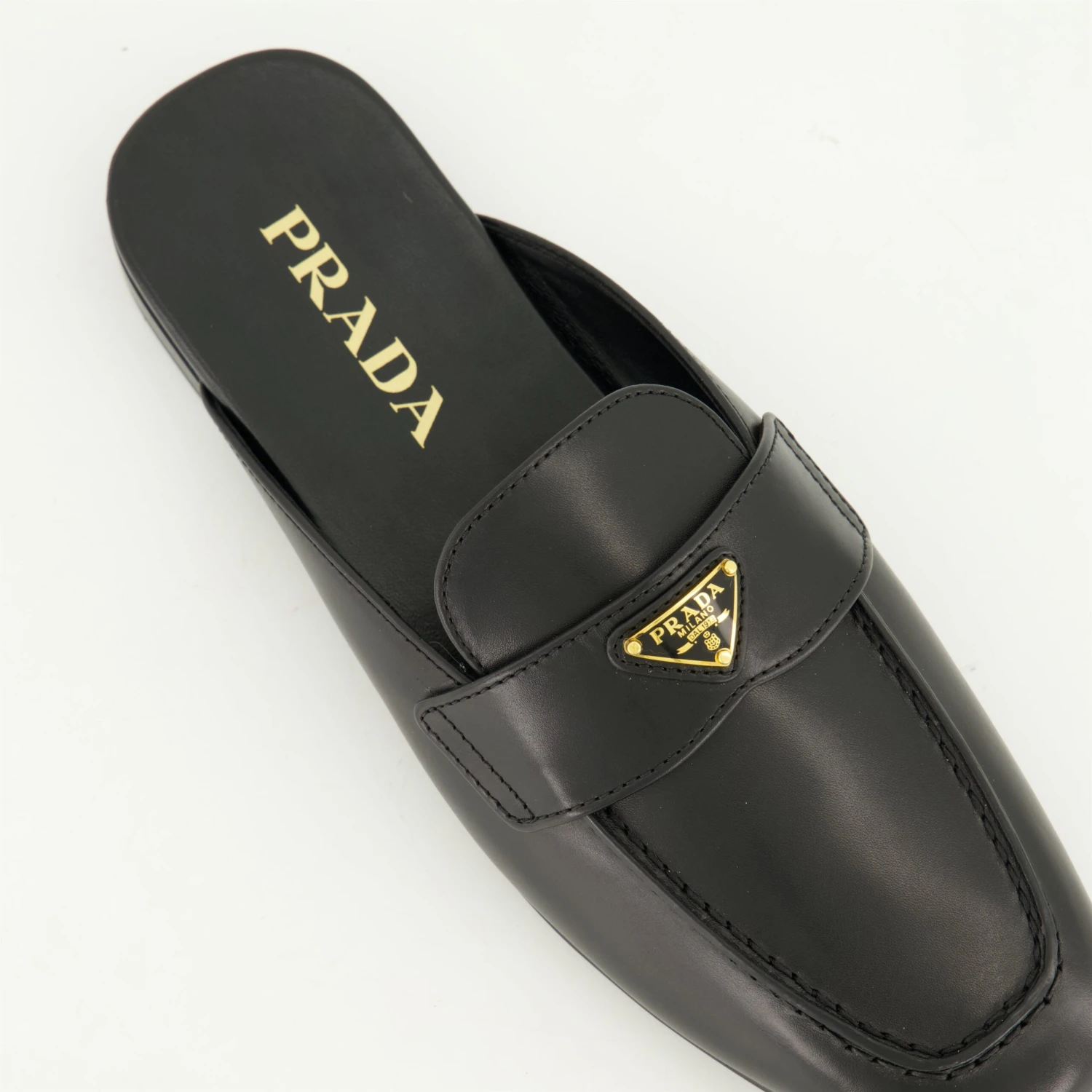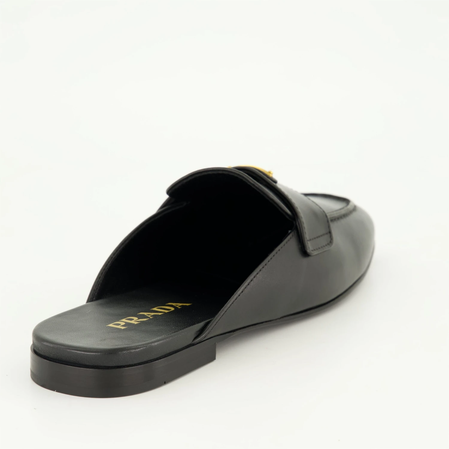 Mules en cuir noir de Prada pour femme, collection Printemps-Été 2025. Elles présentent un design à enfiler avec un bout en amande et un logo triangle en métal émaillé.