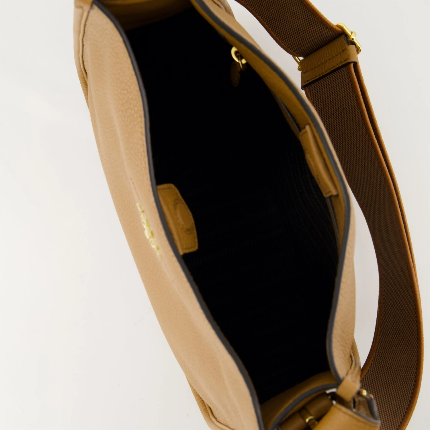 Sac Hobo en cuir camel de Prada, conçu pour les femmes. Ce modèle fait partie de la collection Printemps-Été 2025 et se distingue par ses détails raffinés et sa praticité.
