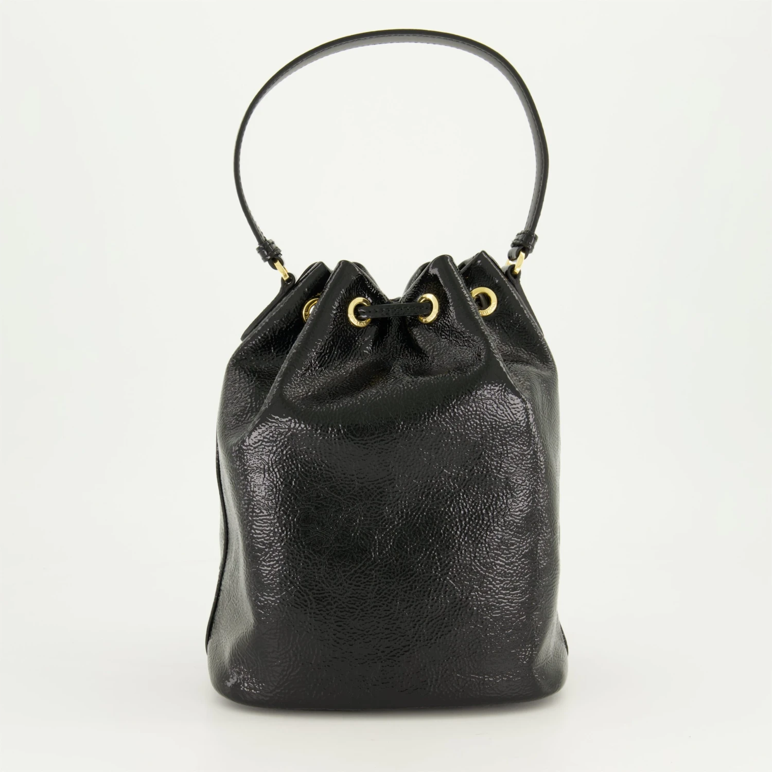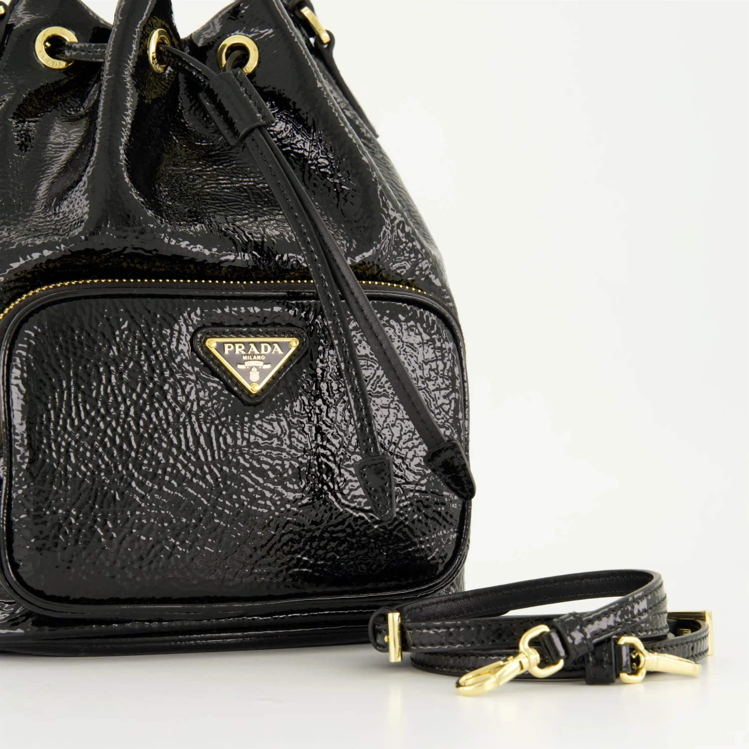 Sac seau Duet en cuir verni noir de Prada, conçu pour les femmes. Ce modèle fait partie de la collection Printemps-Été 2025 et allie élégance et praticité.