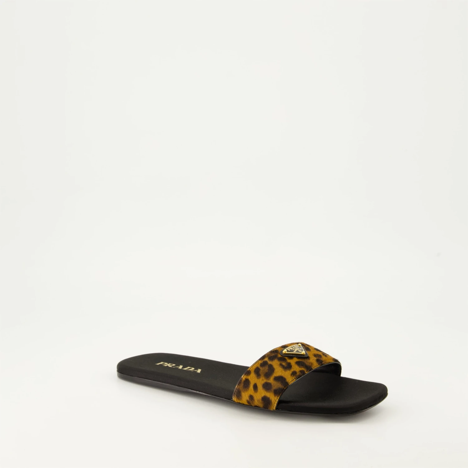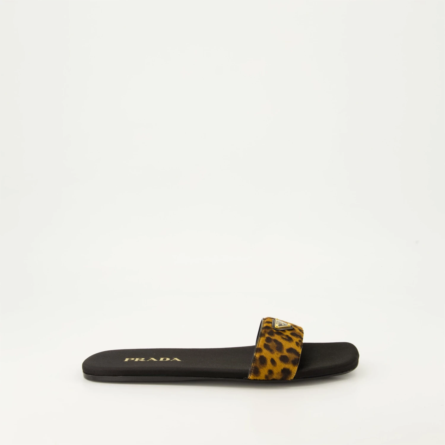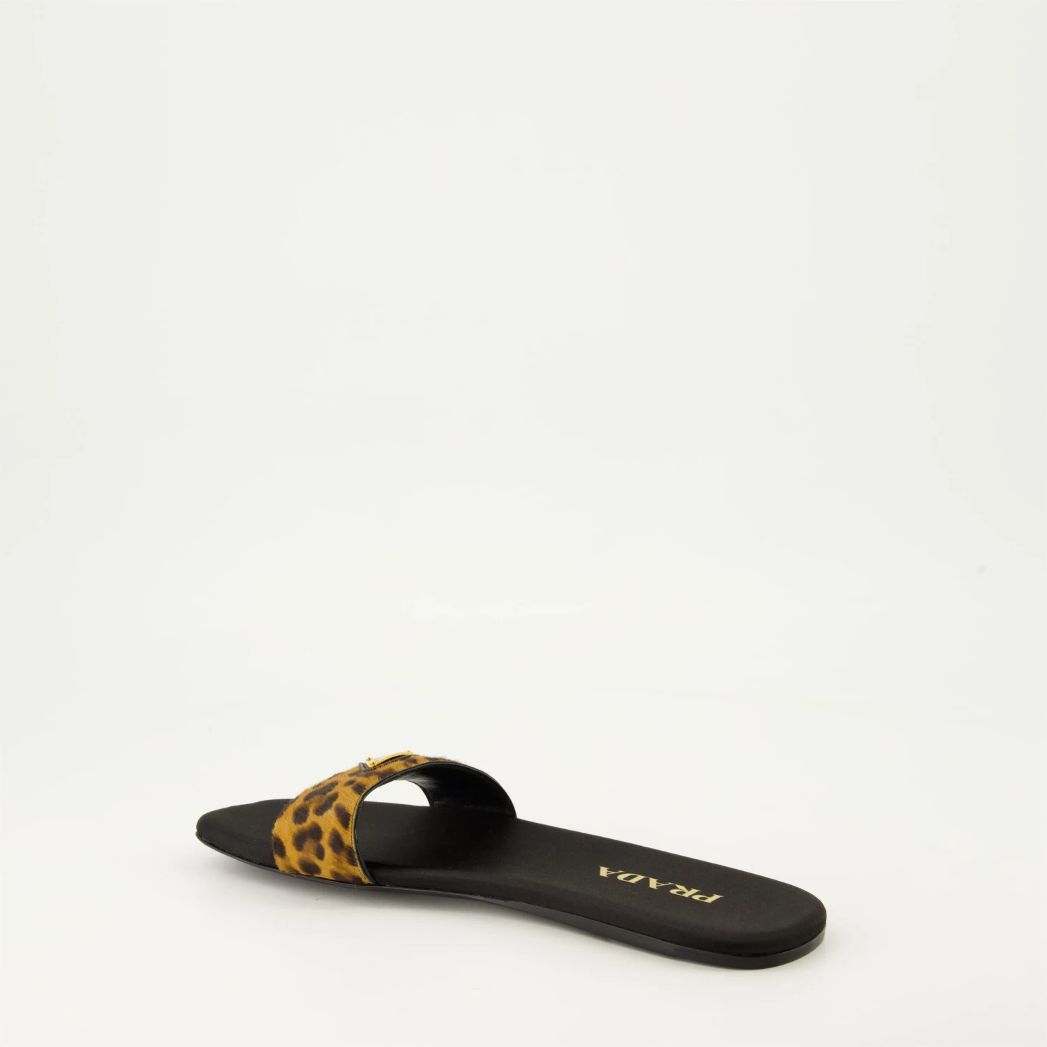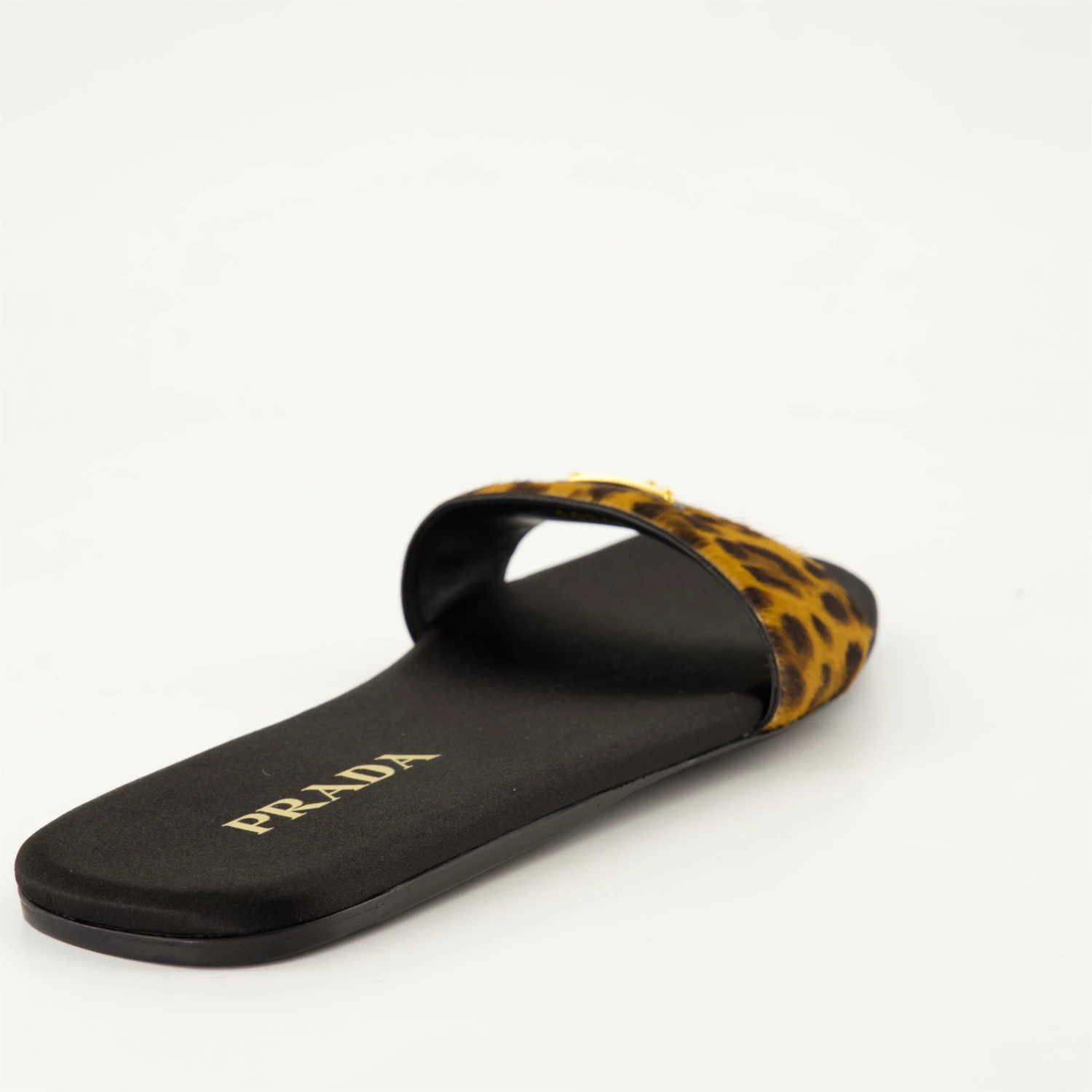 Sandales en velours Prada collection Automne-Hiver 2024 pour Femme. Réalisé en velours. Article Imprimé animalier léopard. Bout ouvert arrondi et Semelle en cuir.