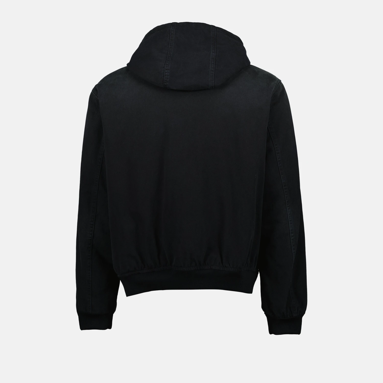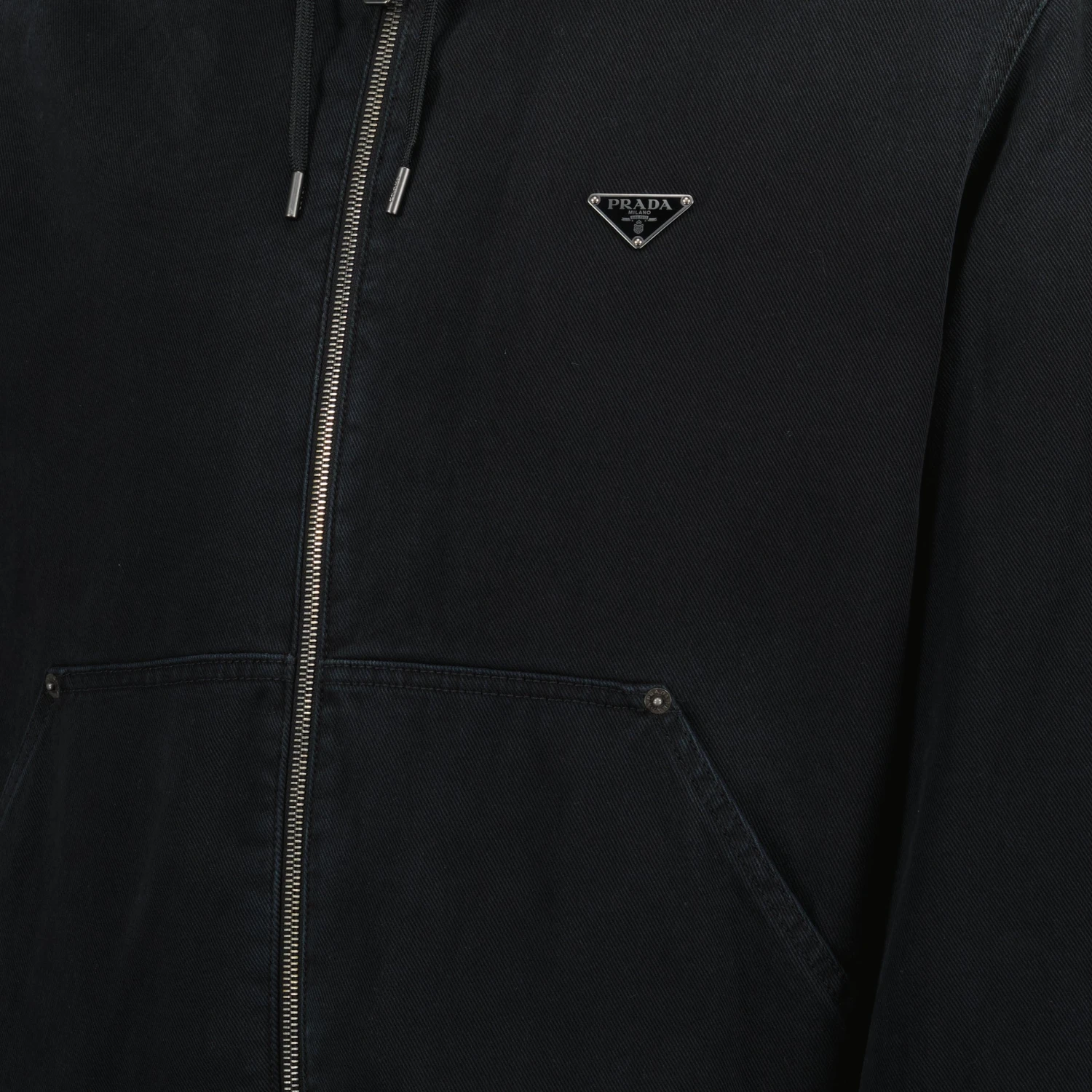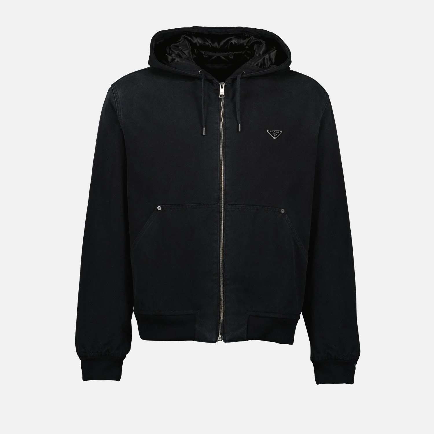 Veste à capuche noire de Prada pour homme, réalisée en coton. Elle fait partie de la collection Printemps-Été 2025 et présente un design moderne avec des détails fonctionnels.