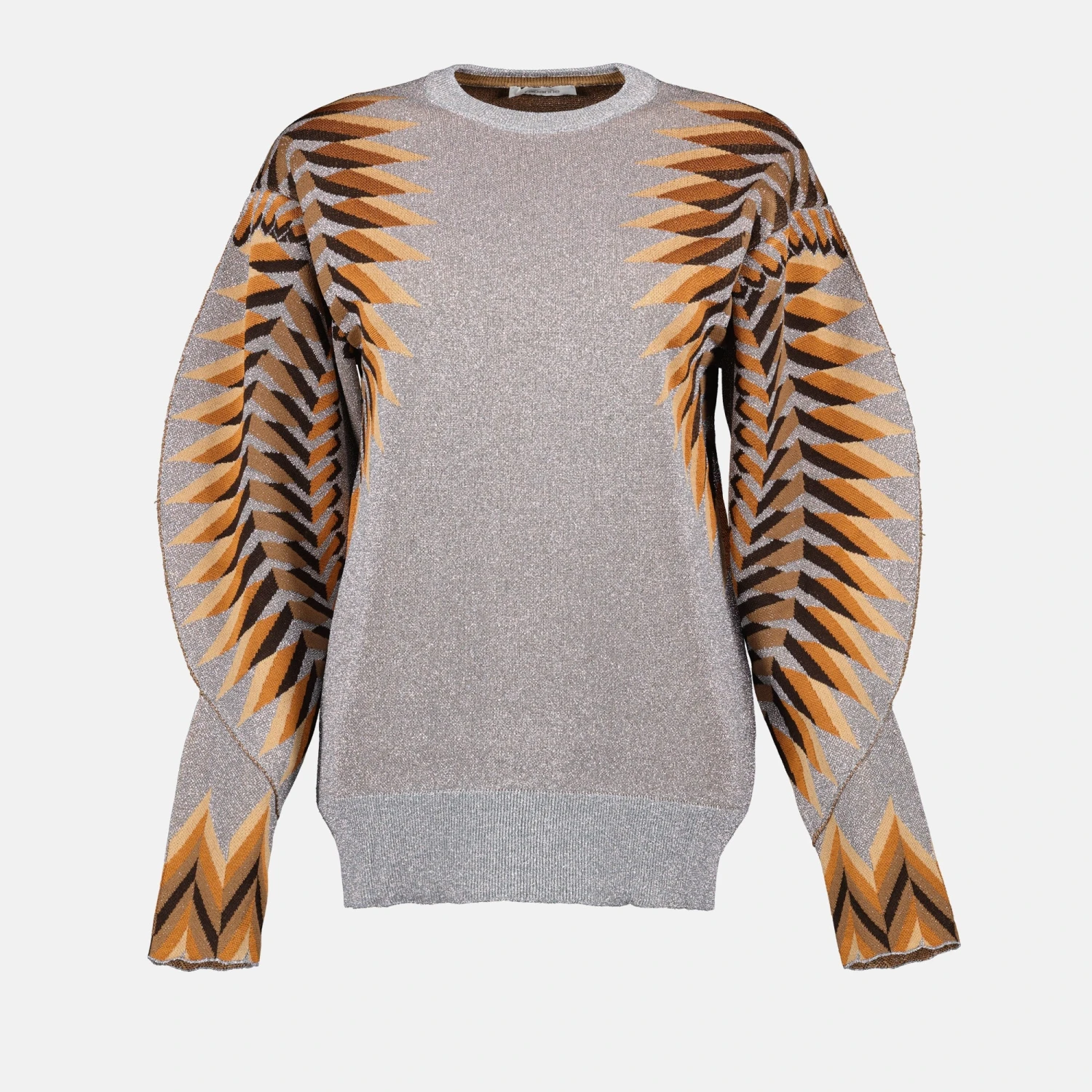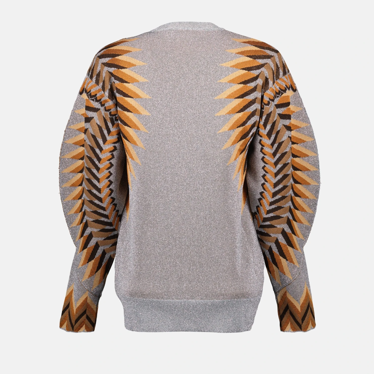 Pull en lurex Rabanne collection Automne-Hiver 2024 pour Femme. Réalisé en lurex . Article Couleur argenté. Col rond et Manches bouffantes.