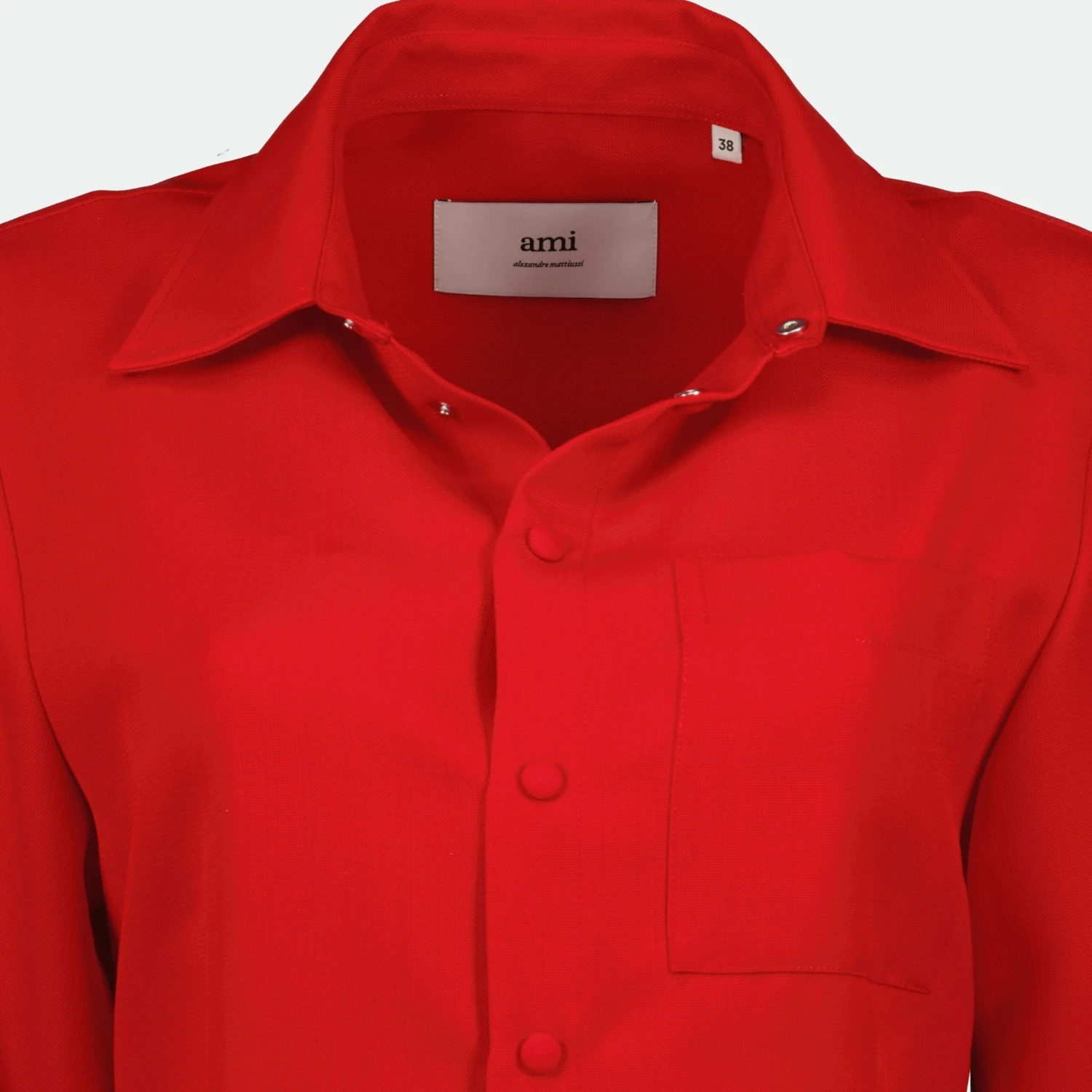 Robe chemise en laine rouge AMI Paris pour femme de la collection Printemps-Été 2025. Elle présente un col classique, des manches courtes et une coupe cintrée avec des détails élégants.