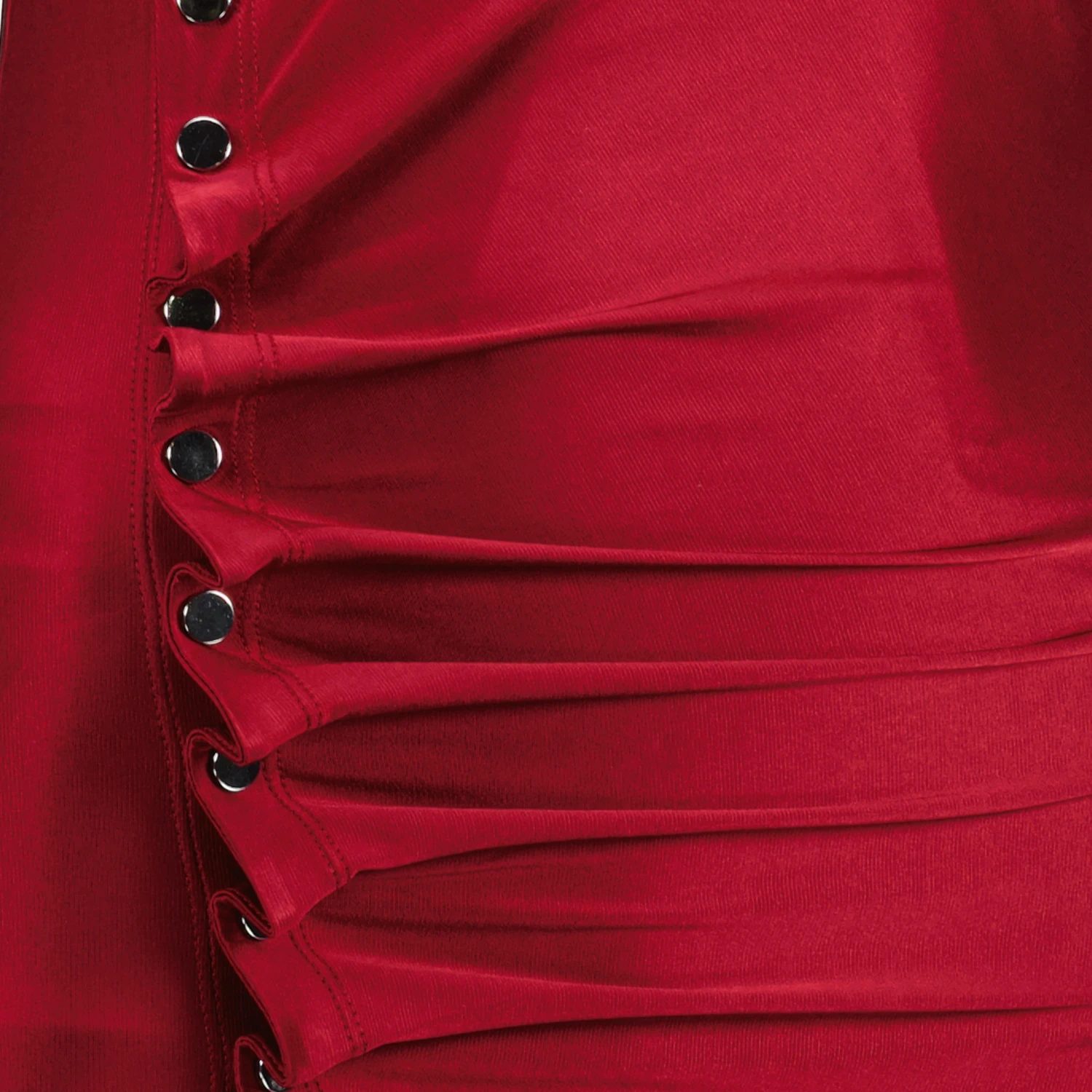 Robe drapée en lurex rouge de la marque Rabanne pour femme. Cette pièce fait partie de la collection Printemps-Été 2025 et se distingue par ses finitions argentées et son col rond.