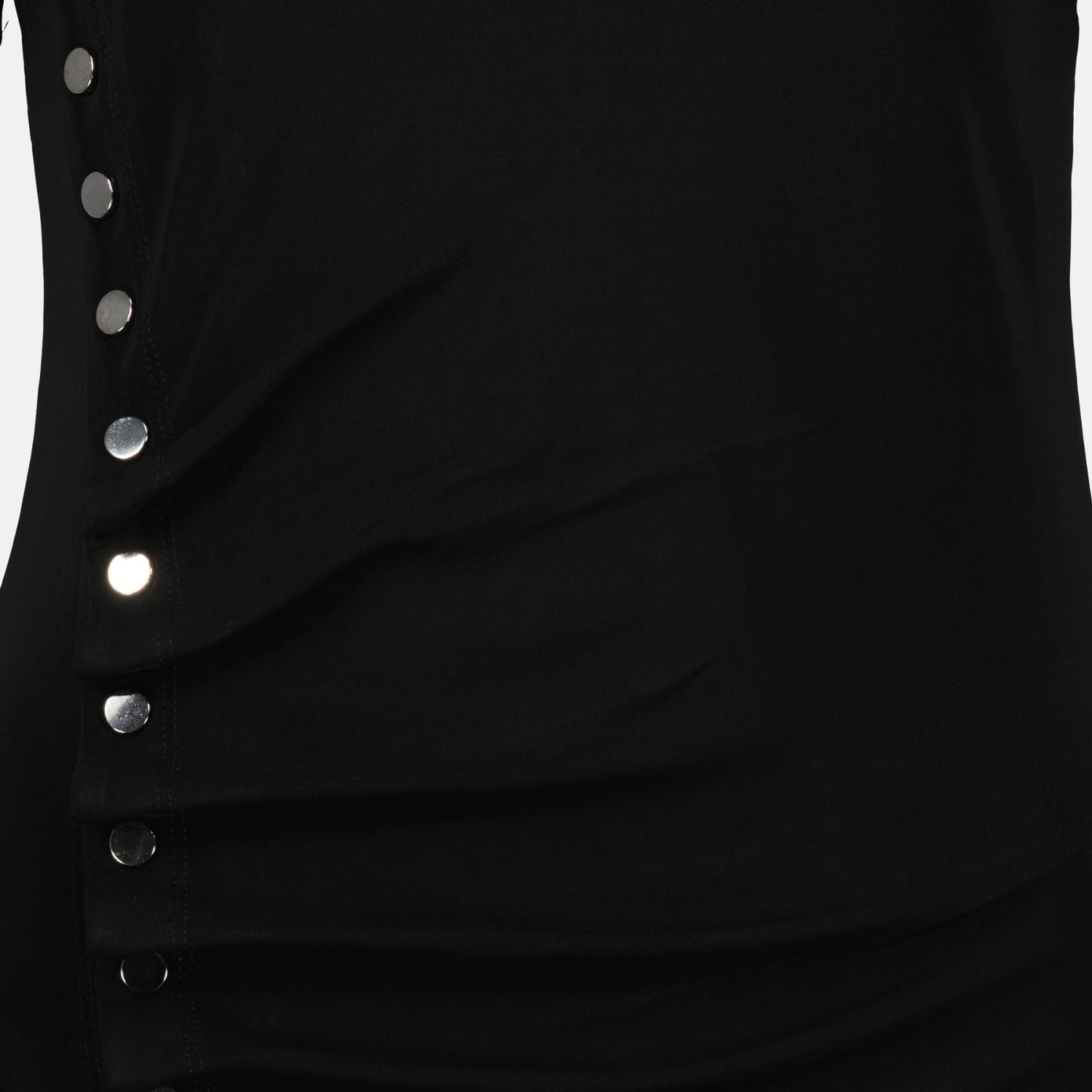 Robe drapée en viscose noir de la marque Rabanne, conçue pour les femmes. Cette pièce fait partie de la collection Automne-Hiver 2024 et présente une coupe asymétrique et un effet plissé.