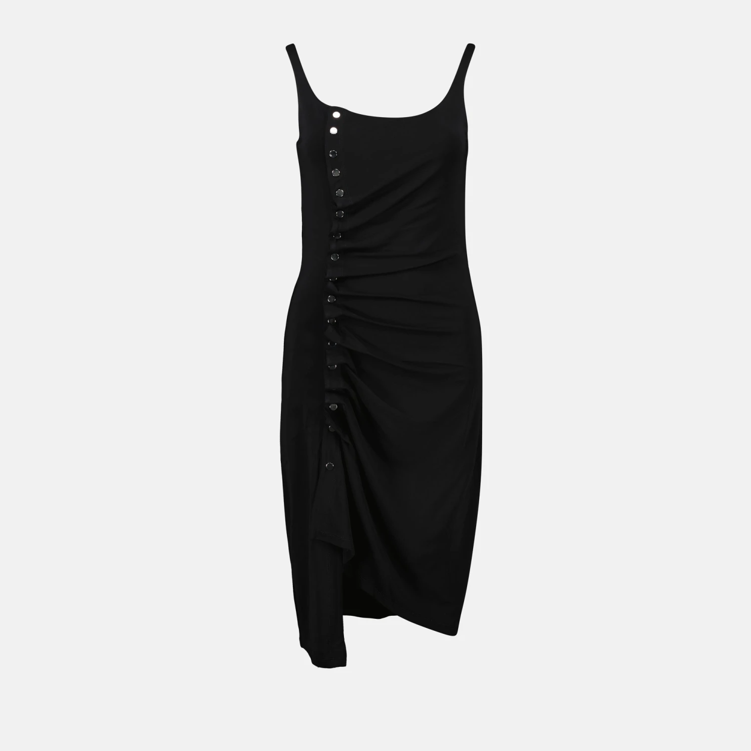 Robe drapée Rabanne collection Automne-Hiver 2024 pour Femme. Réalisé en viscose. Article Couleur noir. Encolure arrondie et Bretelles fines.