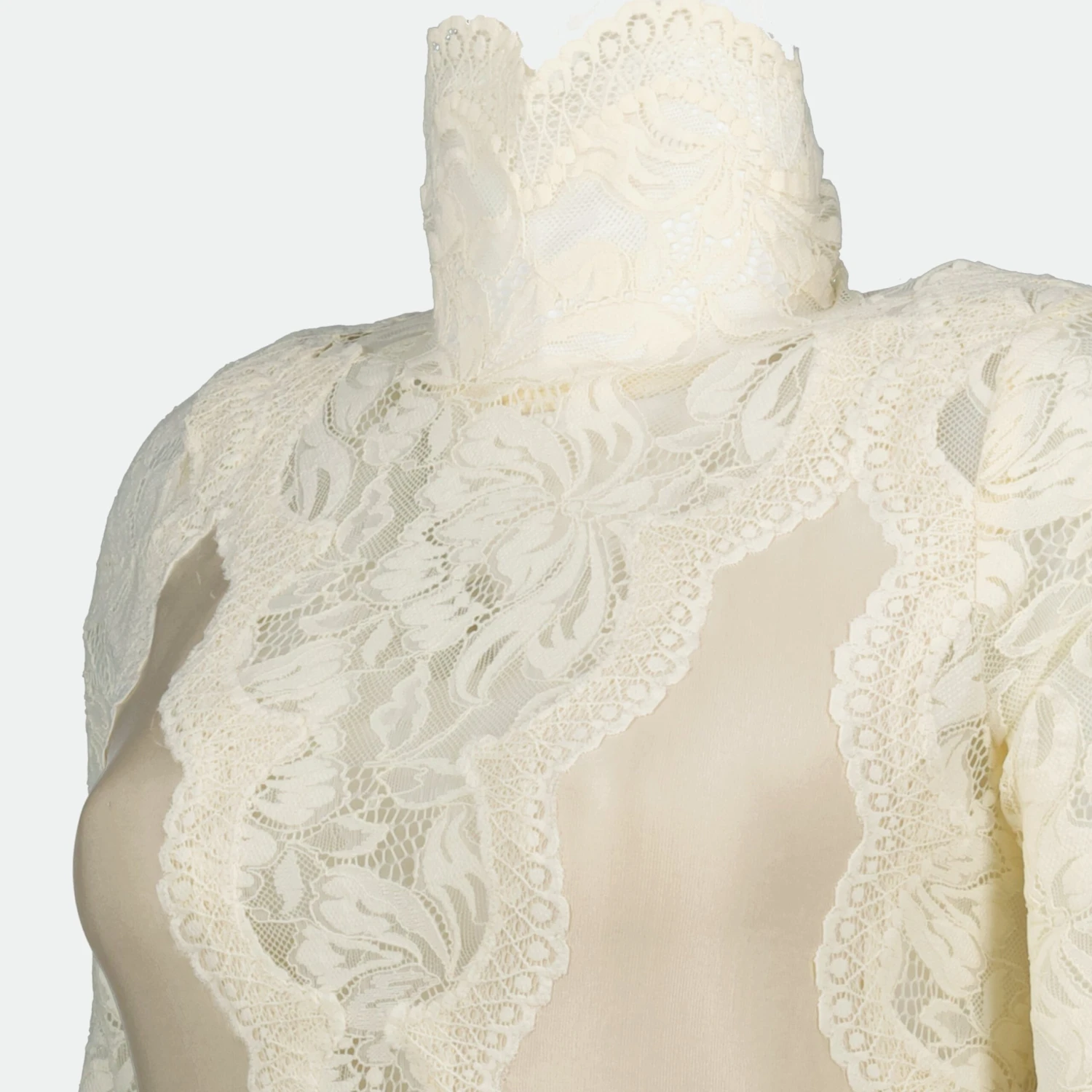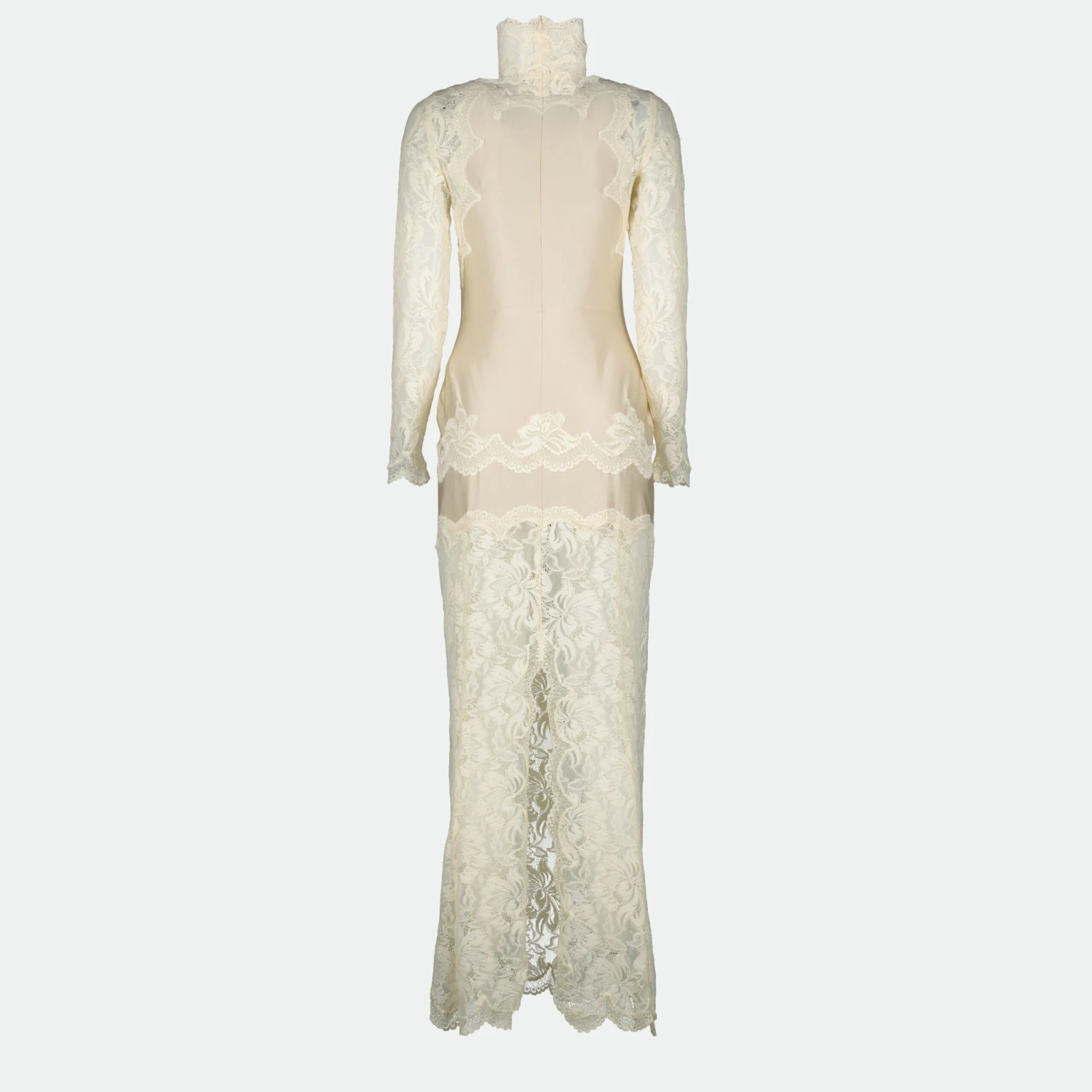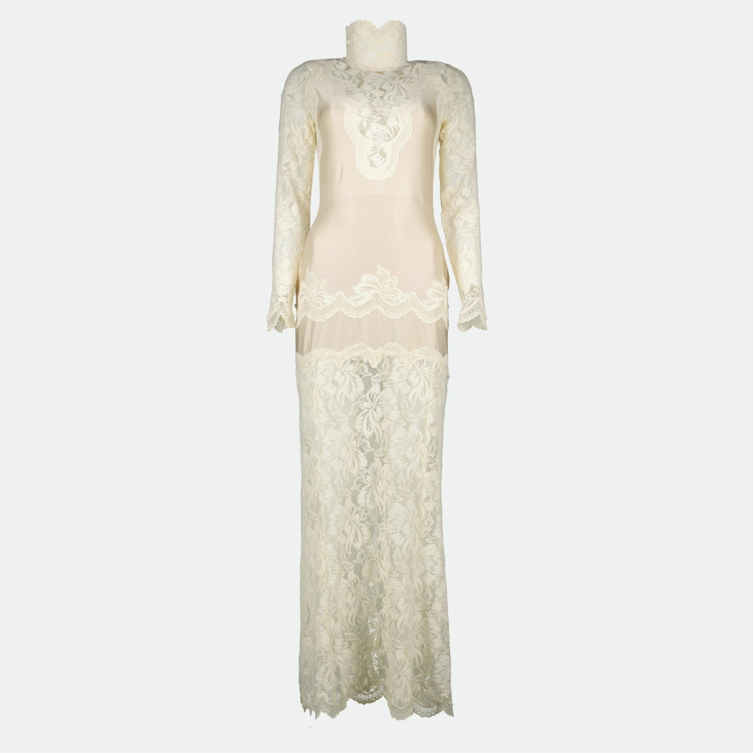 Robe longue en dentelle beige de la marque Rabanne pour femme. Cette pièce fait partie de la collection Printemps-Été 2025 et se distingue par ses finitions en dentelle brodée et son col montant.