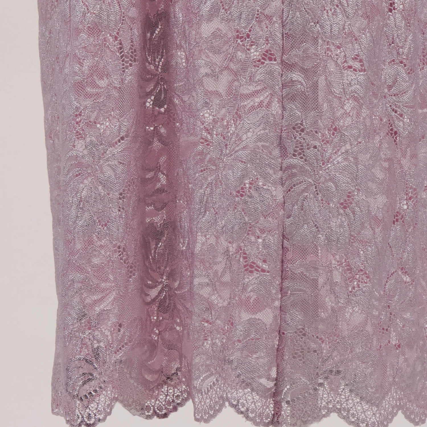 Robe rose en dentelle argentée de la marque Rabanne, conçue pour les femmes. Elle fait partie de la collection Printemps-Été 2025, avec un col bateau et des bords festonnés.