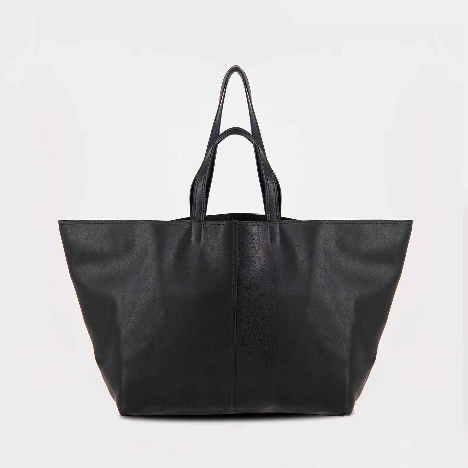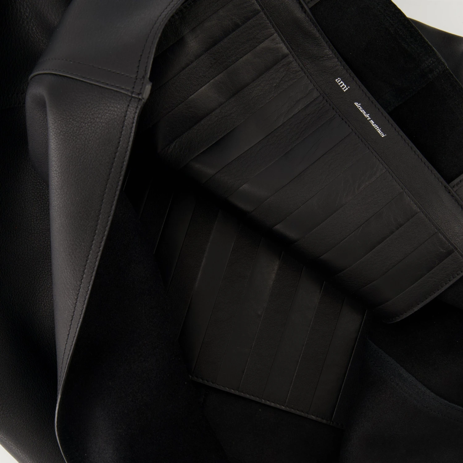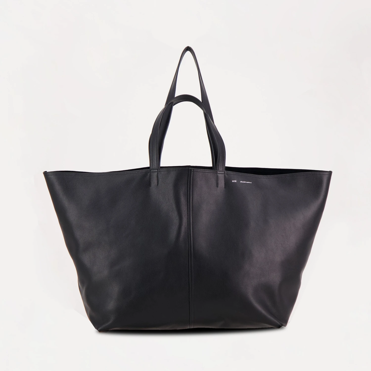 Sac cabas maxi noir de AMI Paris, un modèle unisexe réalisé en cuir de vache. Cette pièce fait partie de la collection Printemps-Été 2025 et présente un design élégant et pratique.