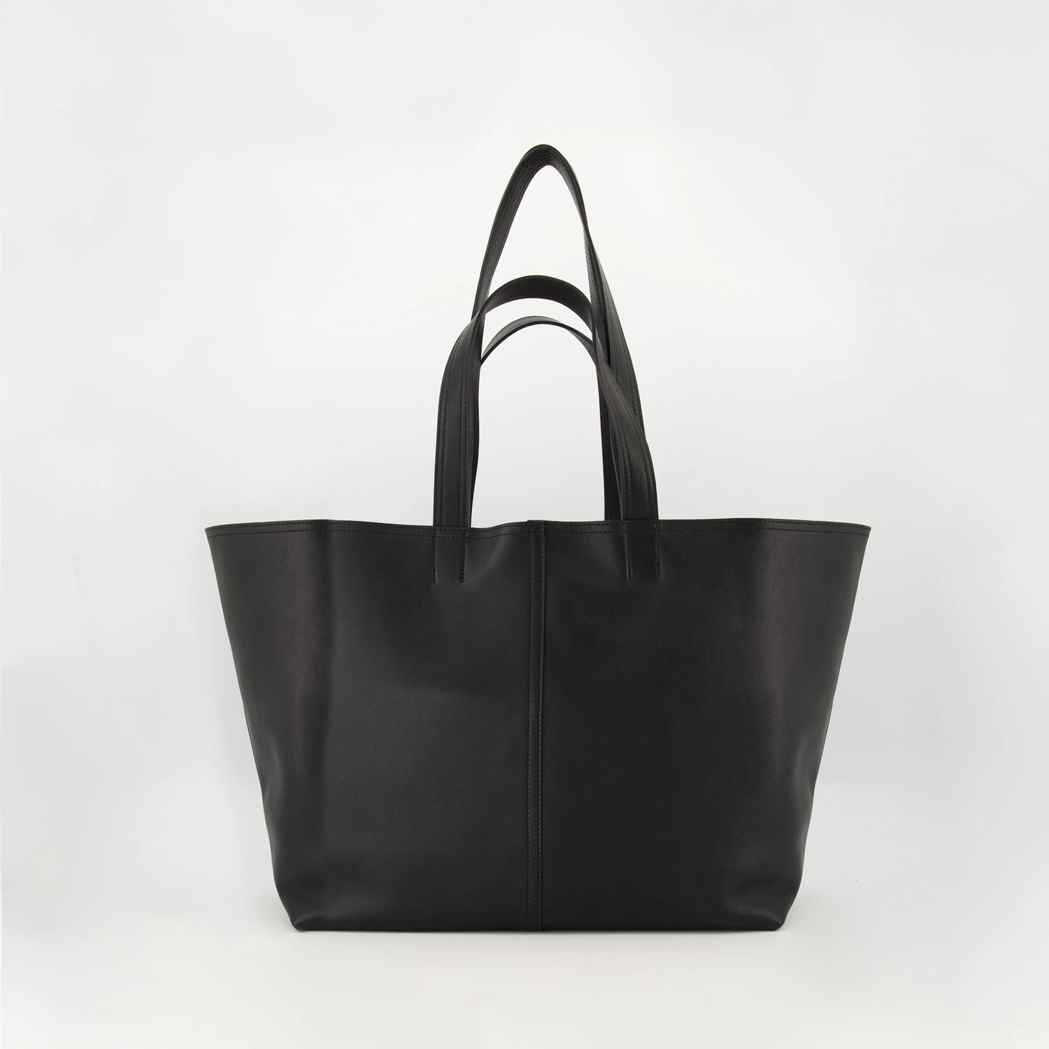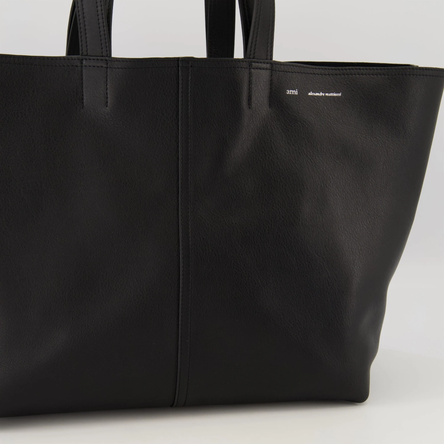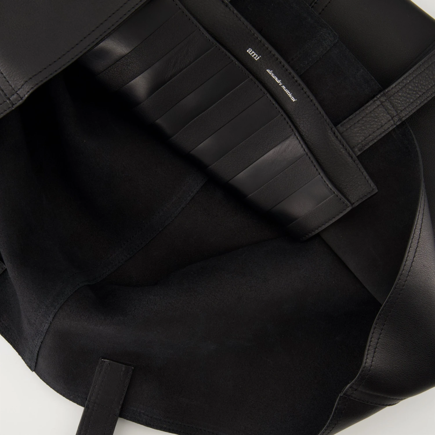 Sac cabas noir AMI Paris, en cuir de vache, est un modèle unisexe de la collection Printemps-Été 2025. Il présente un design sans fermeture et des détails raffinés avec une métallerie argent vibré.
